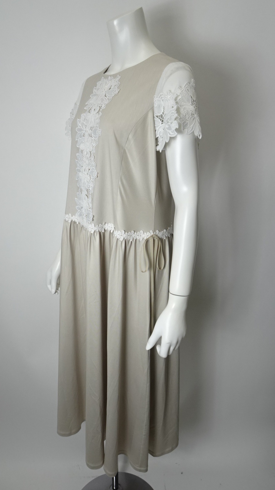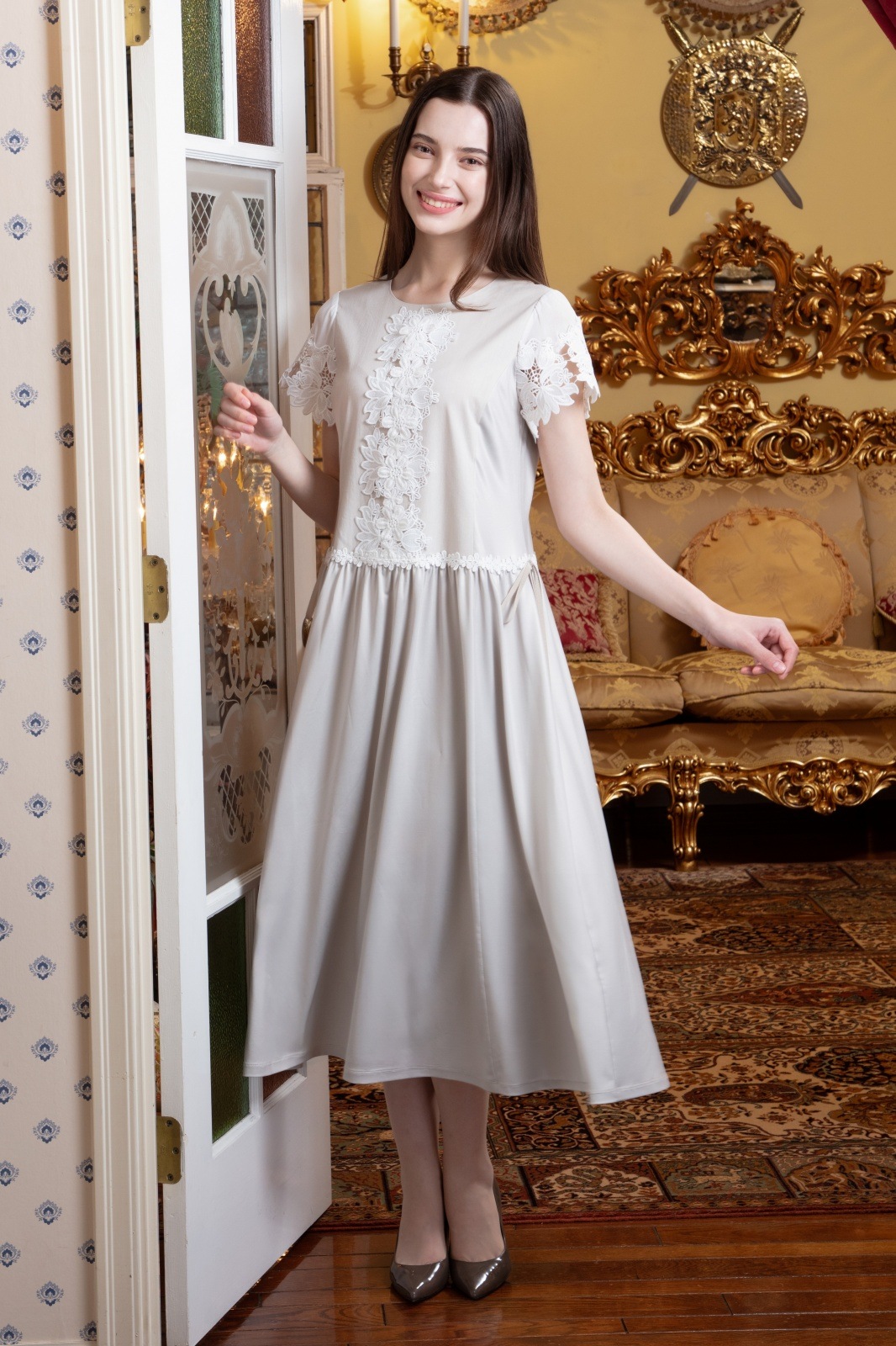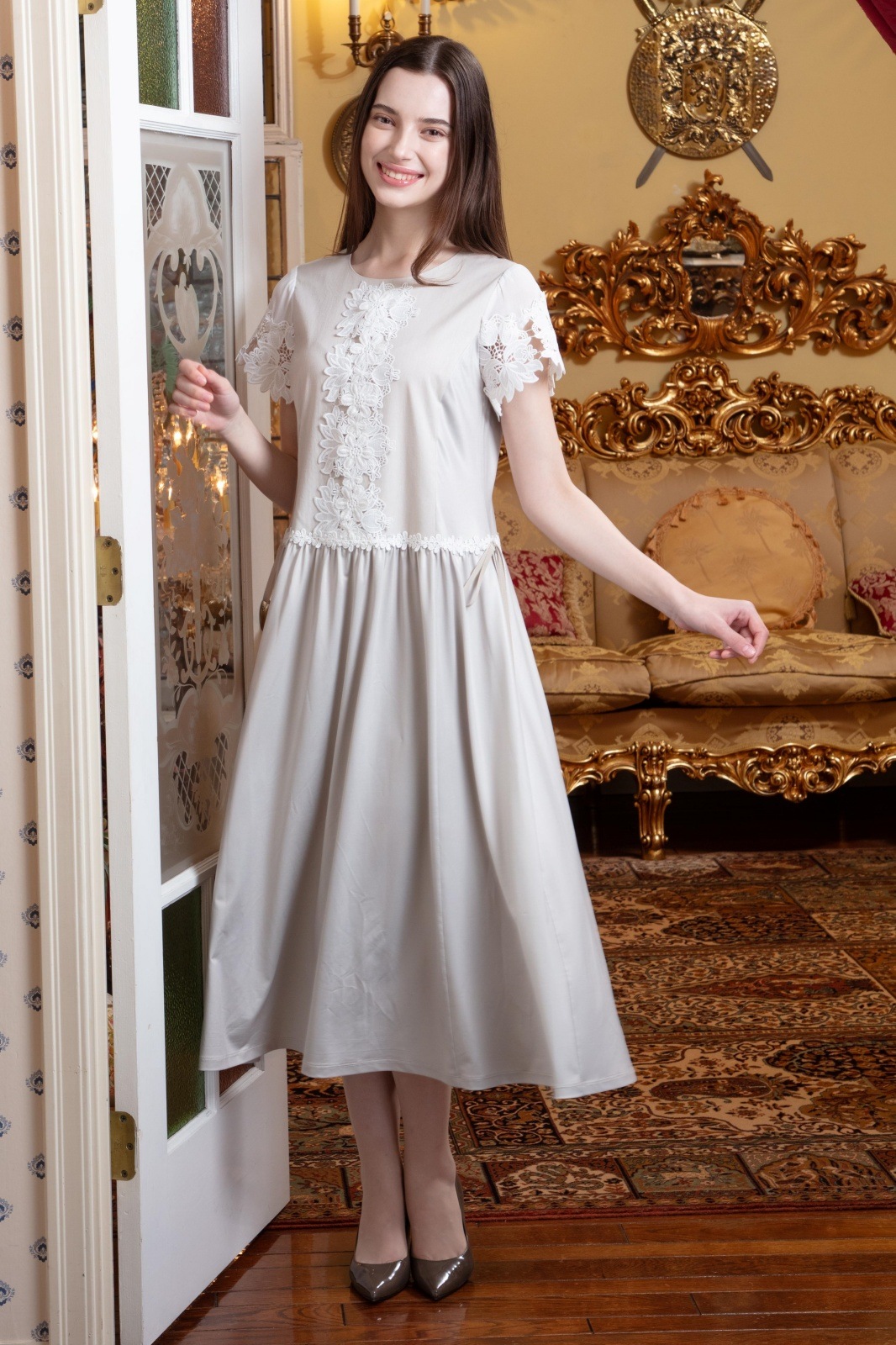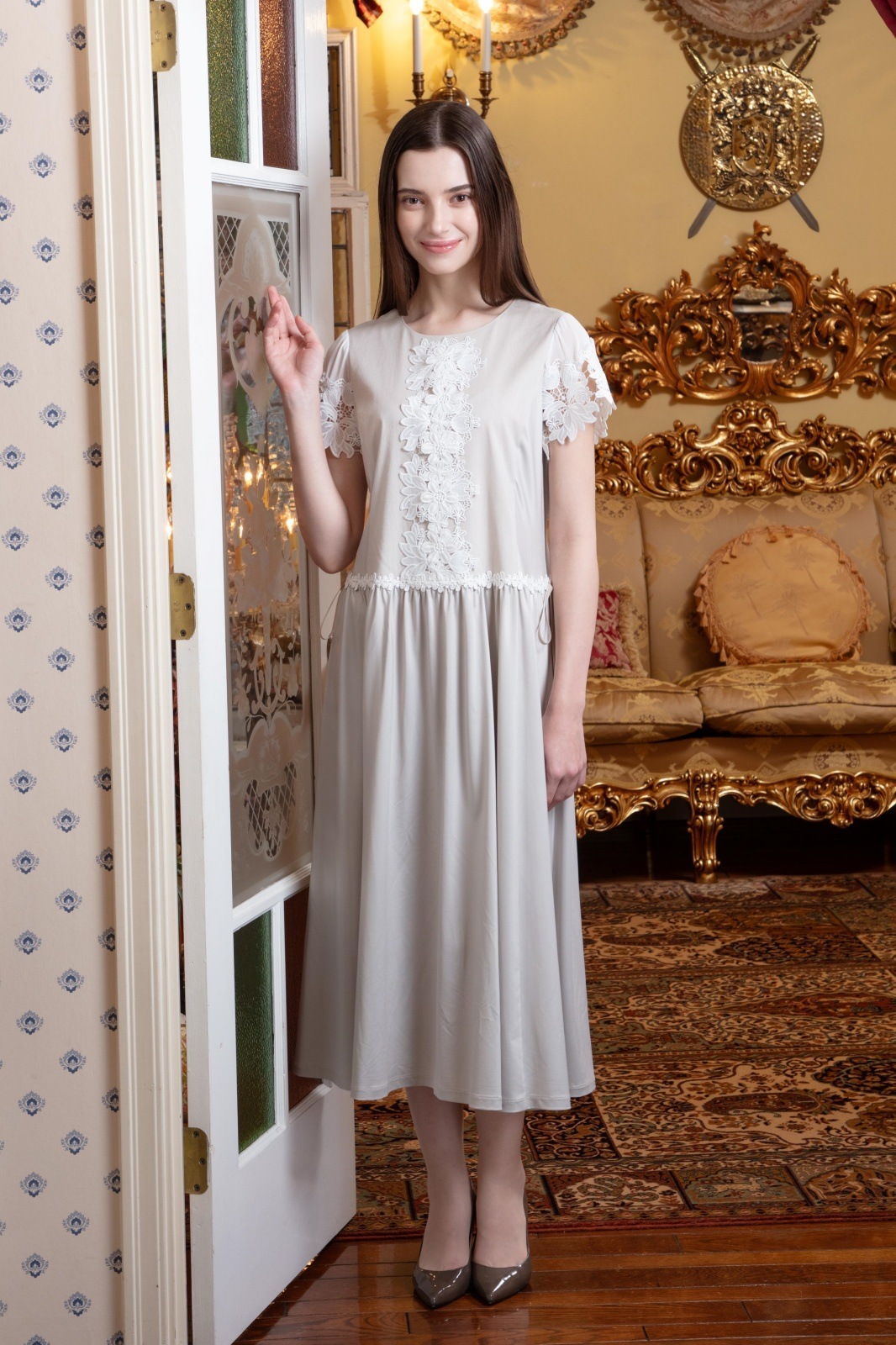 袖レースが施されたこのワンピースは、柔らかな素材感で肌に優しく、動くたびに揺れる美しいシルエットが魅力的です。また、ウェストギャザーデザインにより、スタイルアップ効果も期待でき、あなたの美しさを引き立てます。