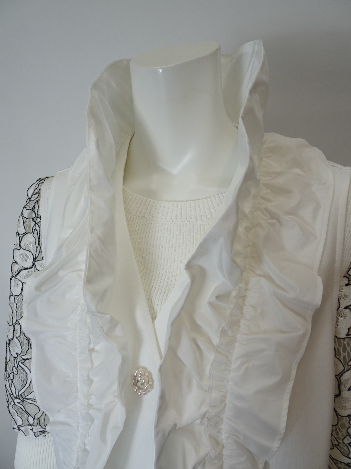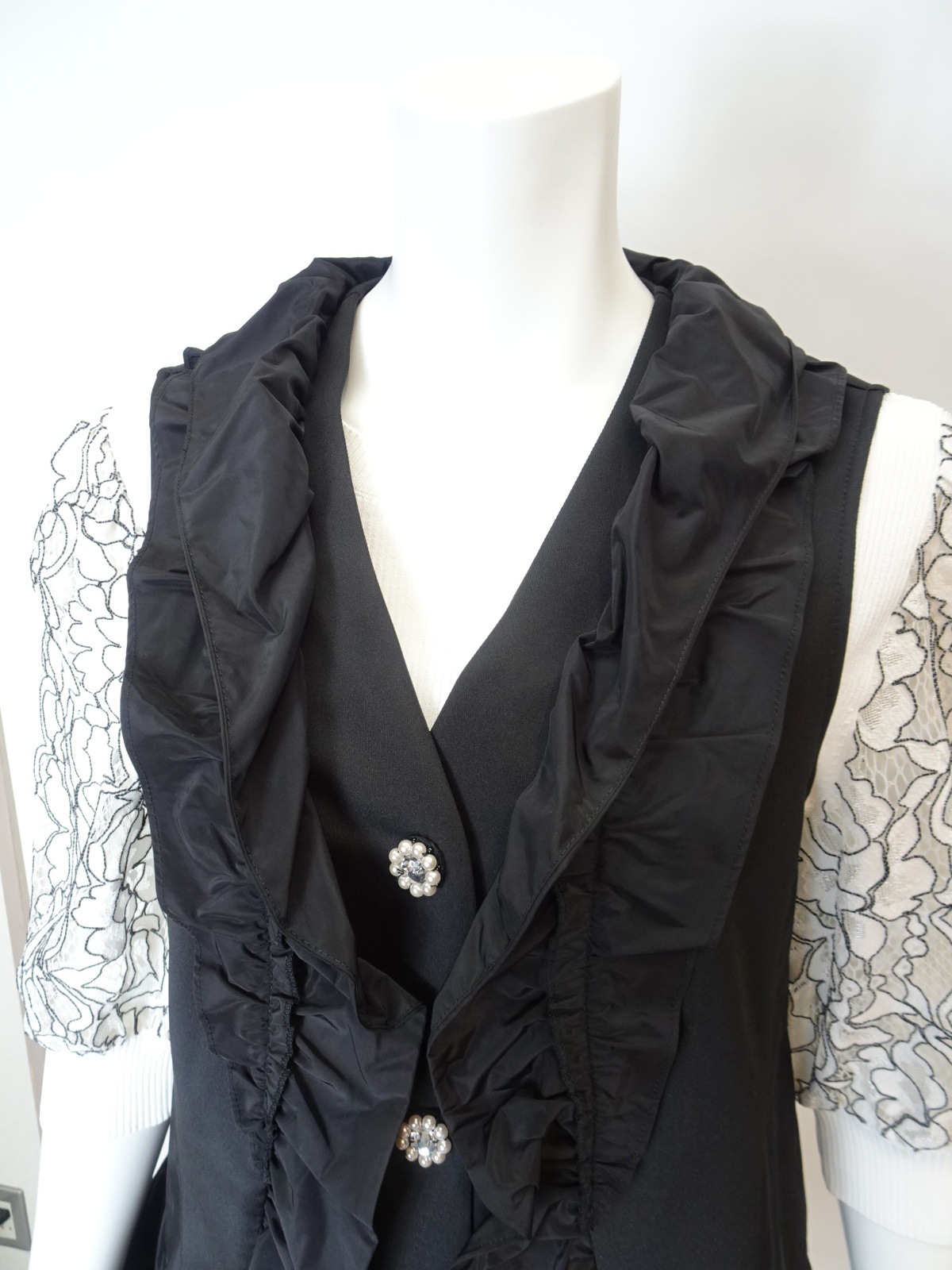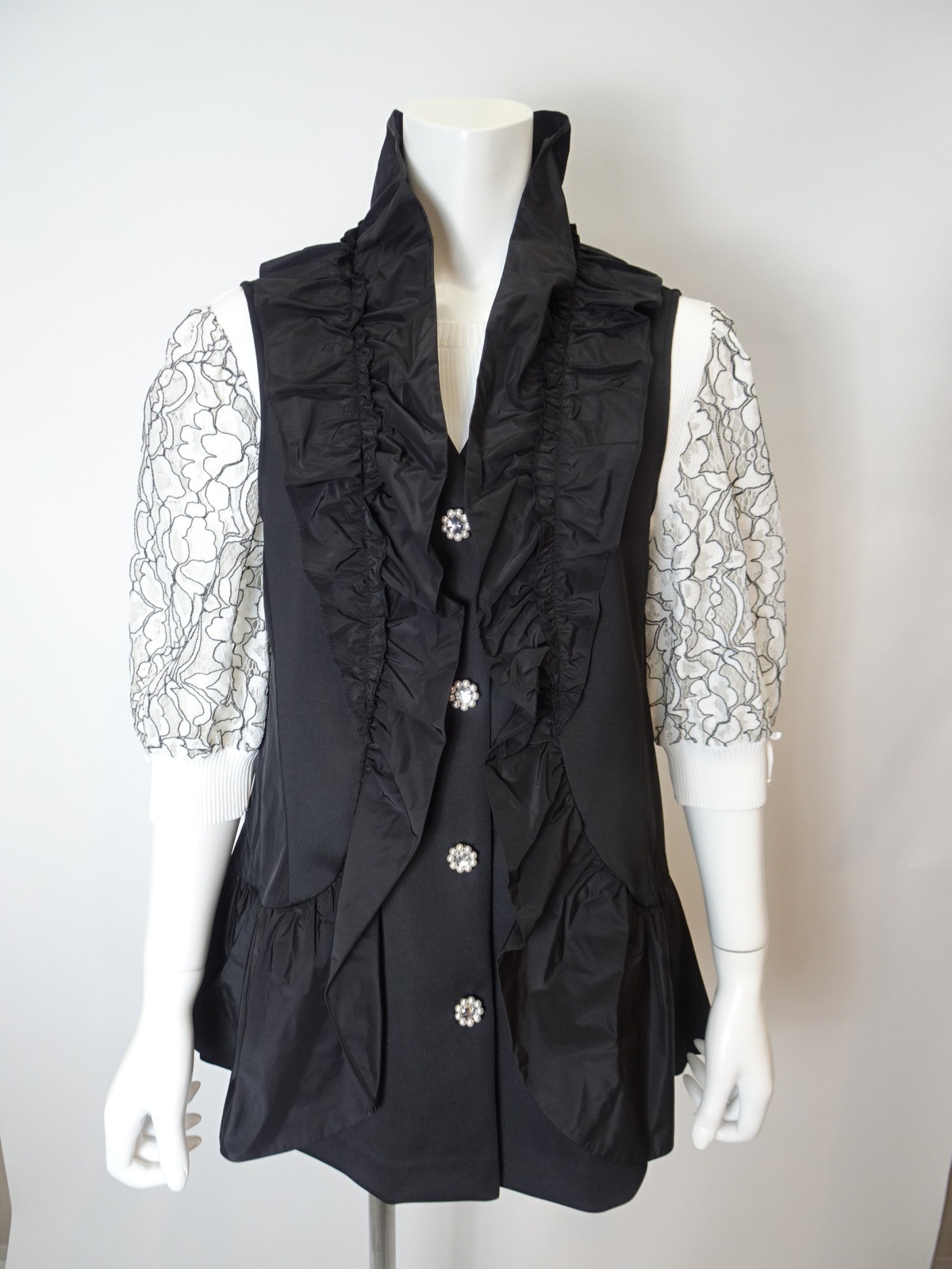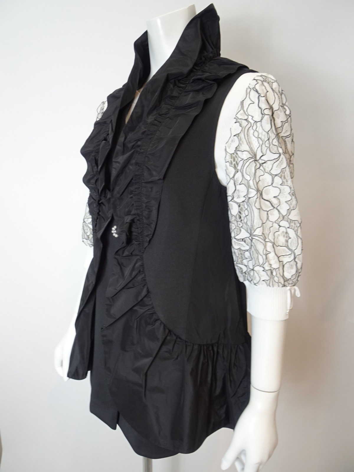 フリル切替 ダンボールニット素材ベストは、スタイリッシュでありながら快適な着心地を提供します。タフタ素材のフリルが施され、シンプルなデザインに華やかさを加えています。この一枚を重ねるだけで、洗練された印象を演出できるアイテムです。