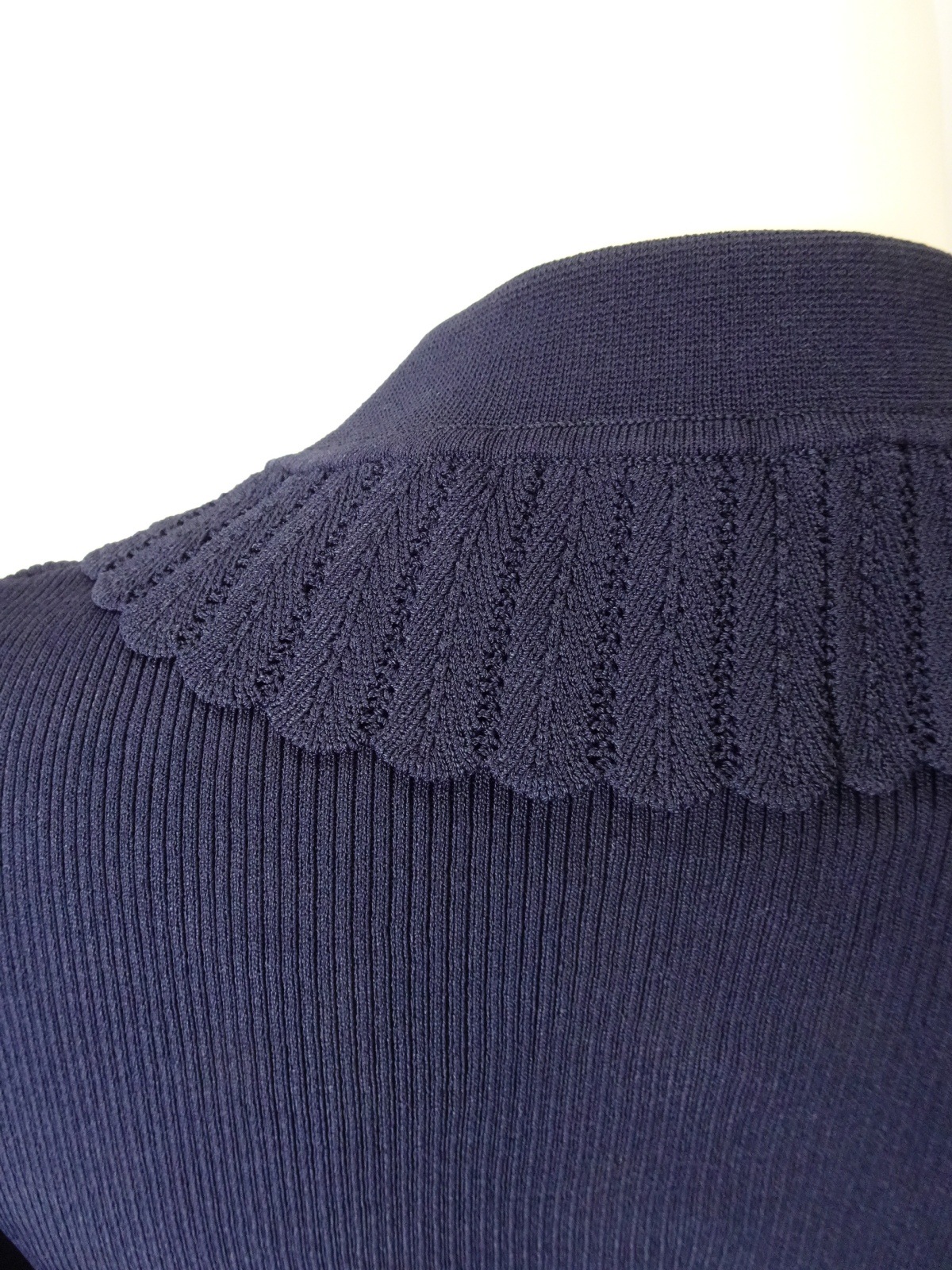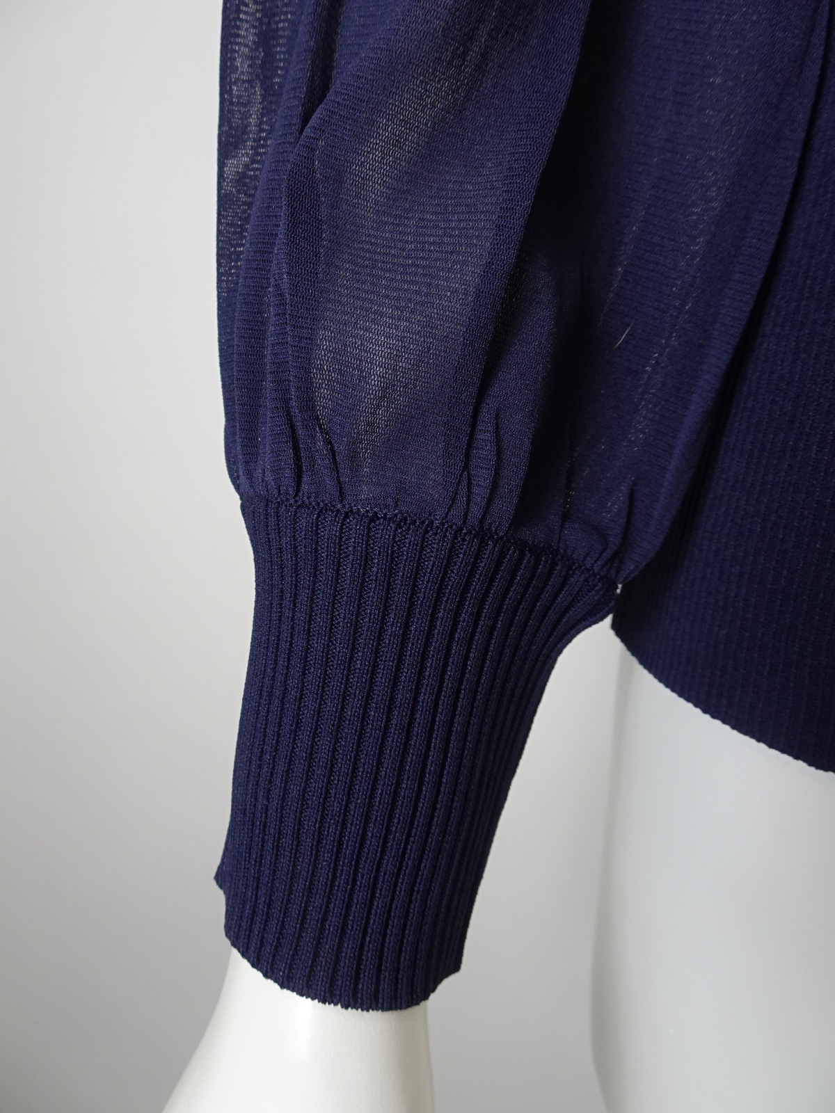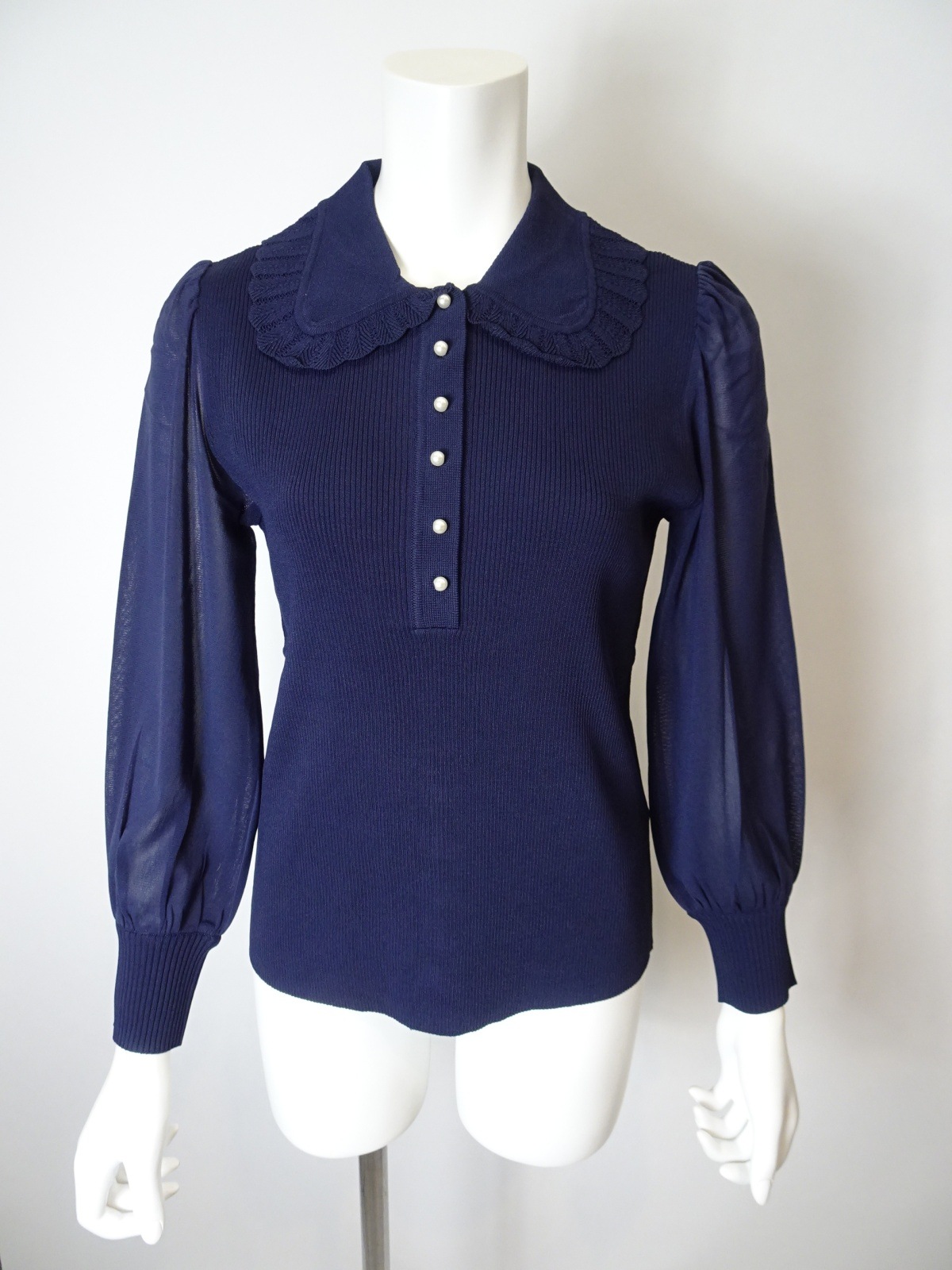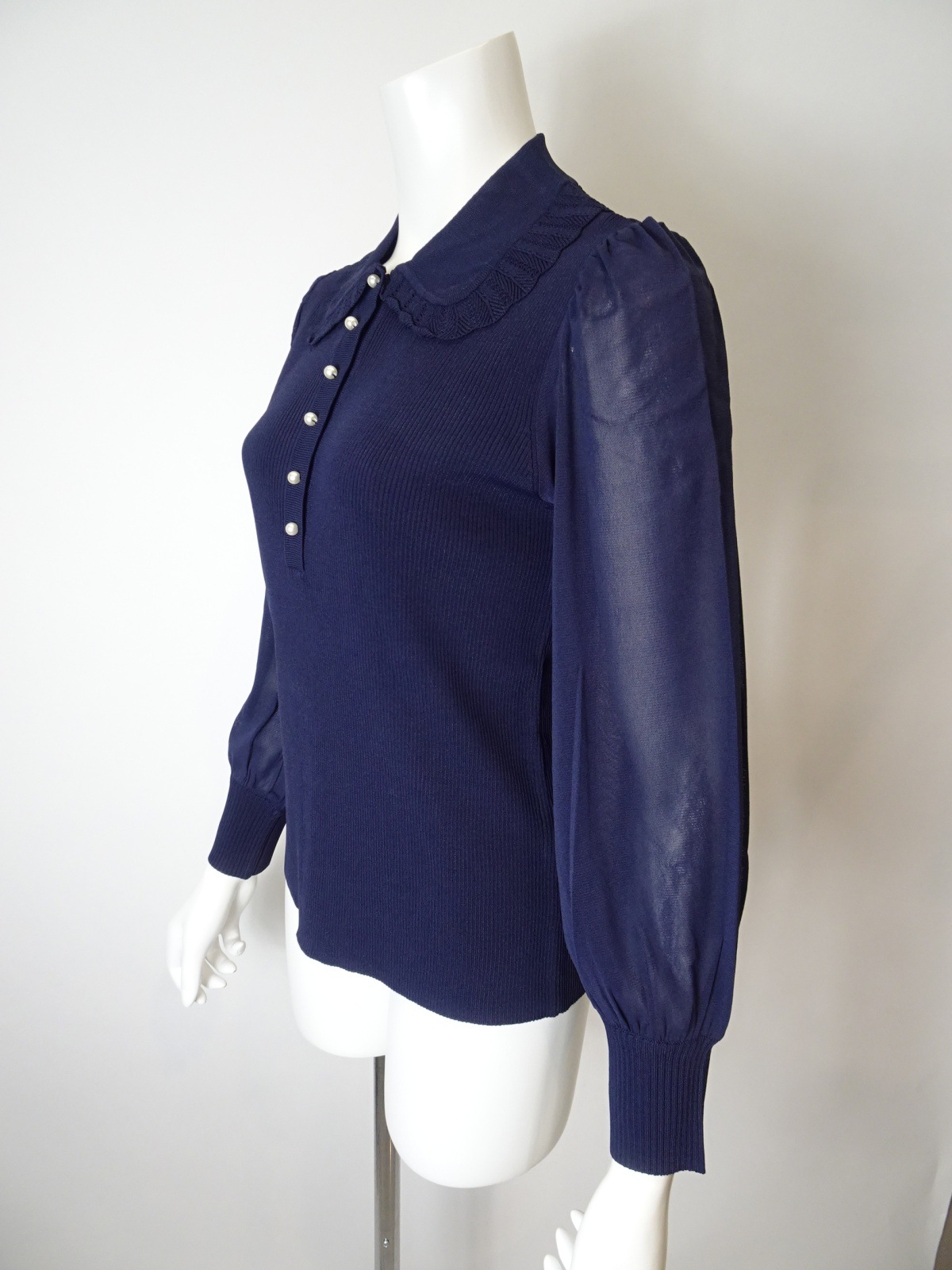 袖パワーネット素材の襟付きニットは身頃部分はリブ編みで仕立てられ、フィット感を高めつつも、柔らかな印象を与えます。
