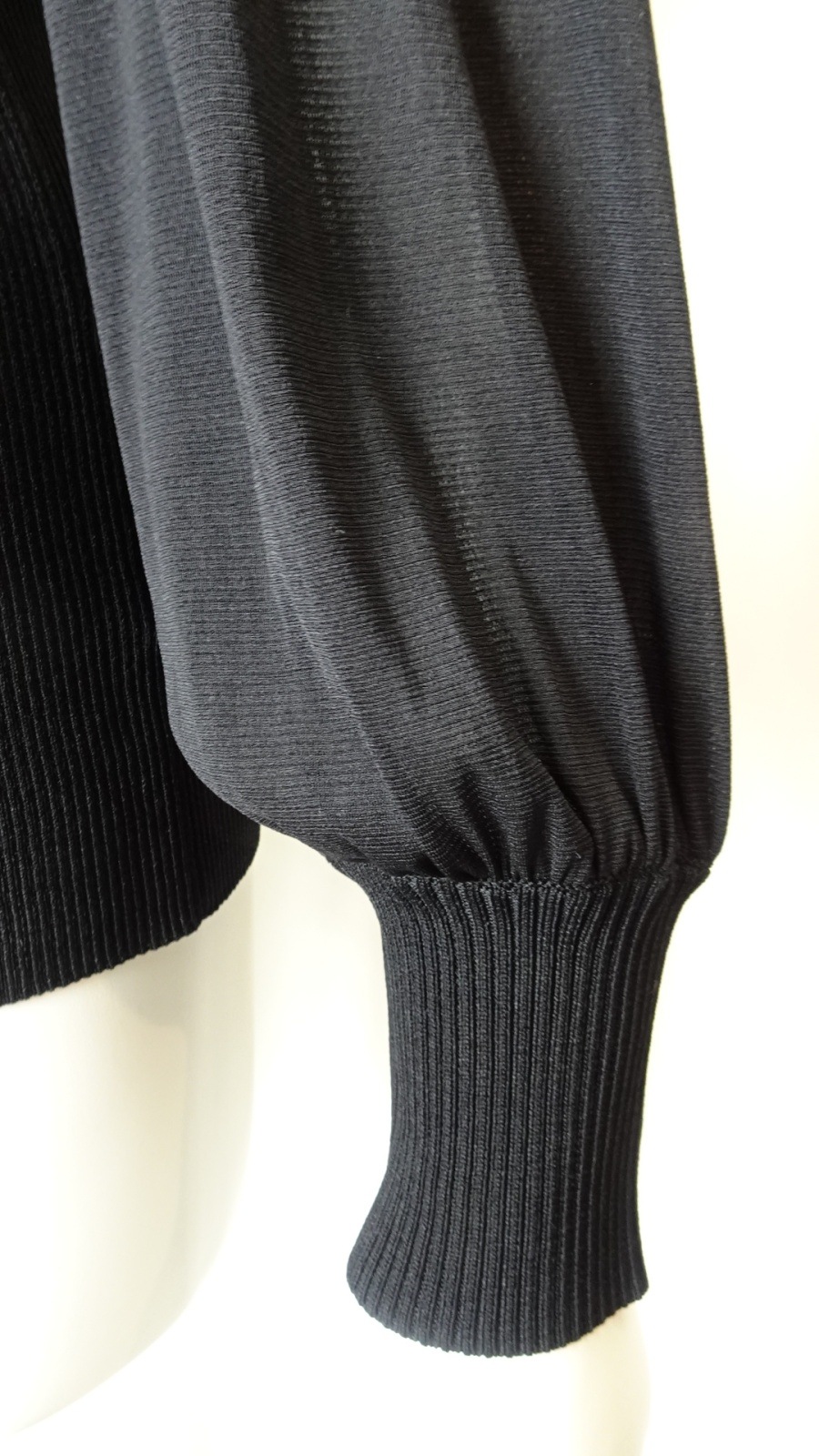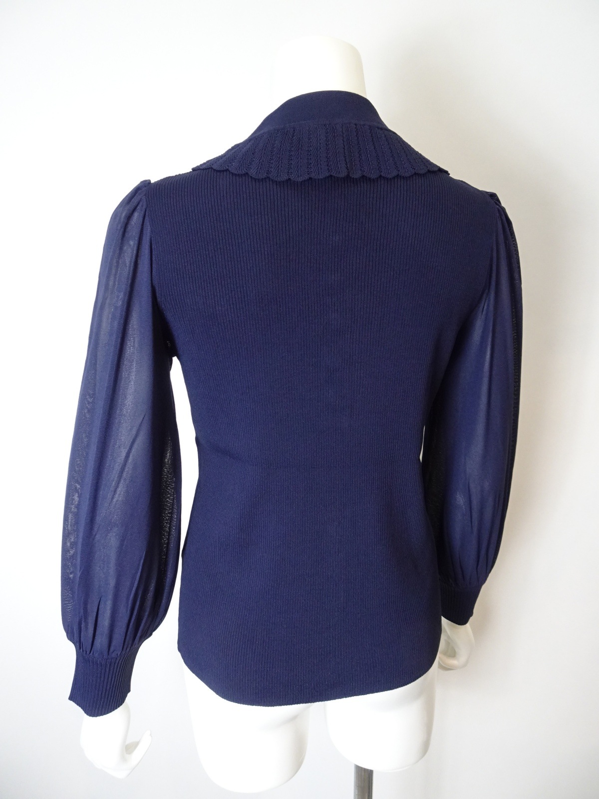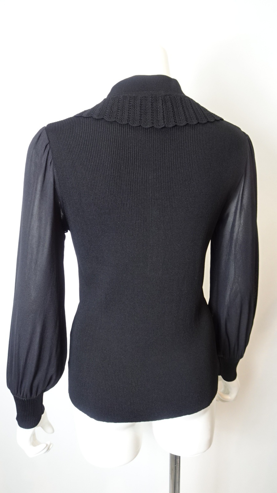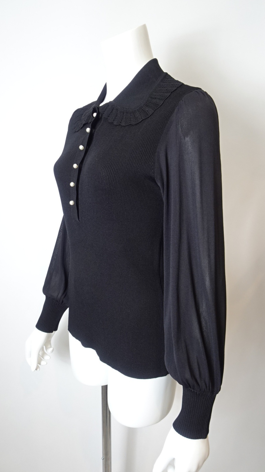 袖パワーネット素材の襟付きニットは身頃部分はリブ編みで仕立てられ、フィット感を高めつつも、柔らかな印象を与えます。