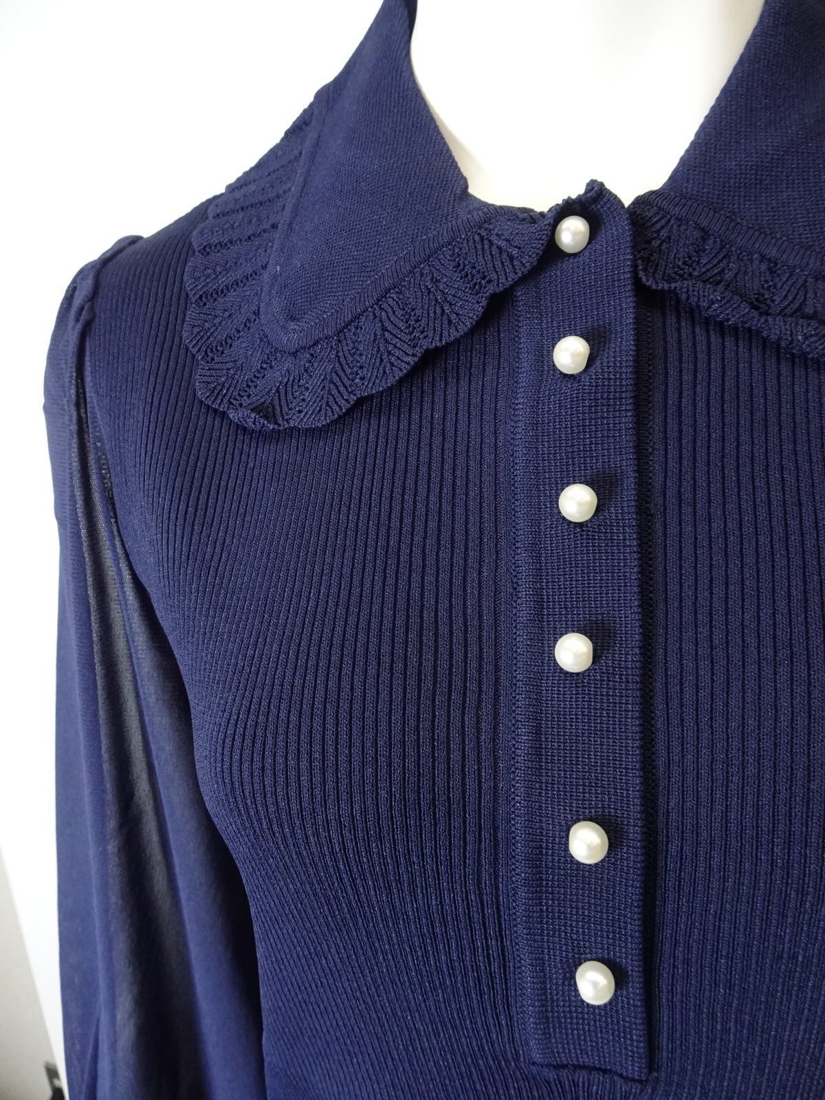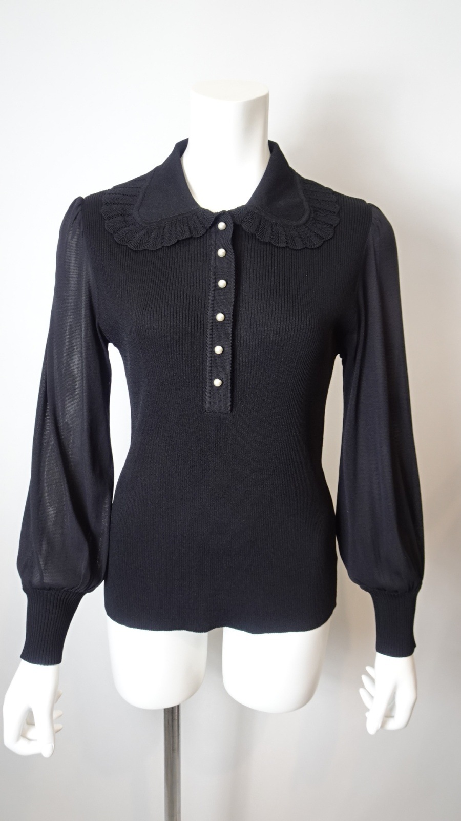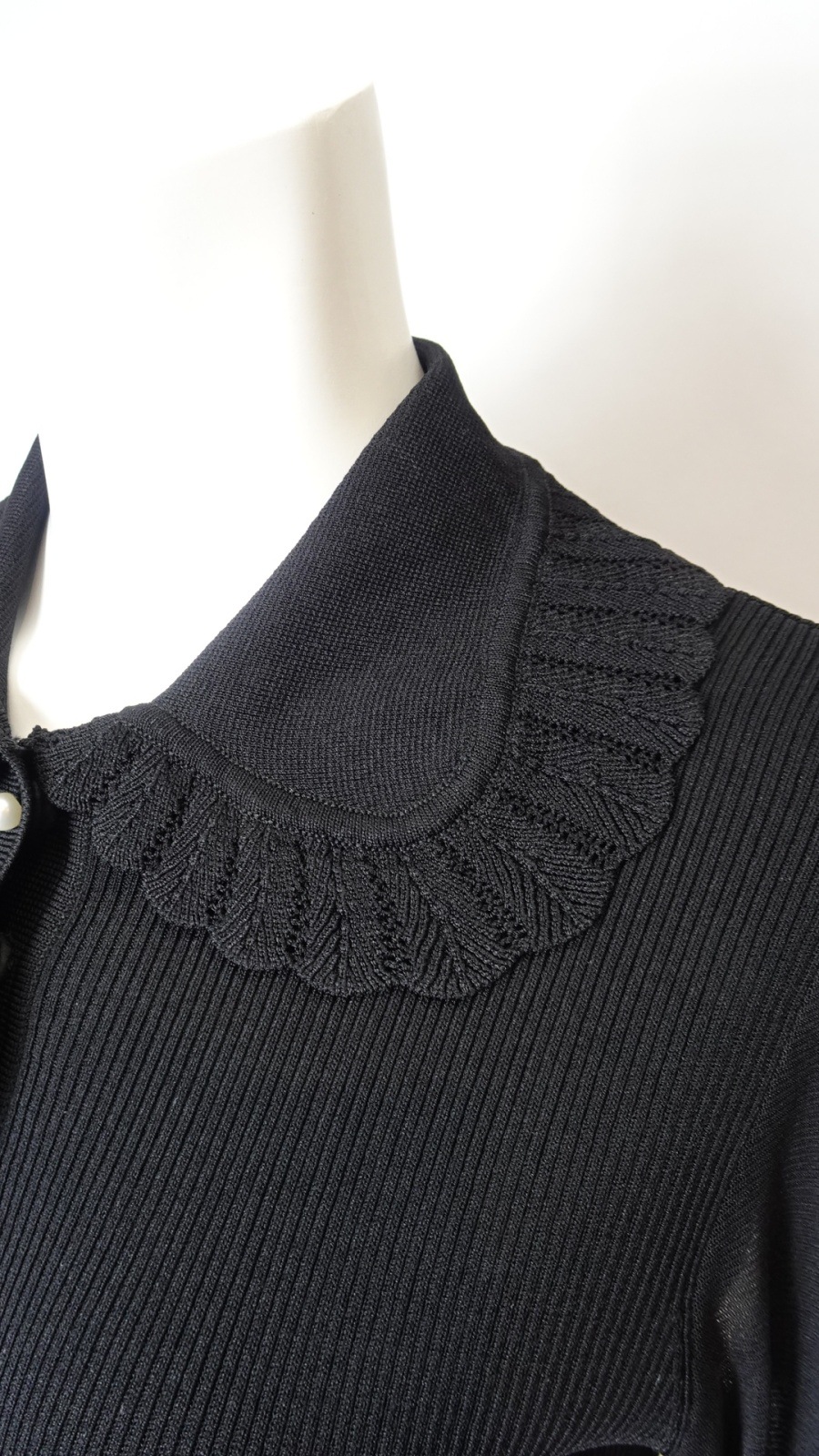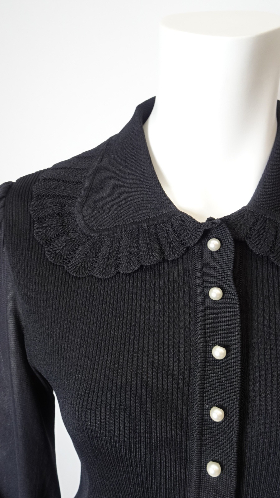 さらに、パールビーズボタンがアクセントとなり、上品さを演出します。華やかな輝きは、自信を持ってあなたを引き立てることでしょう。レース編みの衿は華やかさをプラスし、シンプルなスタイルでも特別感を感じさせてくれます。