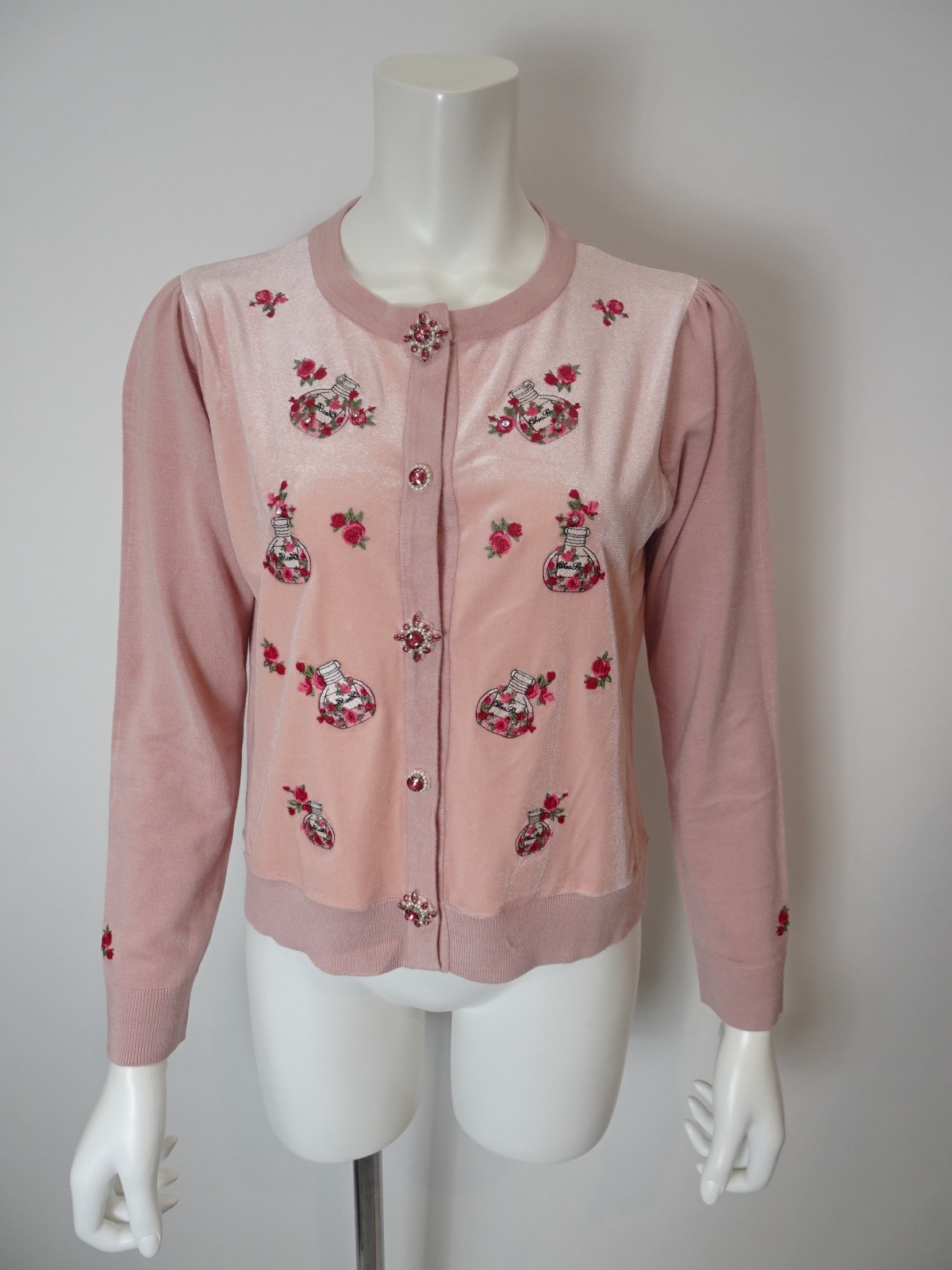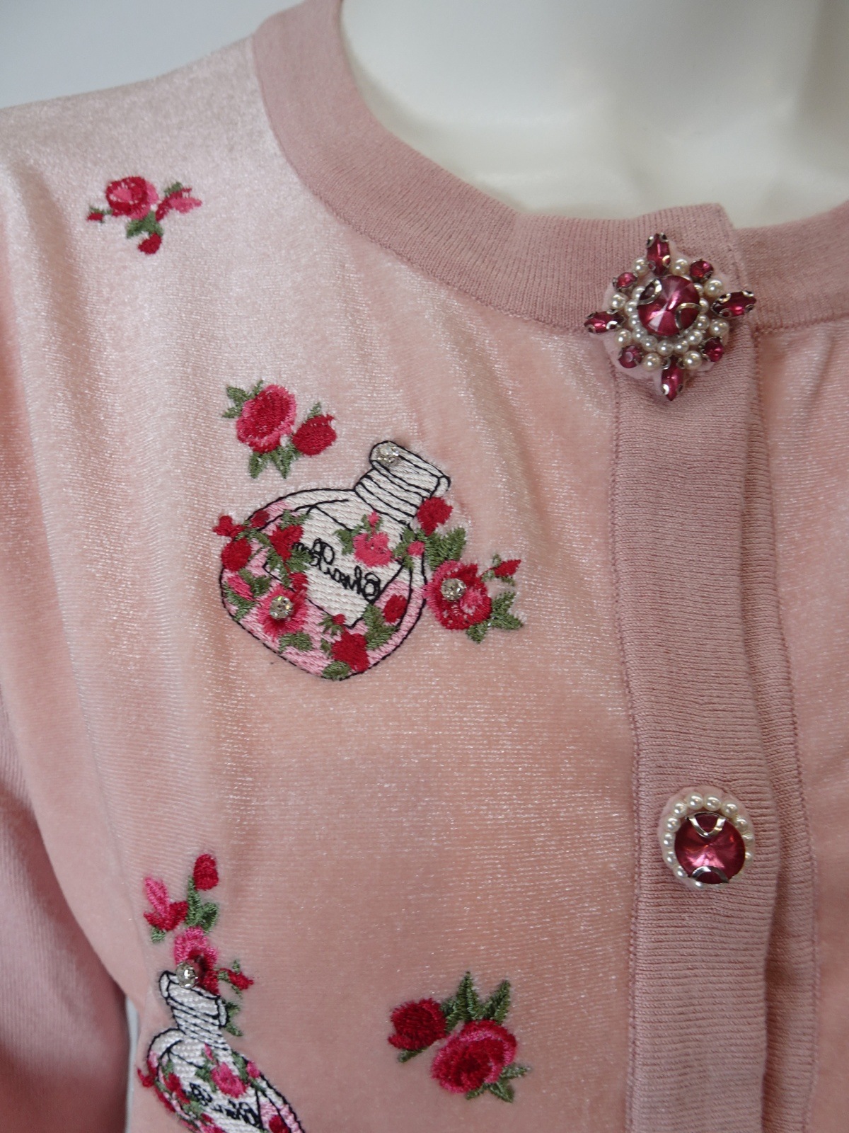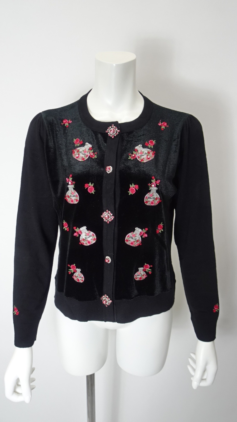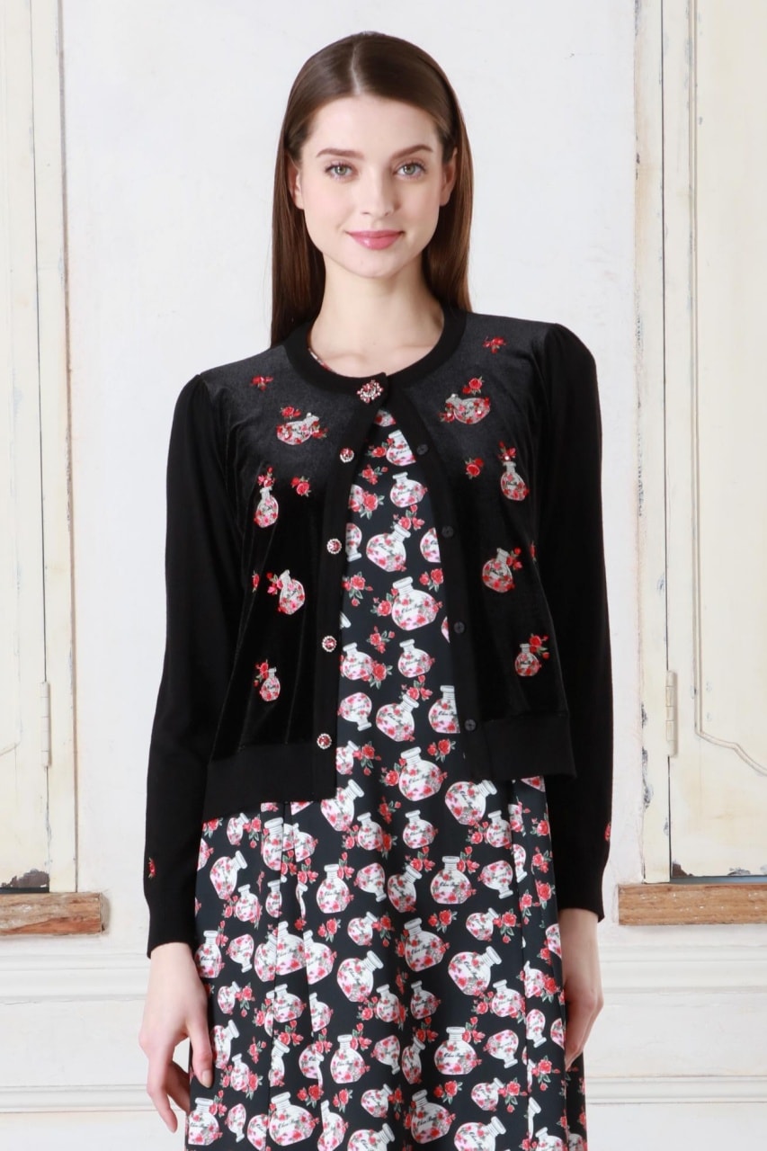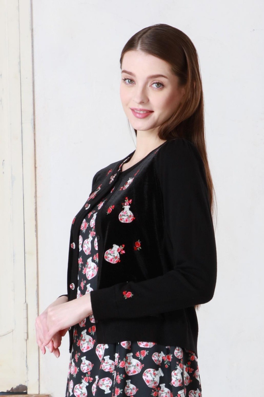 香水瓶刺しゅう ベロア素材×ニットカーディガンは、エレガントな雰囲気を醸し出す特別な一着です。前立てには高級感あふれるベロア素材が使用されており、ビジューボタンが華やかさをプラスします。ファッション性と機能性を兼ね備えたデザインで、どんなシーンにもぴったりです。