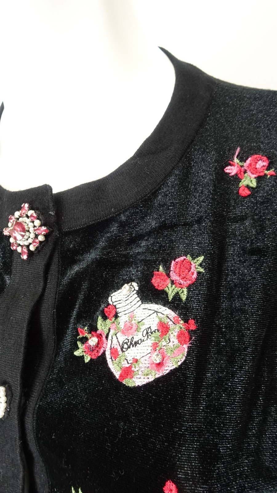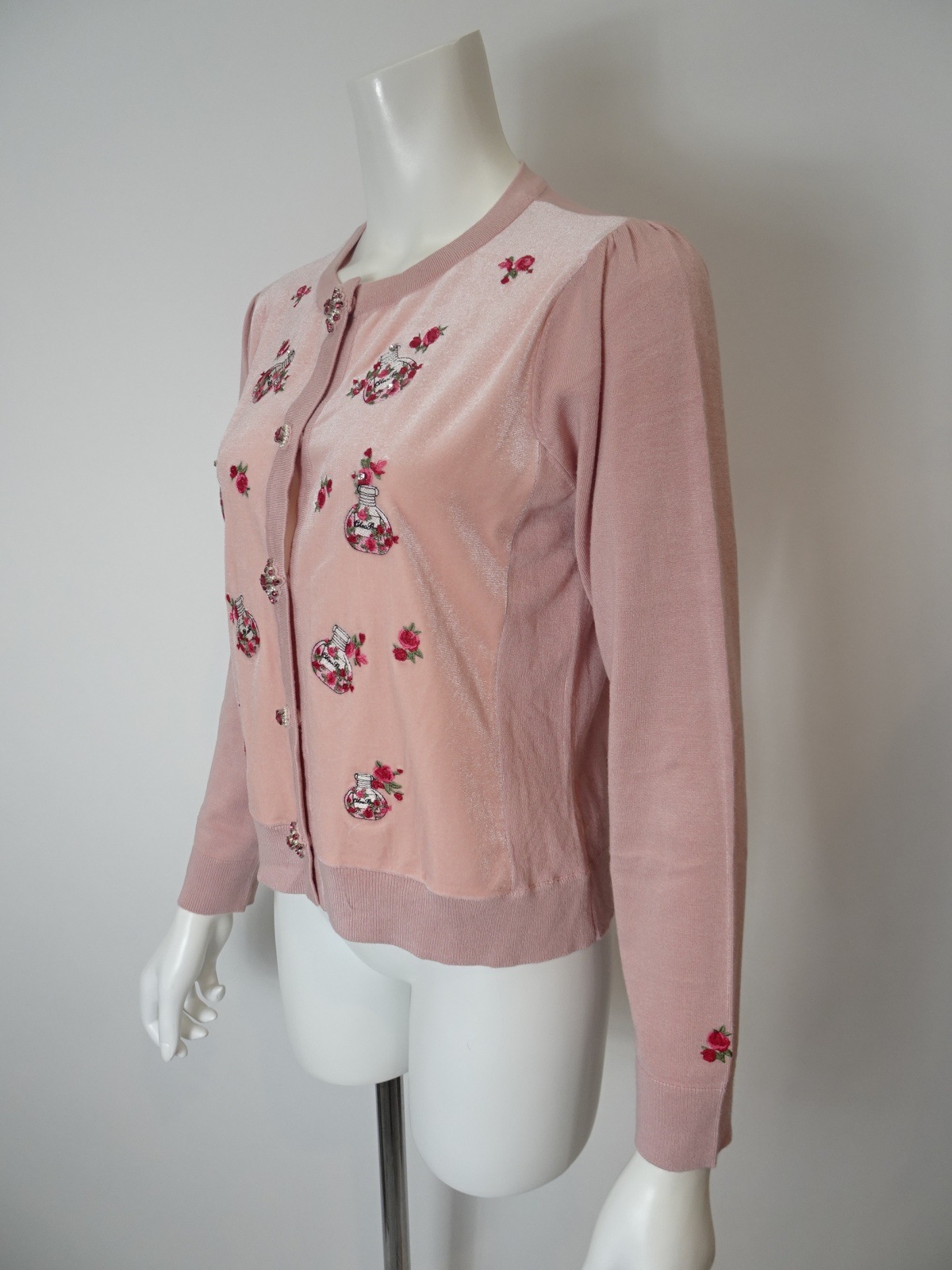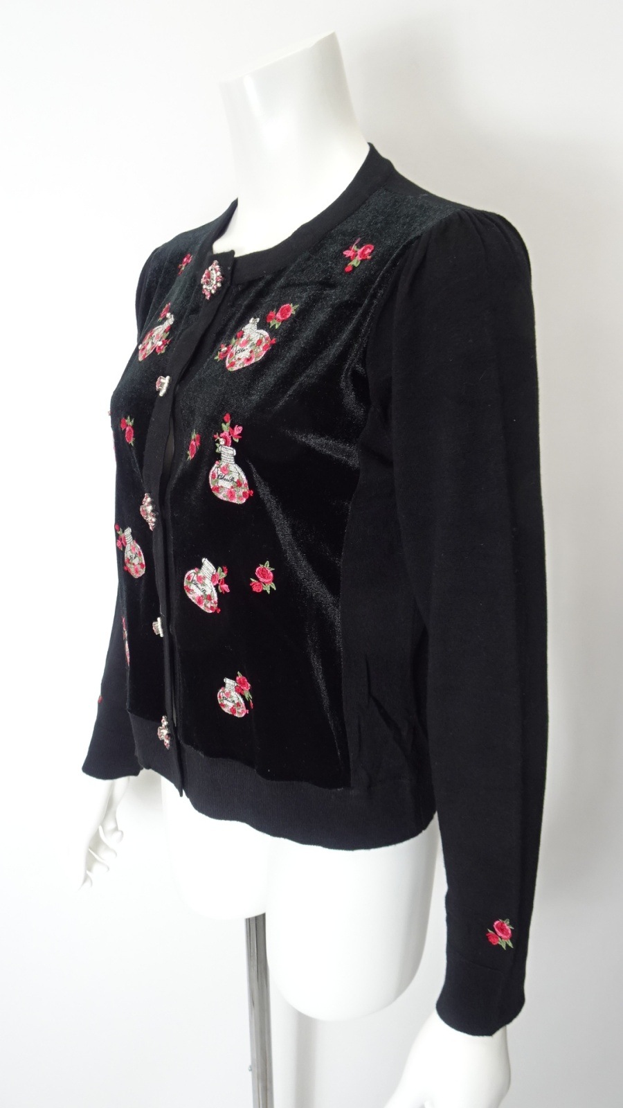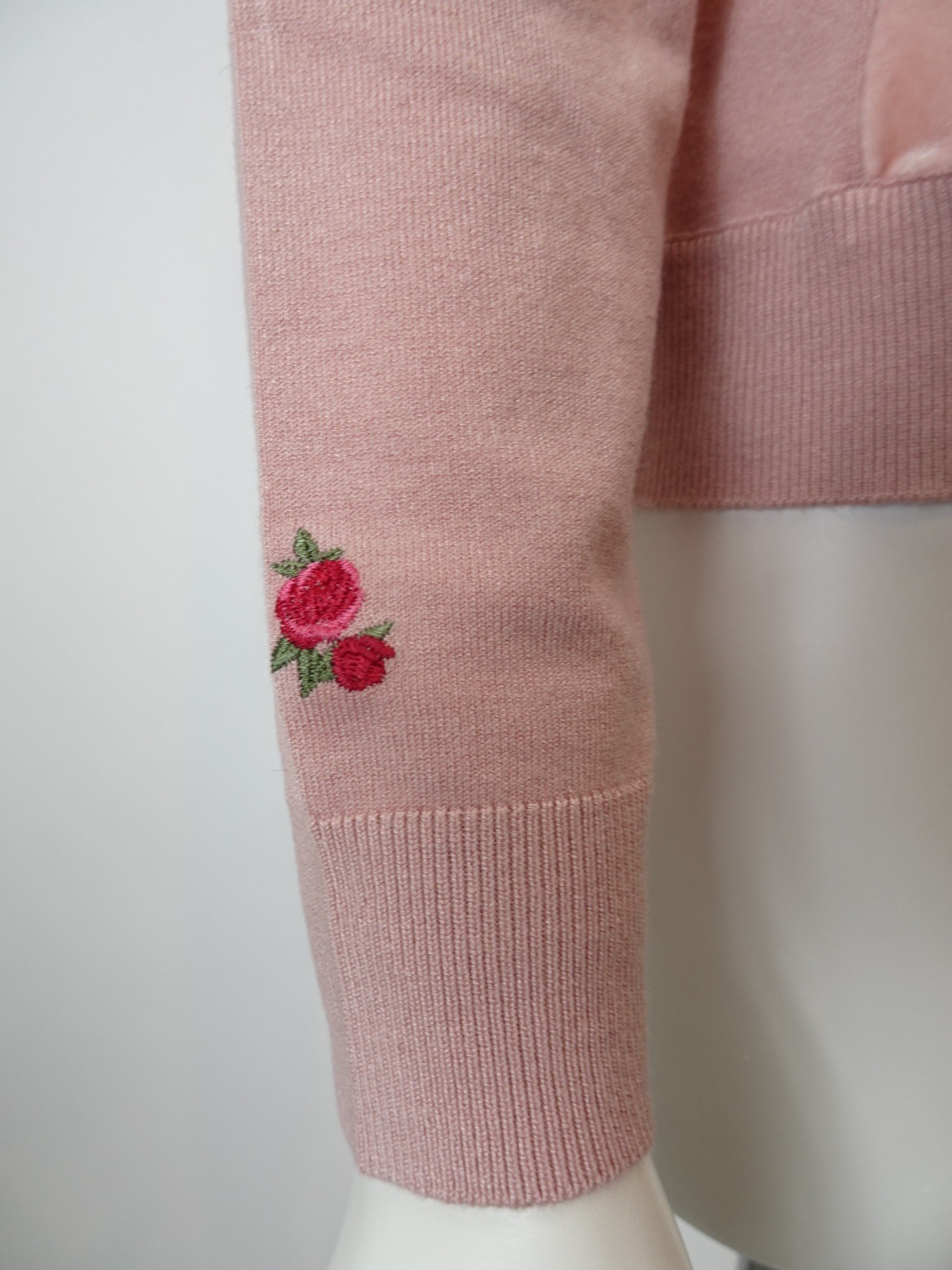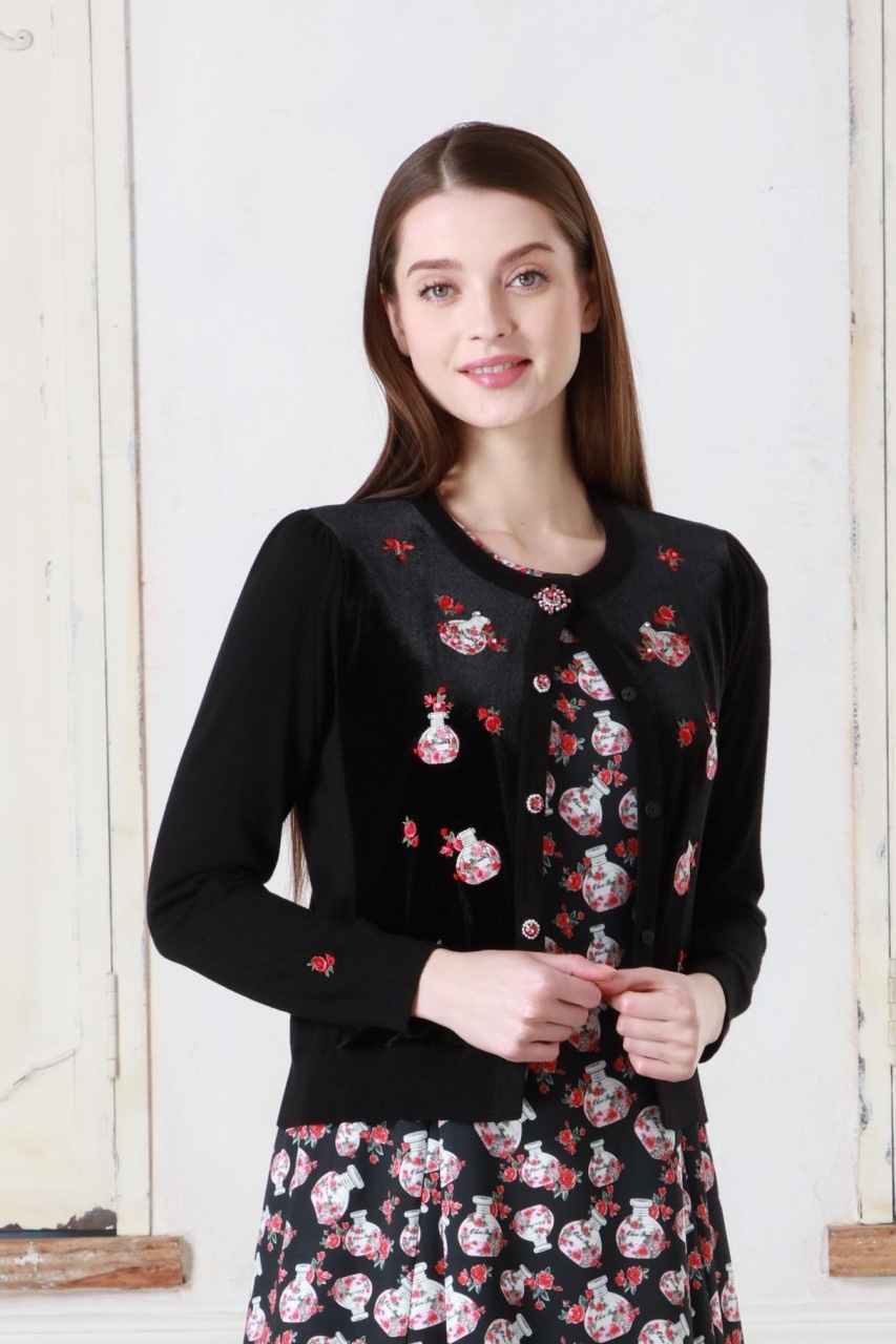 香水瓶刺しゅう ベロア素材×ニットカーディガンは、エレガントな雰囲気を醸し出す特別な一着です。前立てには高級感あふれるベロア素材が使用されており、ビジューボタンが華やかさをプラスします。ファッション性と機能性を兼ね備えたデザインで、どんなシーンにもぴったりです。