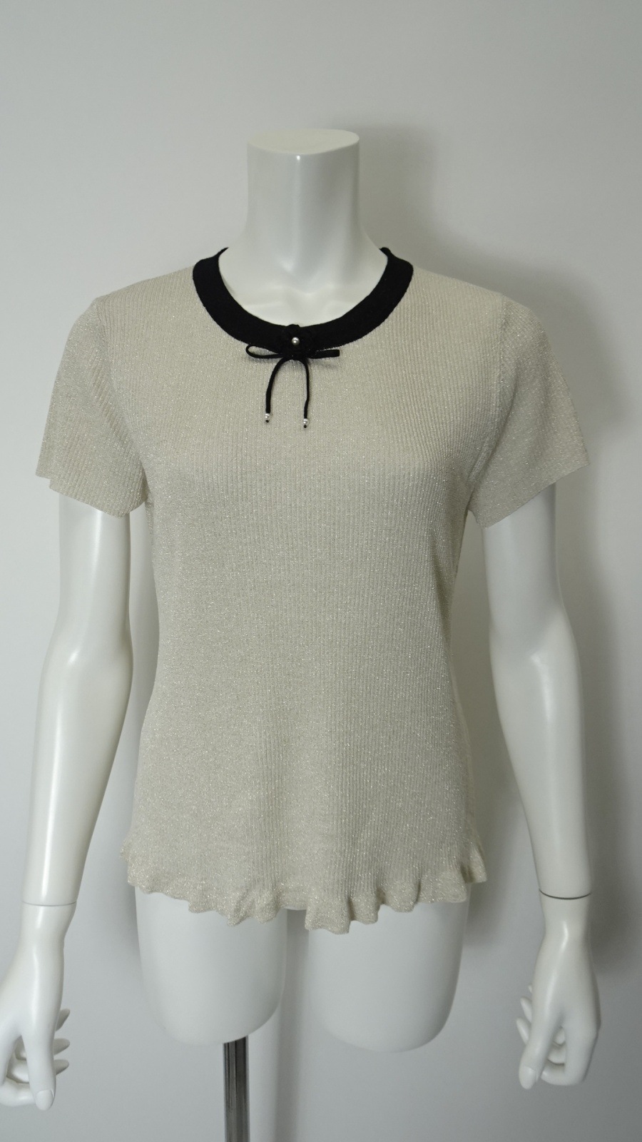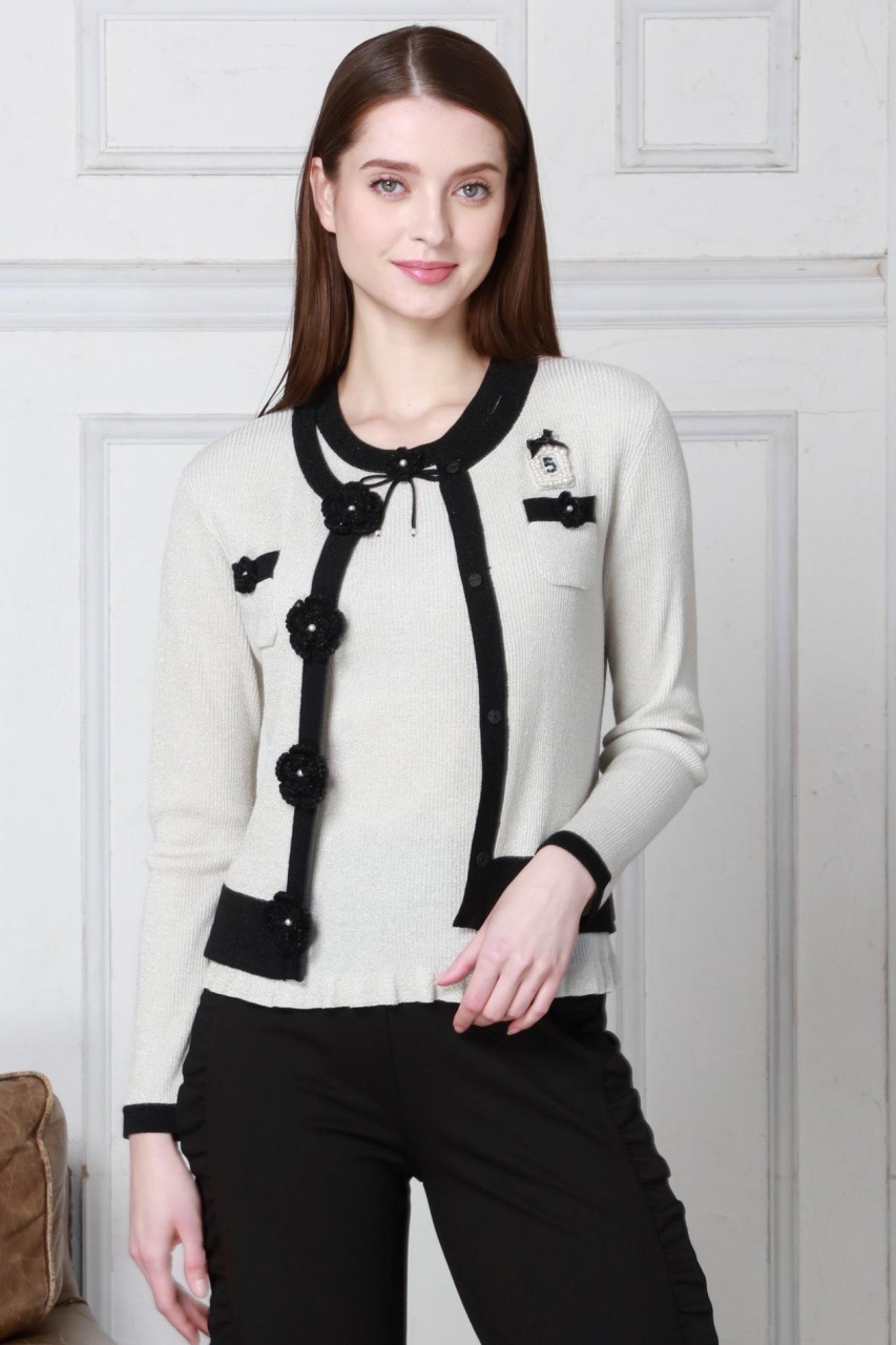 ラメ入り配色デザイン花モチーフ付ニットアンサンブルは、華やかさとシンプルさを兼ね備えた魅力的なアイテムです。ショート丈カーディガンと半袖ニットの組み合わせは、どんなコーディネートにもぴったり。