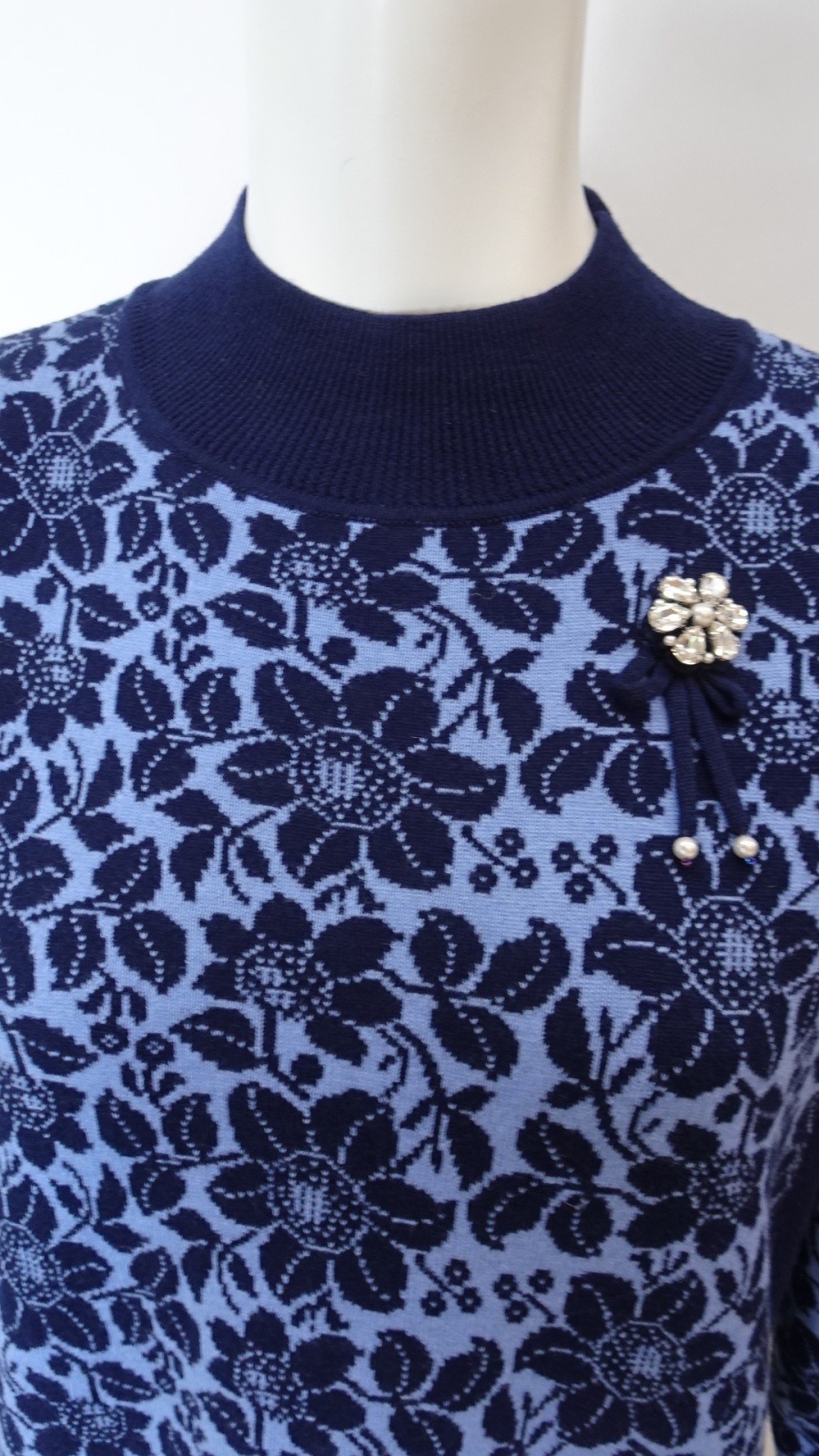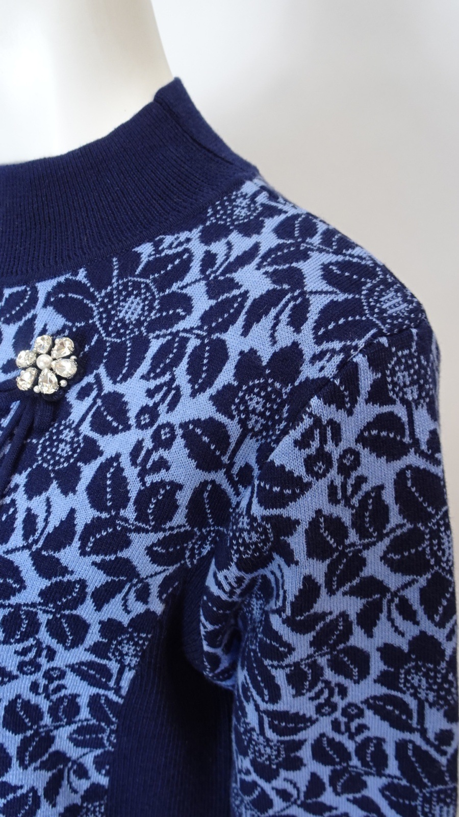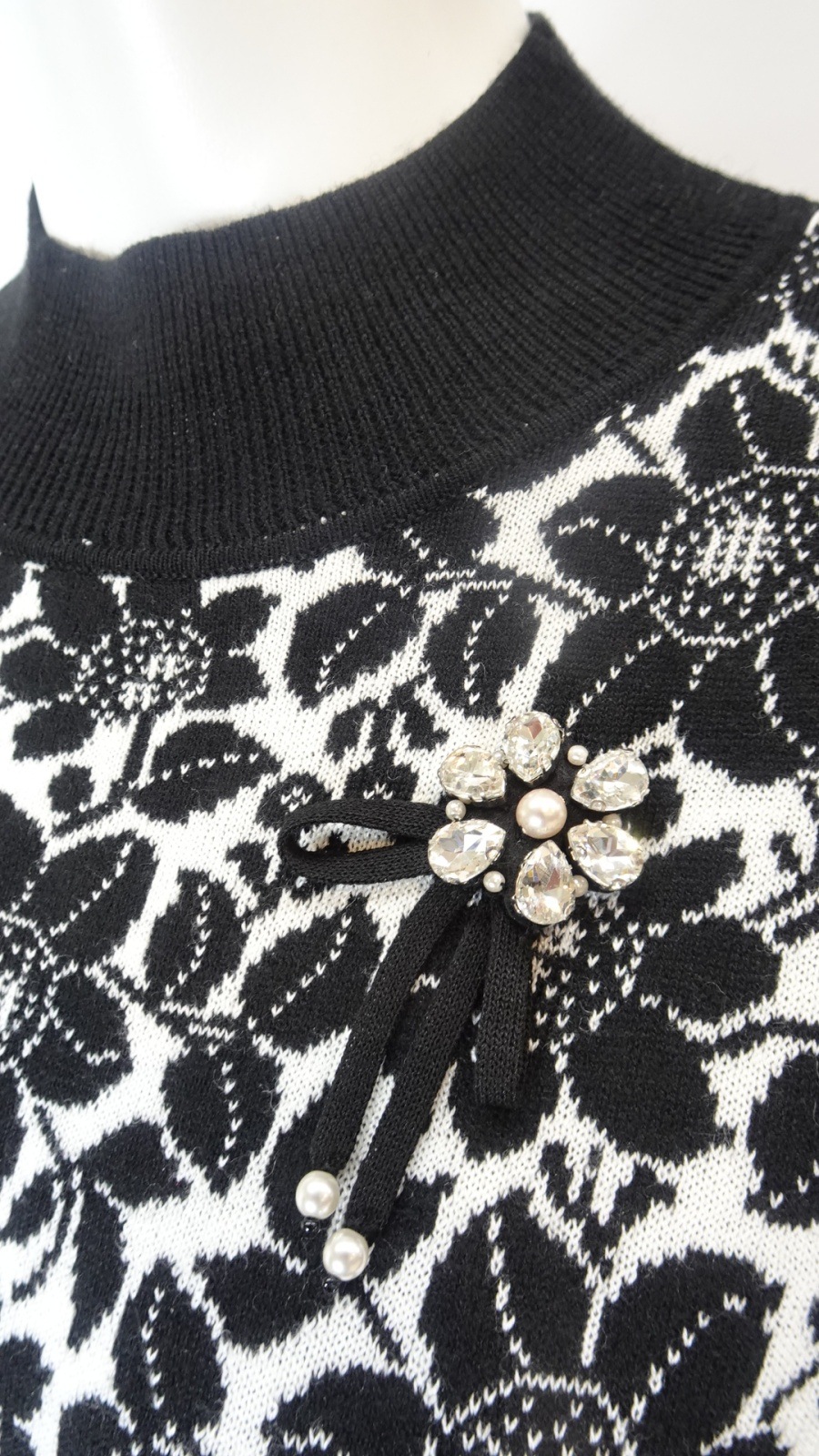 襟元には華やかなビジューモチーフをあしらい、コーディネートのアクセントとして楽しめます。全体の花柄ジャガードが優雅さを演出します。