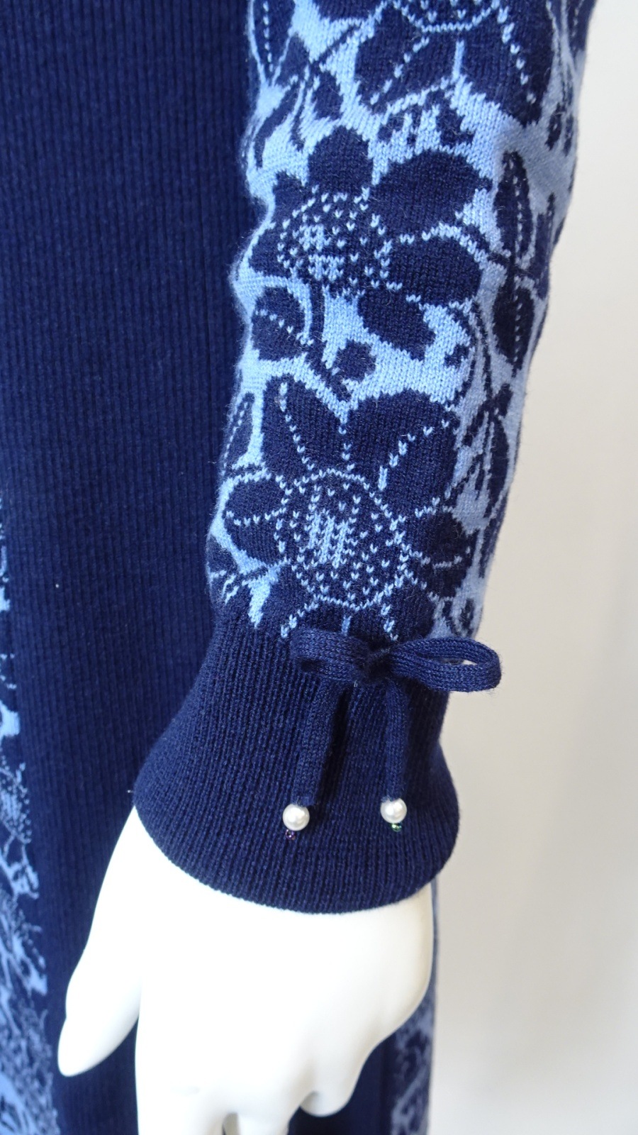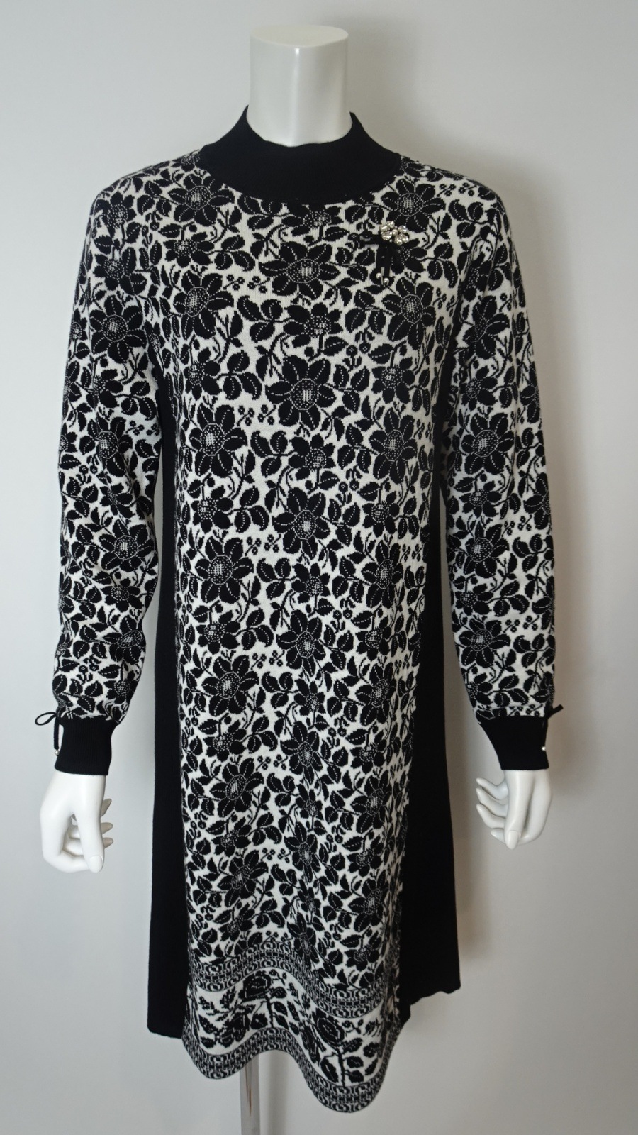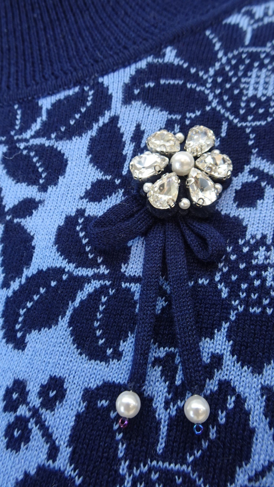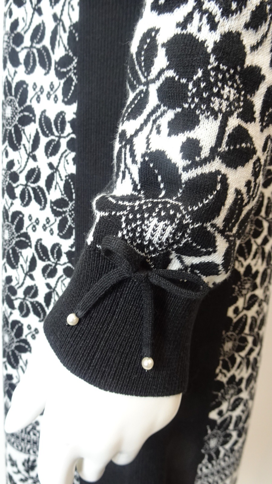 襟元には華やかなビジューモチーフをあしらい、コーディネートのアクセントとして楽しめます。全体の花柄ジャガードが優雅さを演出します。