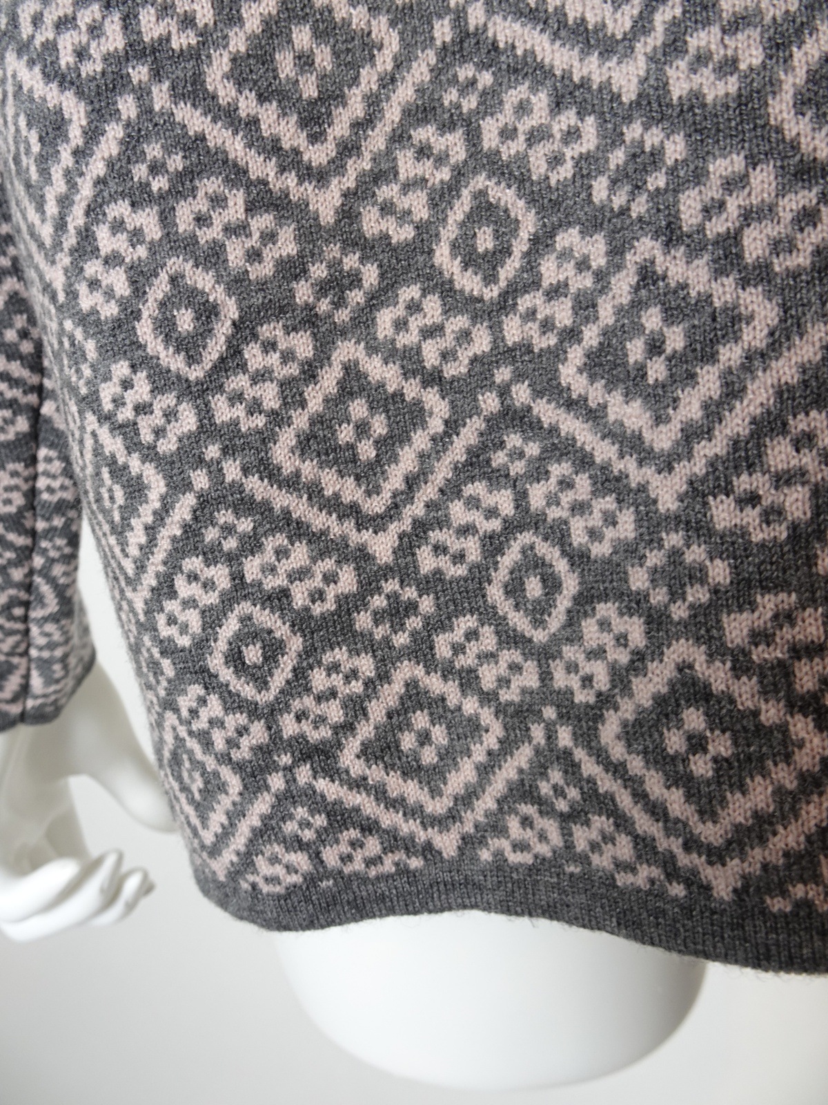 洗練されたボックスシルエットが魅力的な一着です。幾何柄ジャガードが施されており、スタイリッシュでありながら温かみを感じさせるデザインが特徴です。一枚で主役にも脇役にもなれる優れものです。