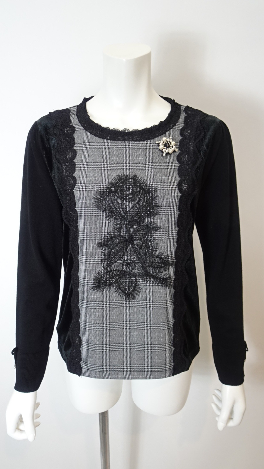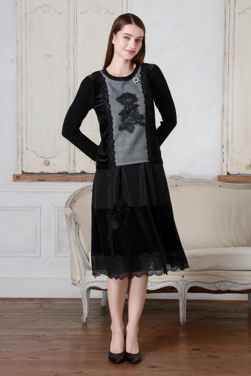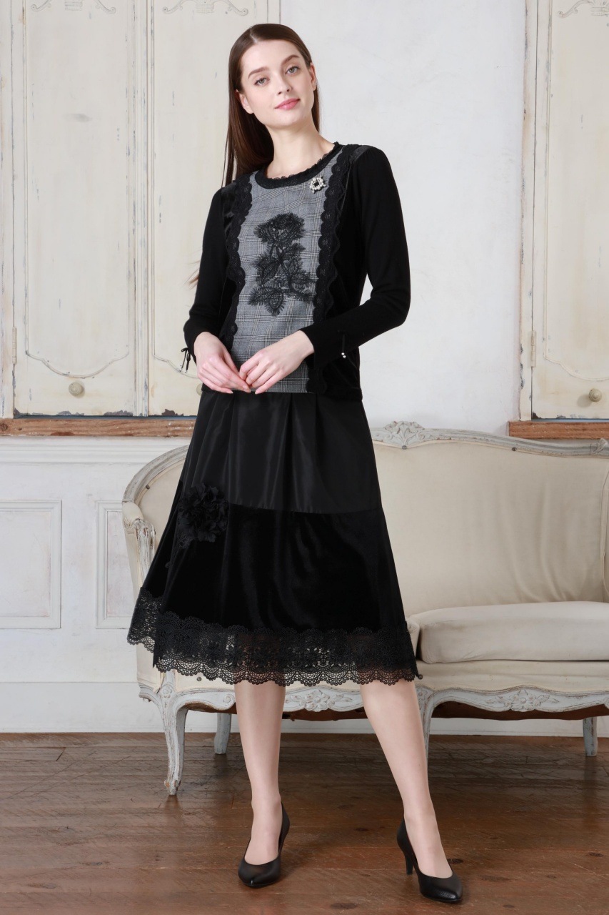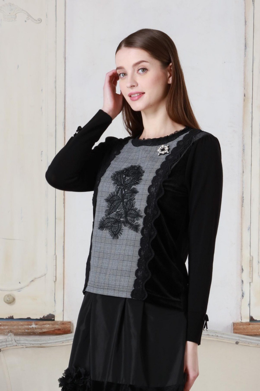 2025年秋冬 ベロア袖×チェック柄 胸元レース使いセーター 2521029