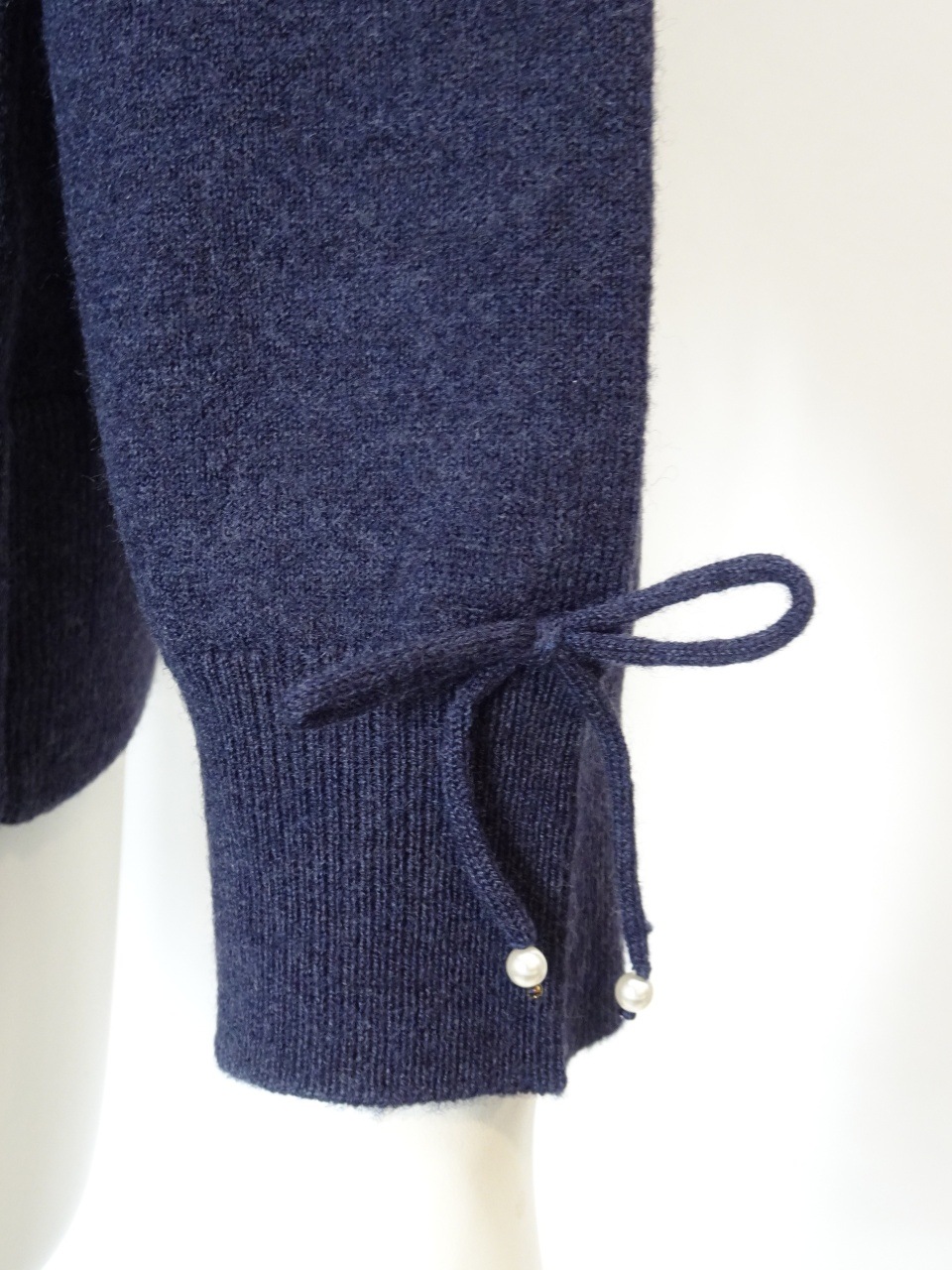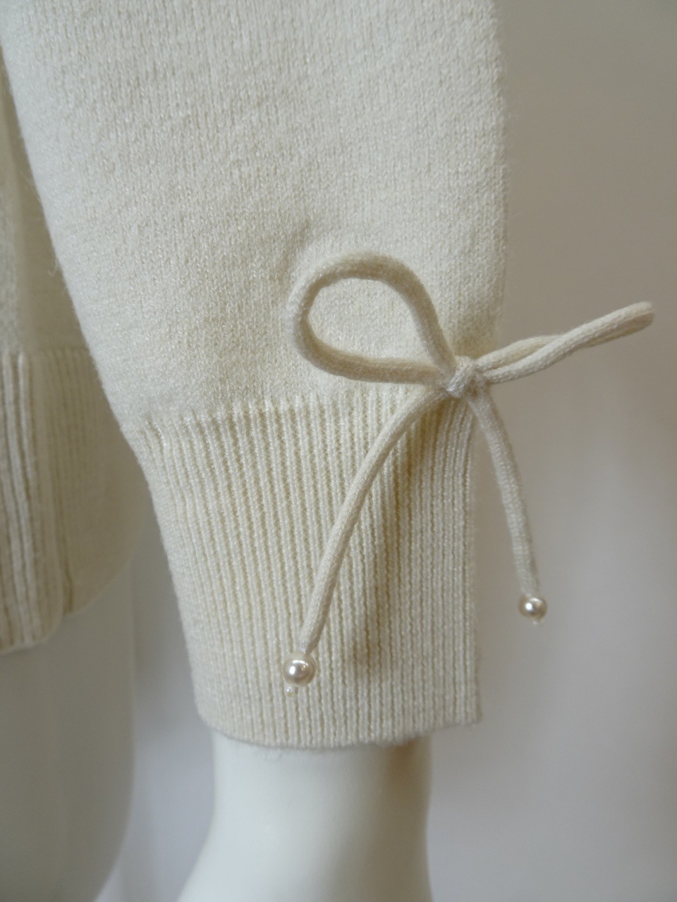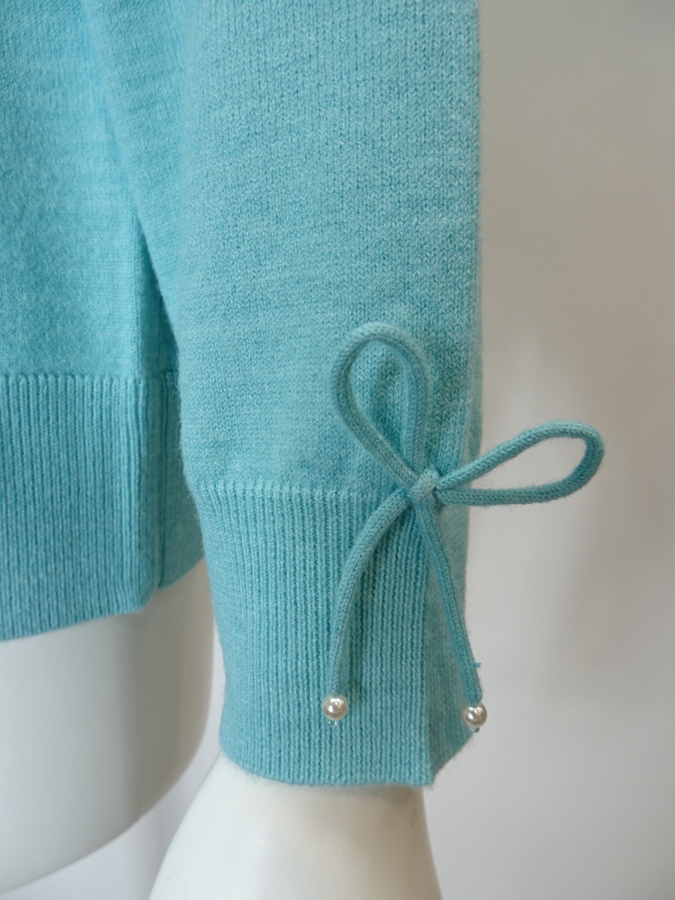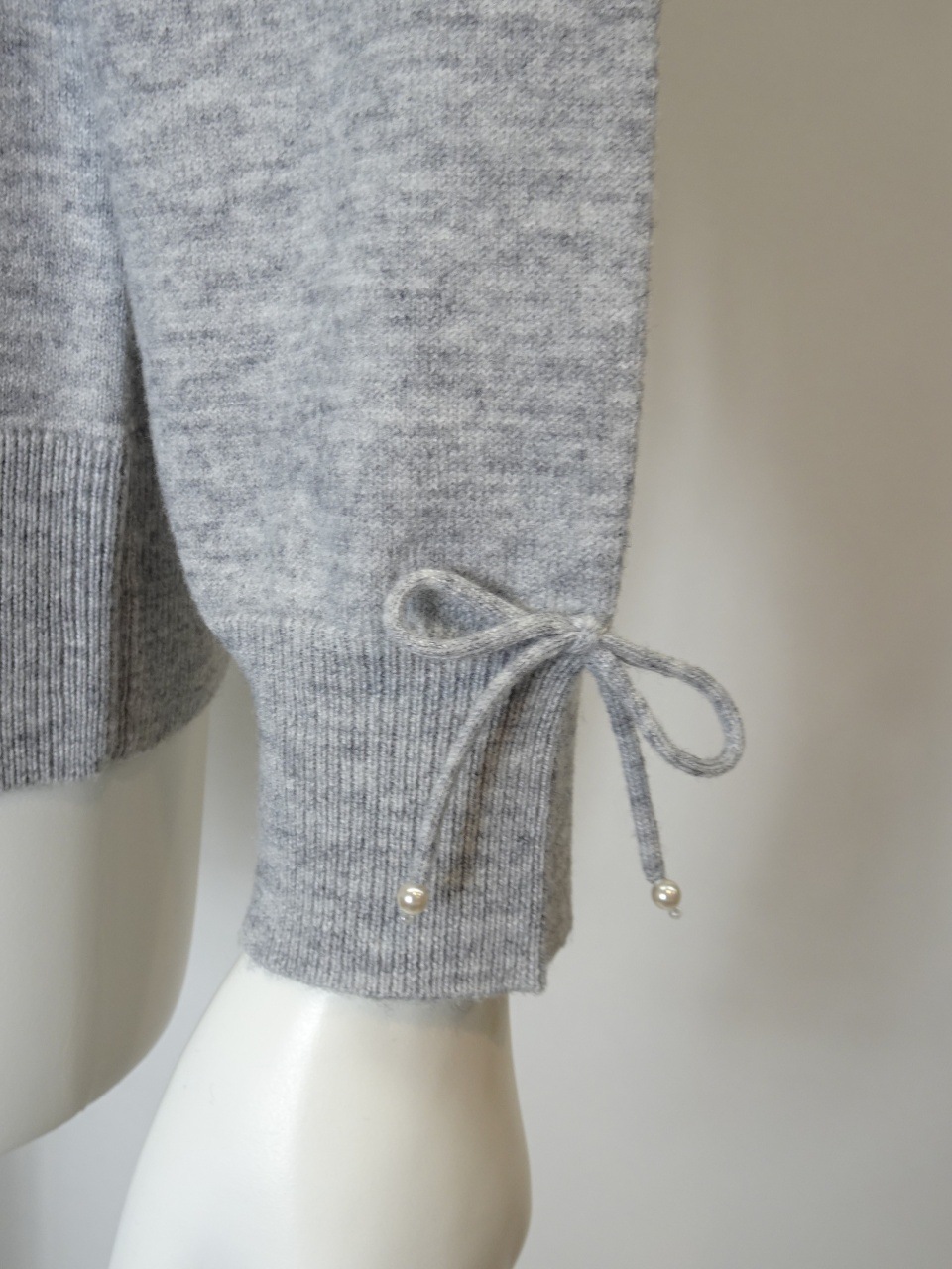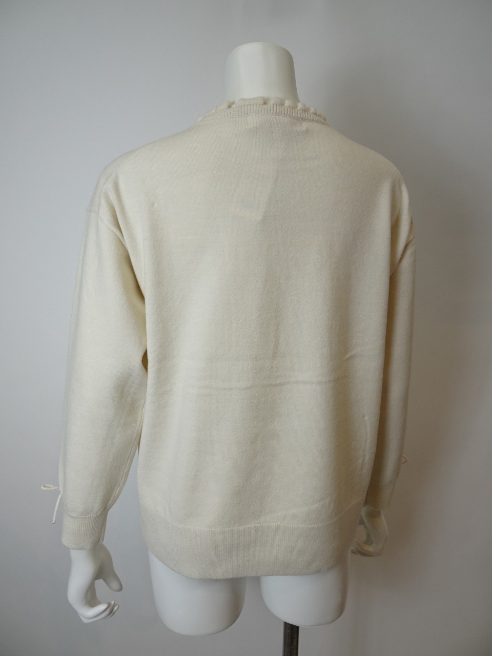 襟ぐりや裾にはフリルがあしらわれており、どこか優雅な印象を与えます。袖先にはキュートなリボンが施されており、細部にまでこだわった幸せを運ぶデザインが魅力的です。