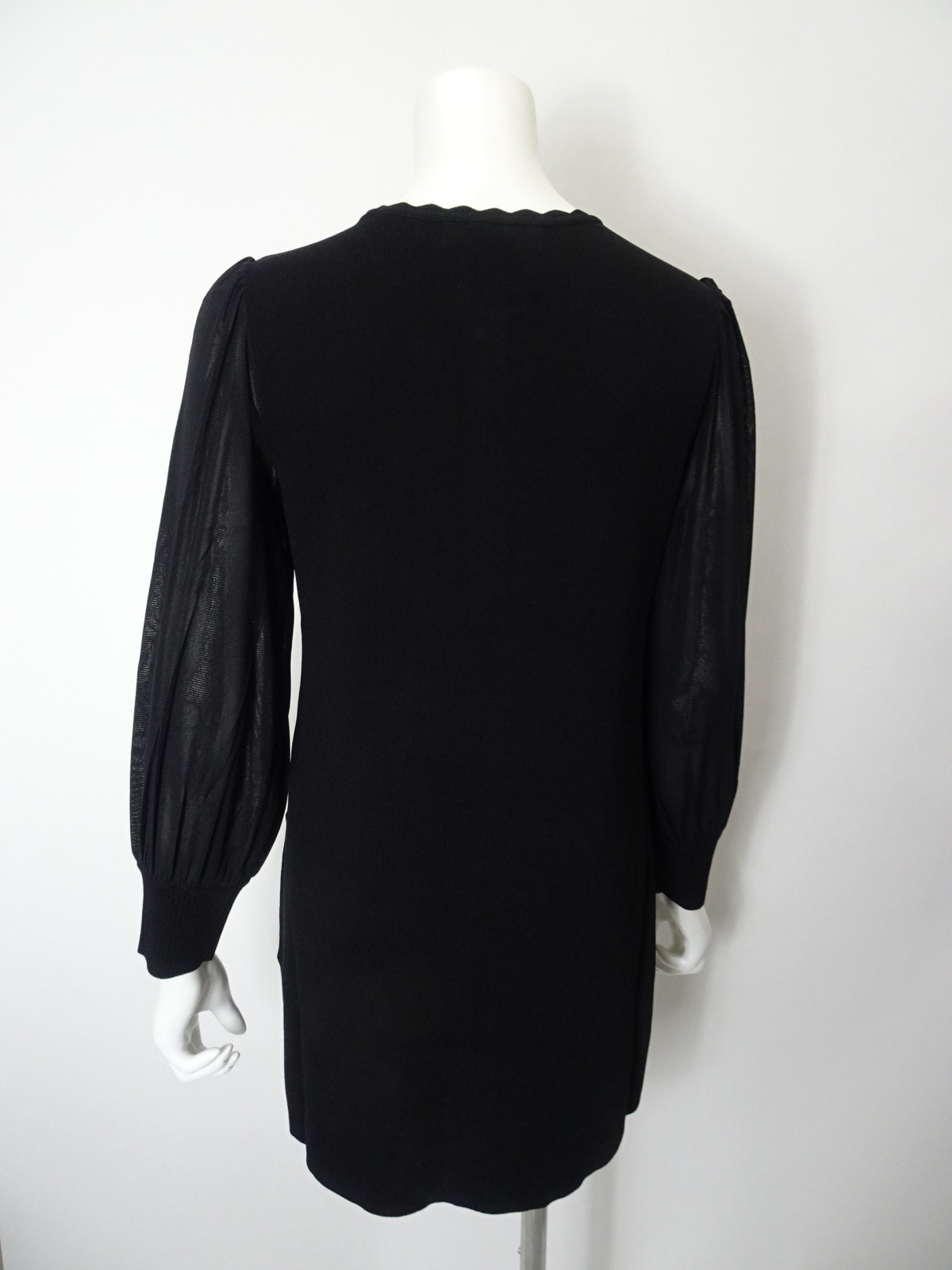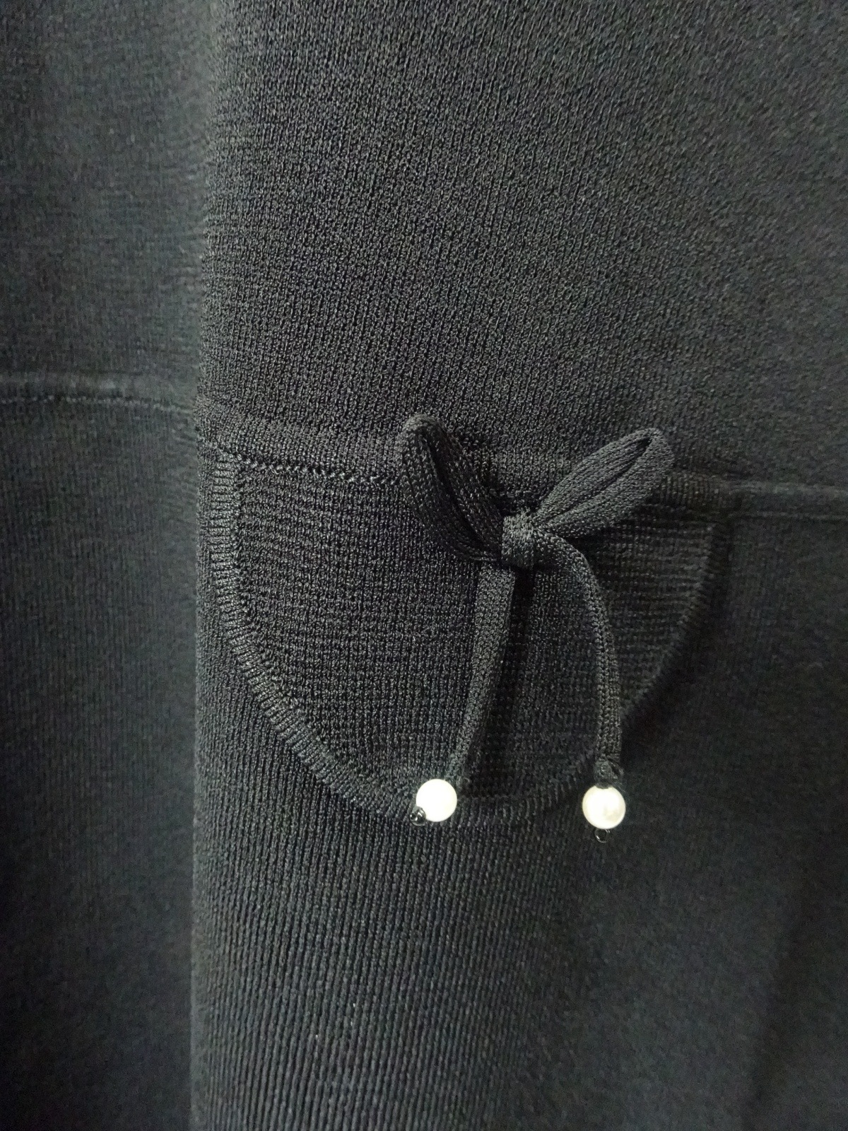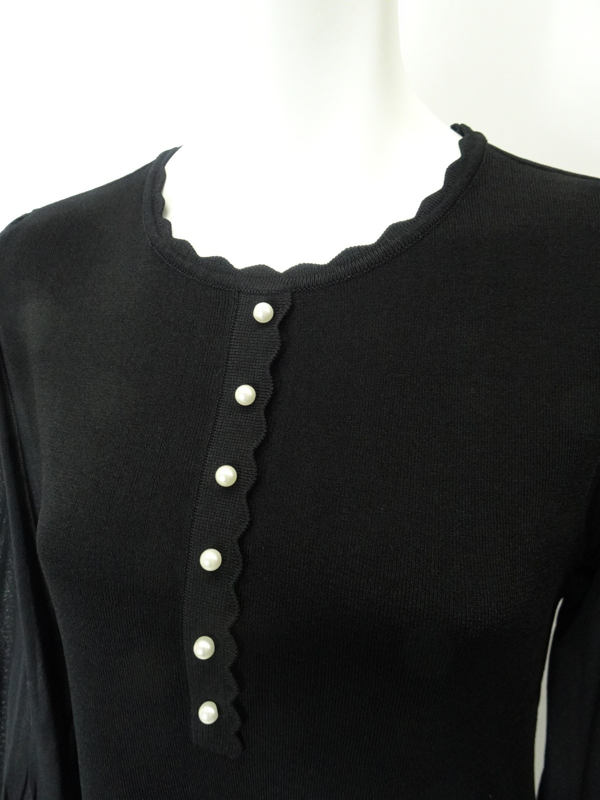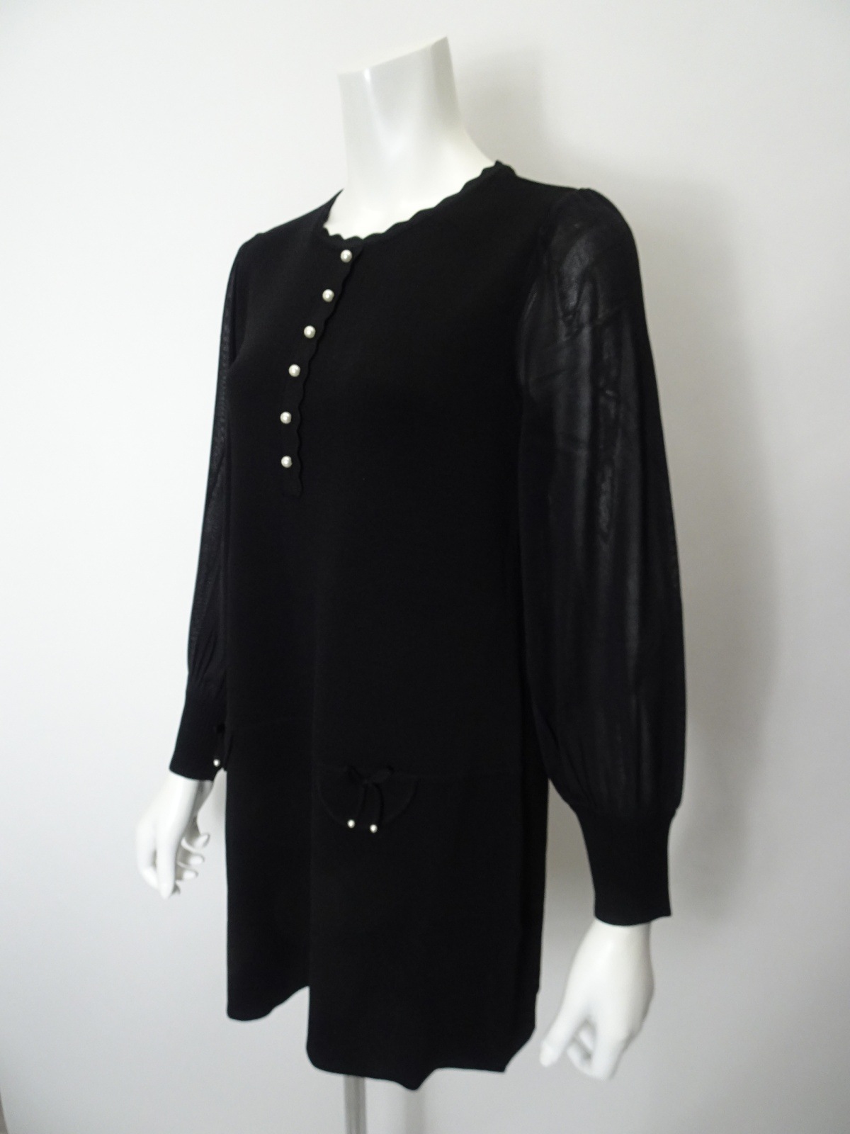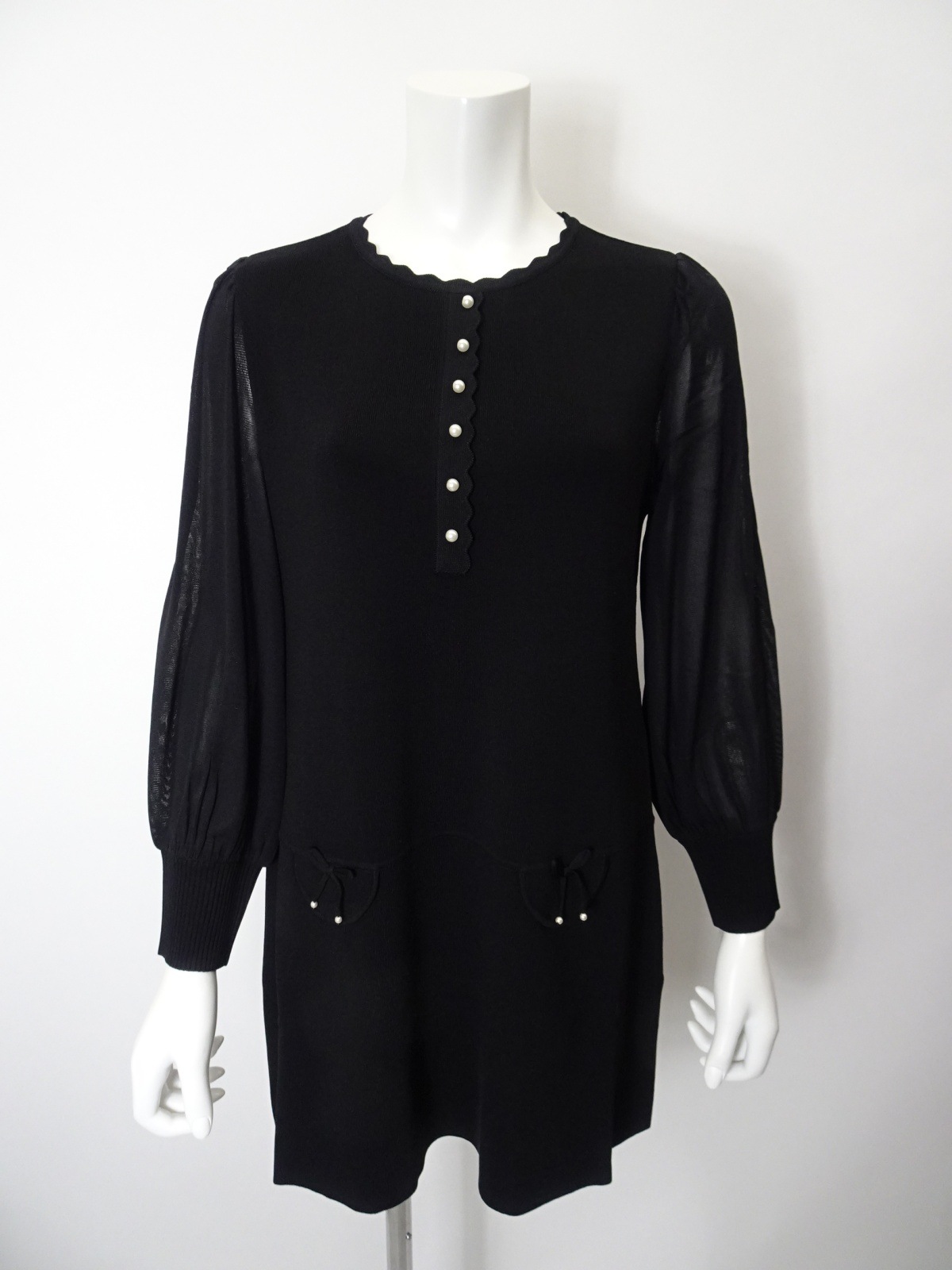 エレガントさとカジュアルさを兼ね備えた、袖パワーネット素材の無地ニットチュニックは、胸元に施されたパールビーズボタンが華やかさを演出し、フラップポケットがアクセントとなっております。