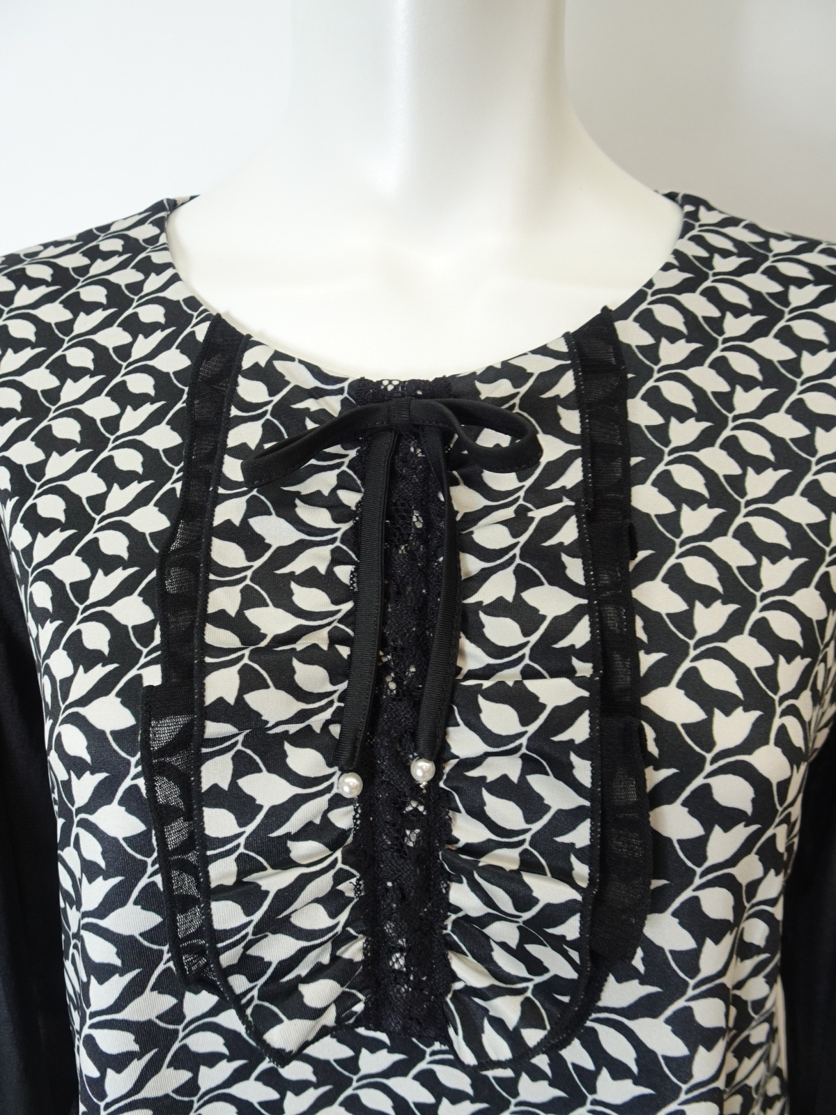 胸元のフリルと襟元のリボンモチーフが、洗練された印象を持たせてくれます。モノトーンデザインはコーディネートの幅を広げ、さまざまなシーンで活躍します。