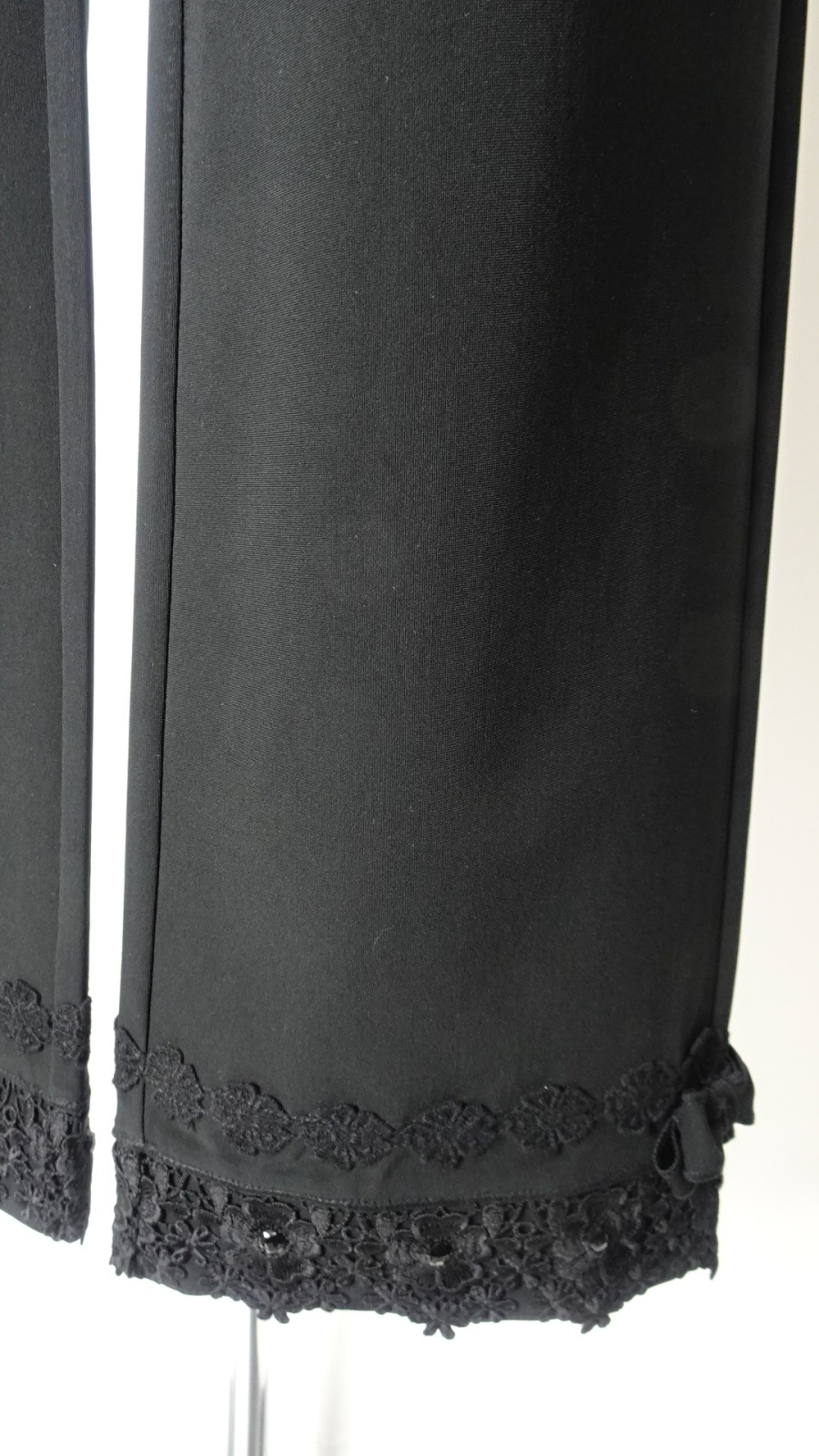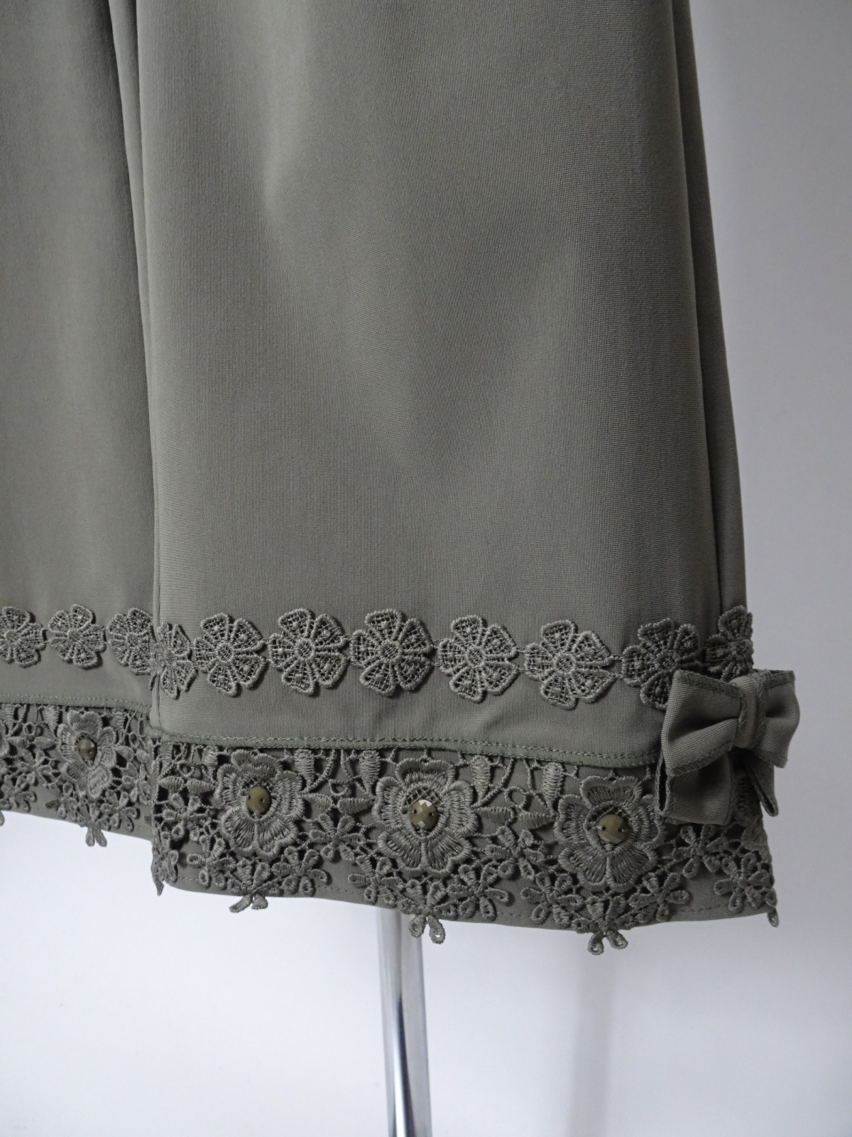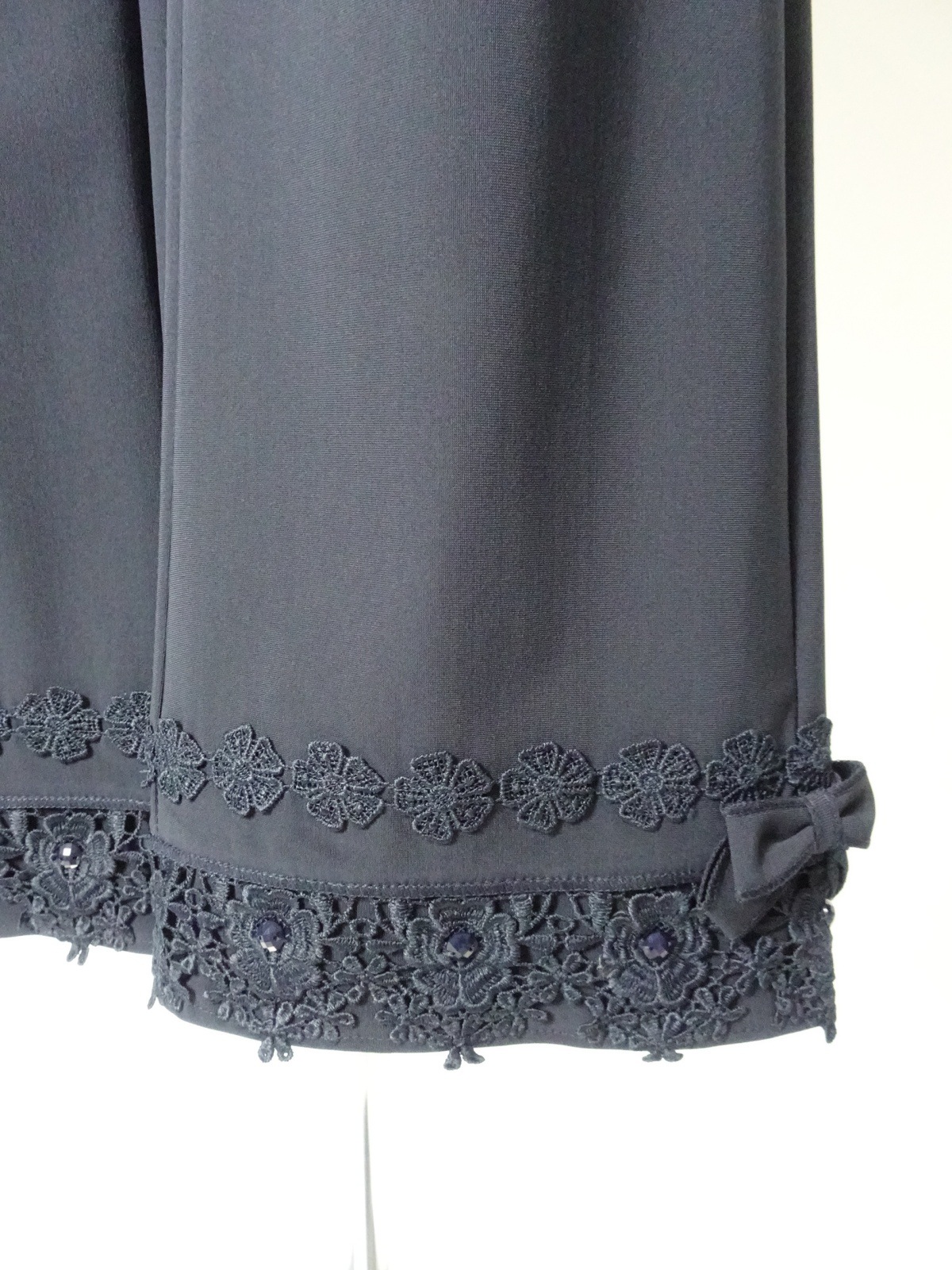 裾には華やかなレースとリボンのデザインが施されており、コーディネートにアクセントを加えます。飽きの来ない多様なスタイリングが可能で、カジュアルからフォーマルまで幅広いシーンに対応します。特別な日のおしゃれ着としてもお勧めです。