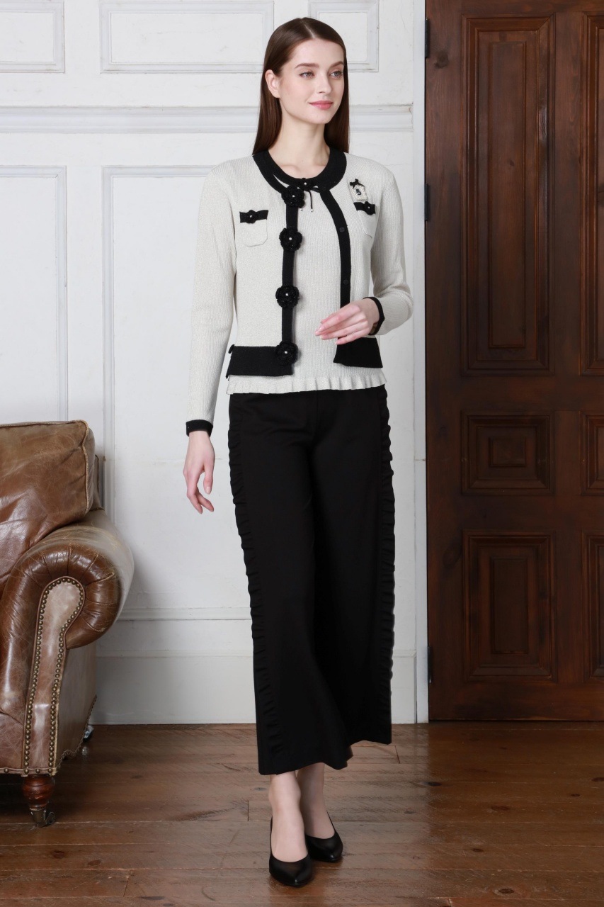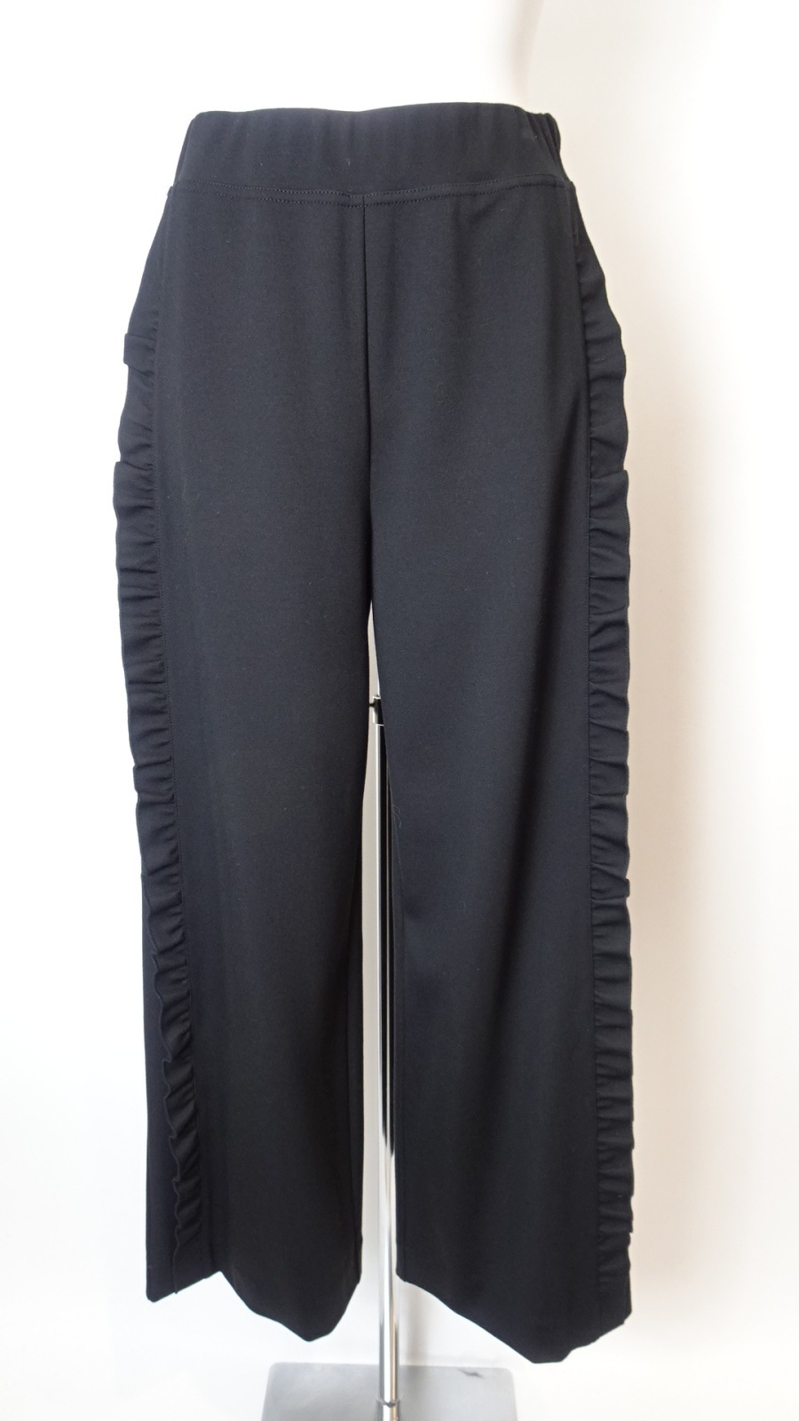 特徴的なワイドパンツのシルエットが脚を美しく見せ、気になる部分をさりげなくカバー。柔らかなフリルのディテールが、女性らしさを引き立て、ちょっと特別な日のコーディネートにも最適です。どんなトップスとも合わせやすく、無限のスタイルバリエーションを楽しめます。