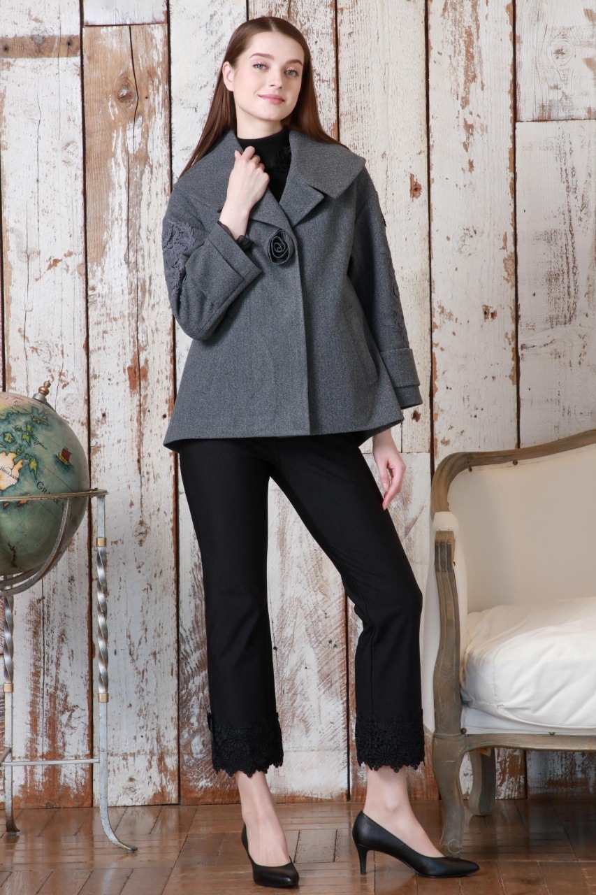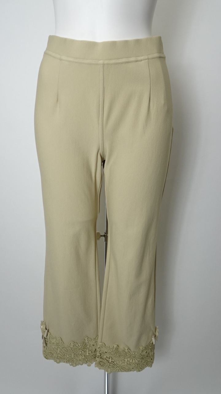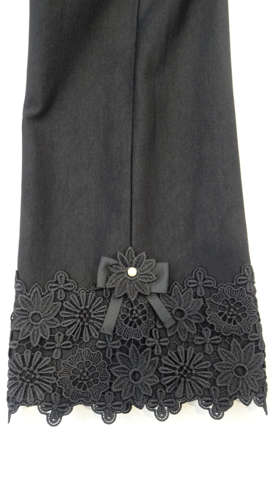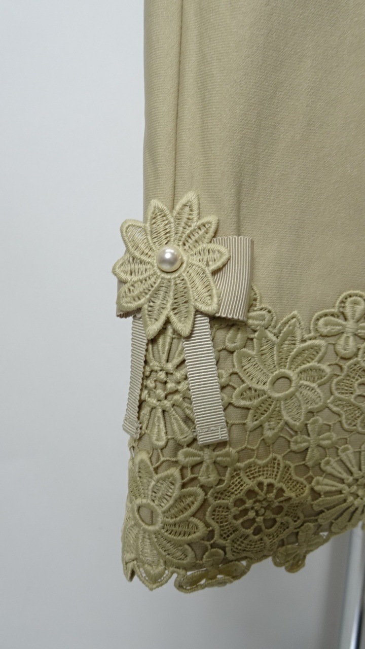 さらに、裾サイドに施された華やかな花とリボンモチーフが、シンプルながらも女性らしさを引き立てます。デザイン性と機能性を両立したこちらのパンツは、どんなトップスとも相性抜群です。