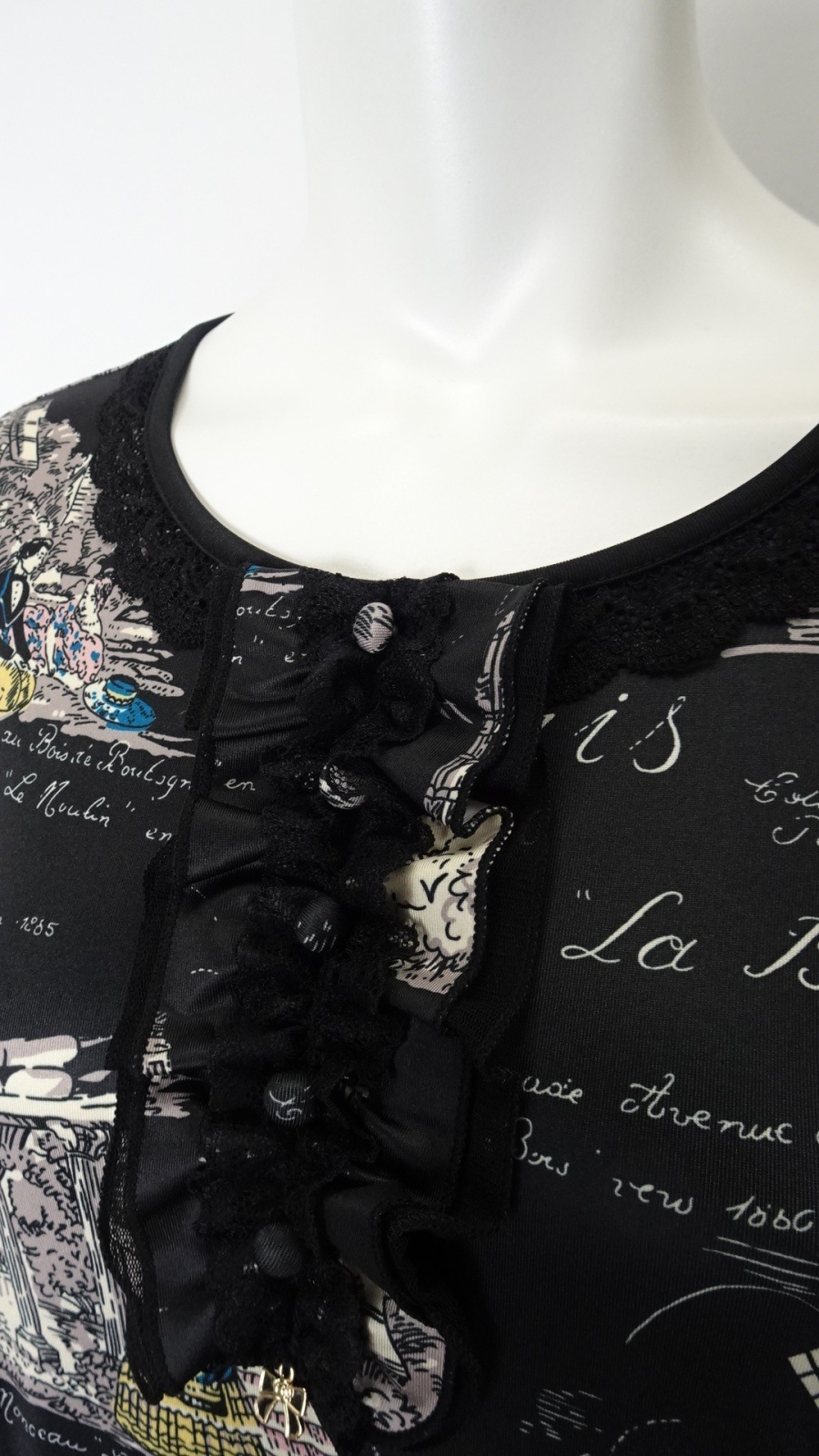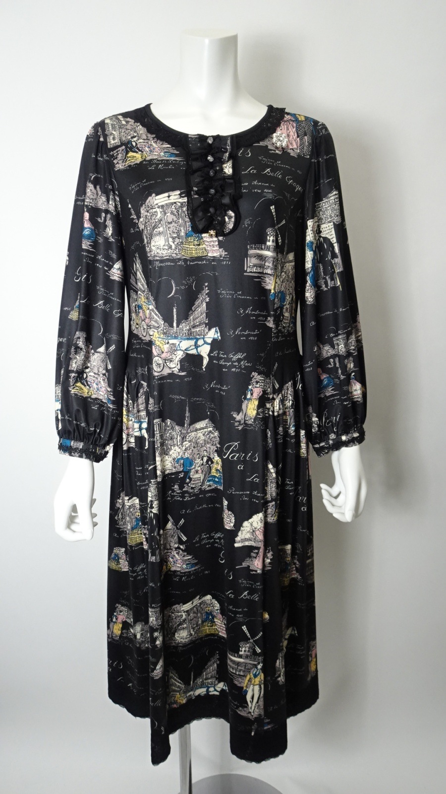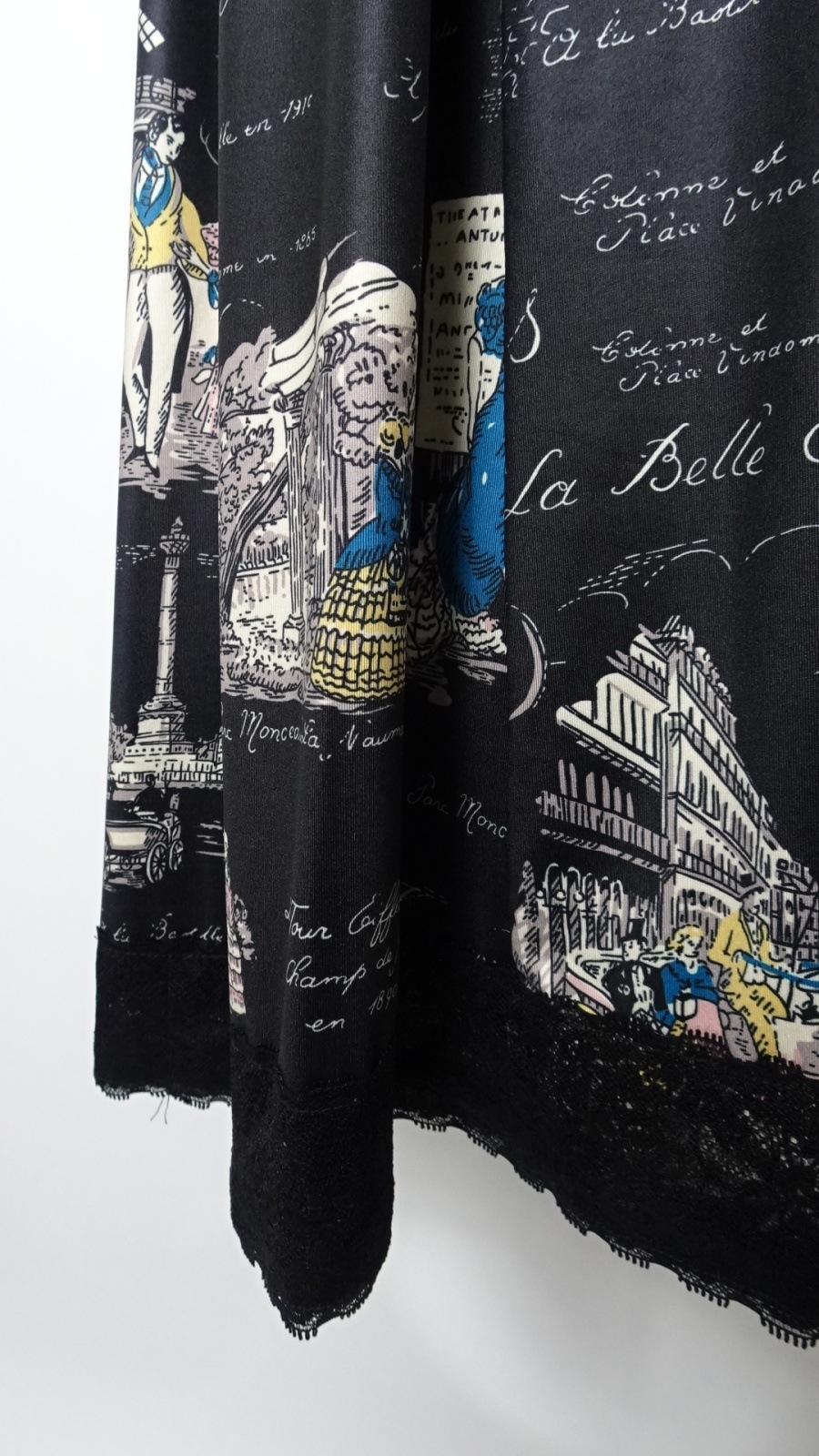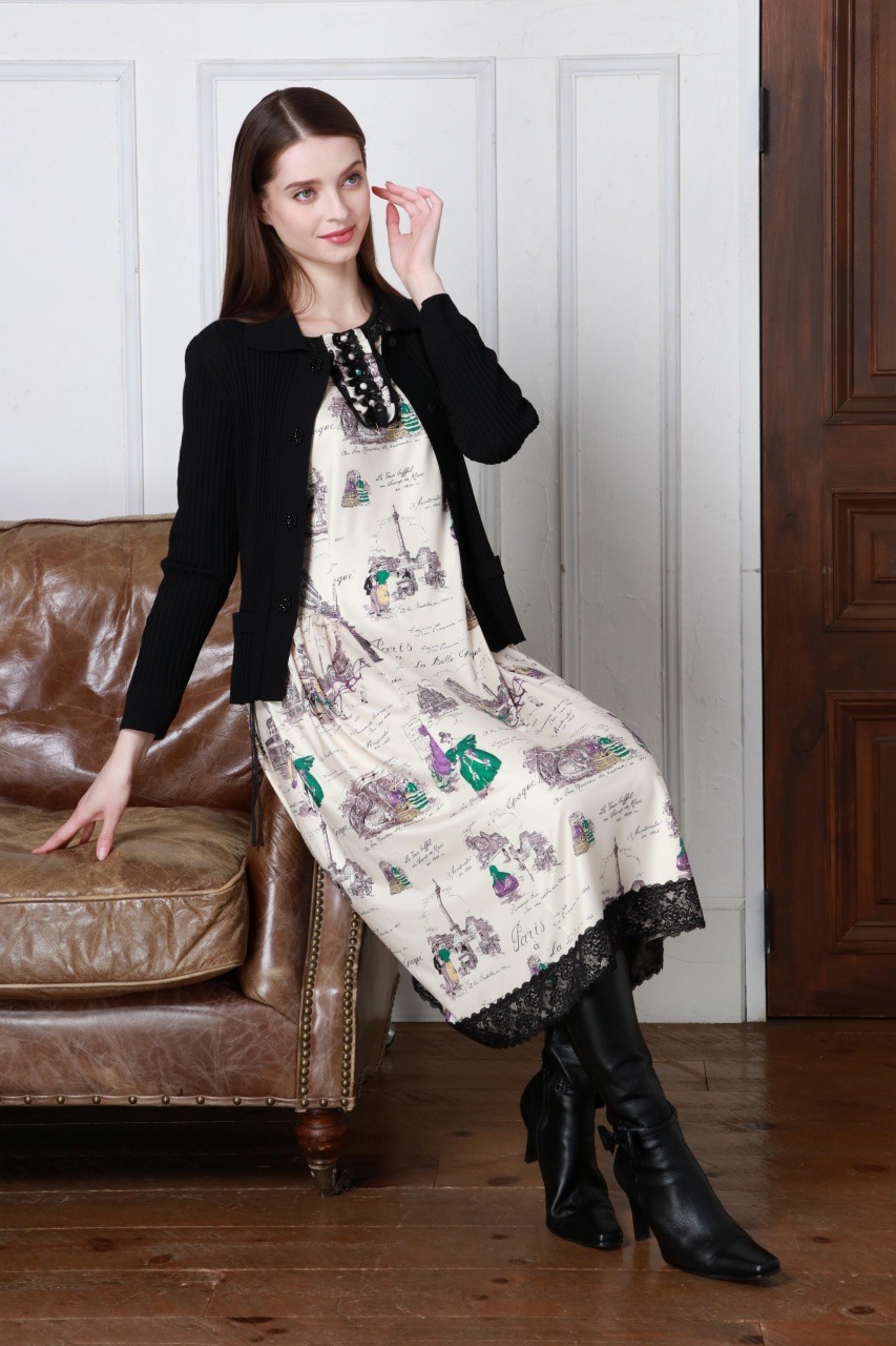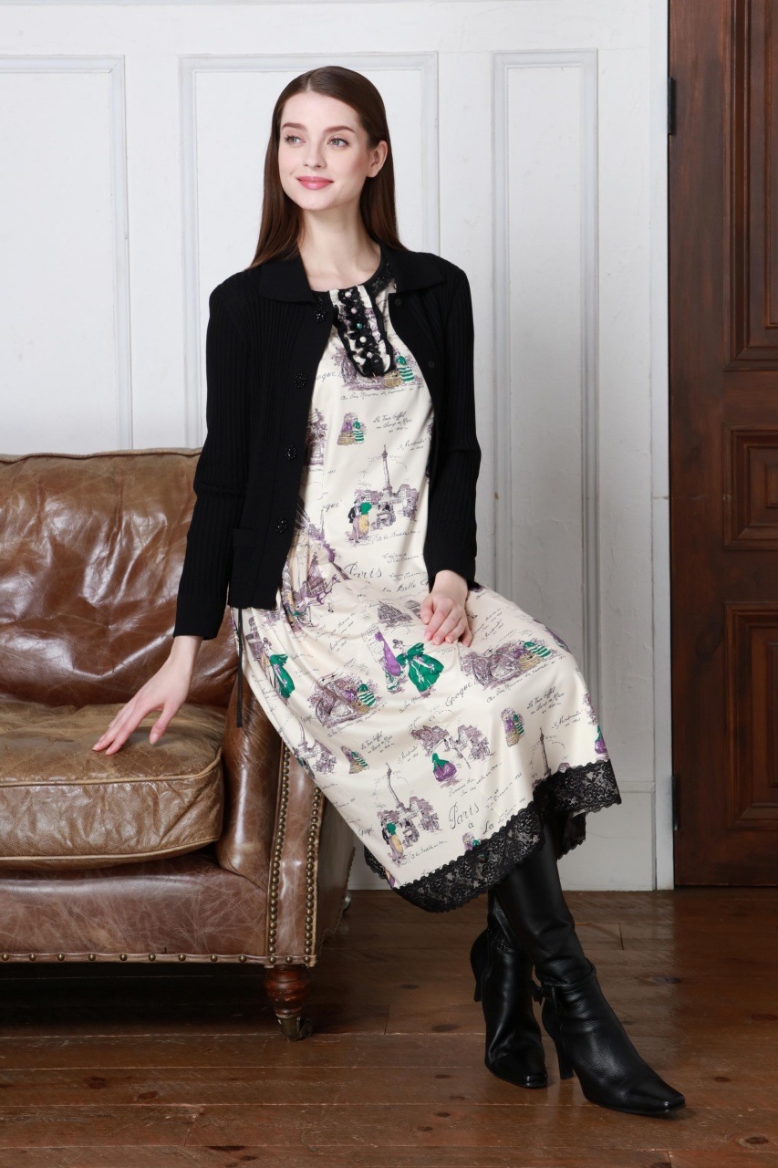 美しい「胸元×裾レースプリントワンピース」は、洗練されたデザインであなたの魅力を引き立てます。胸元には優雅なフリルとビジューが施され、華やかさをプラス。また、袖先にはギャザーデザインが施され、女性らしいシルエットを演出します。クラシック柄のParisをイメージしたプリントです。