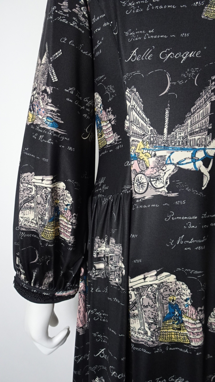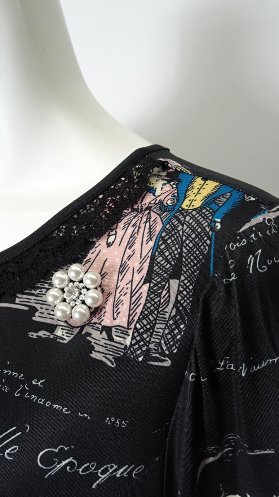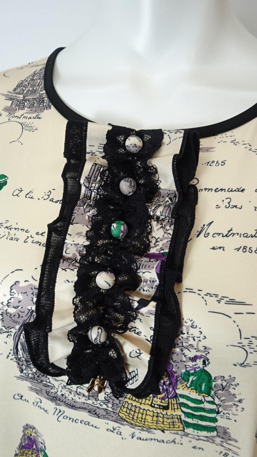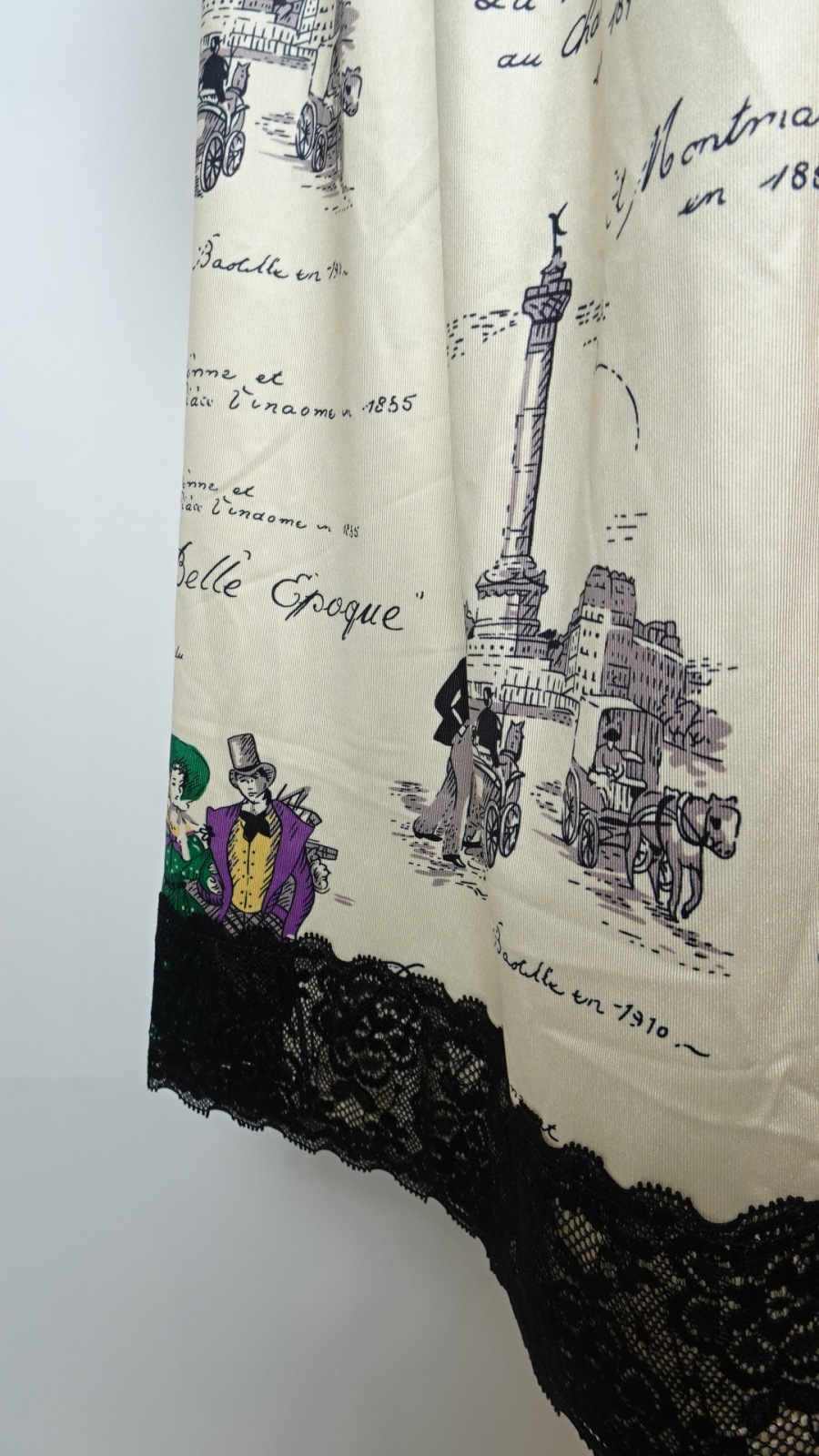 美しい「胸元×裾レースプリントワンピース」は、洗練されたデザインであなたの魅力を引き立てます。胸元には優雅なフリルとビジューが施され、華やかさをプラス。また、袖先にはギャザーデザインが施され、女性らしいシルエットを演出します。クラシック柄のParisをイメージしたプリントです。