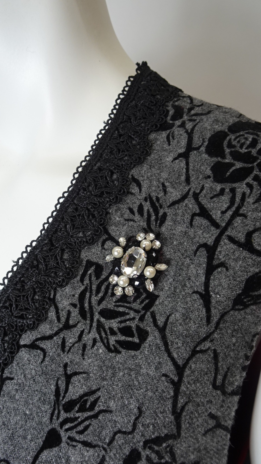 ネックラインにはレースをあしらい、さらにワンポイントのビジューモチーフ使いで、さりげないフェミニンさをプラスしました。