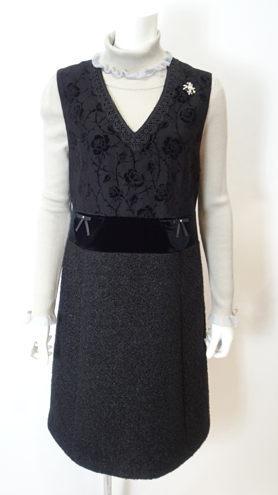 ウエスト部分は異素材で切り替え、両サイドに添えた小ぶりなリボンが可憐な印象を与えてくれます。スカート部分は落ち着いたカラーの無地でまとめ、柄とのコントラストが全体を引き締めます。