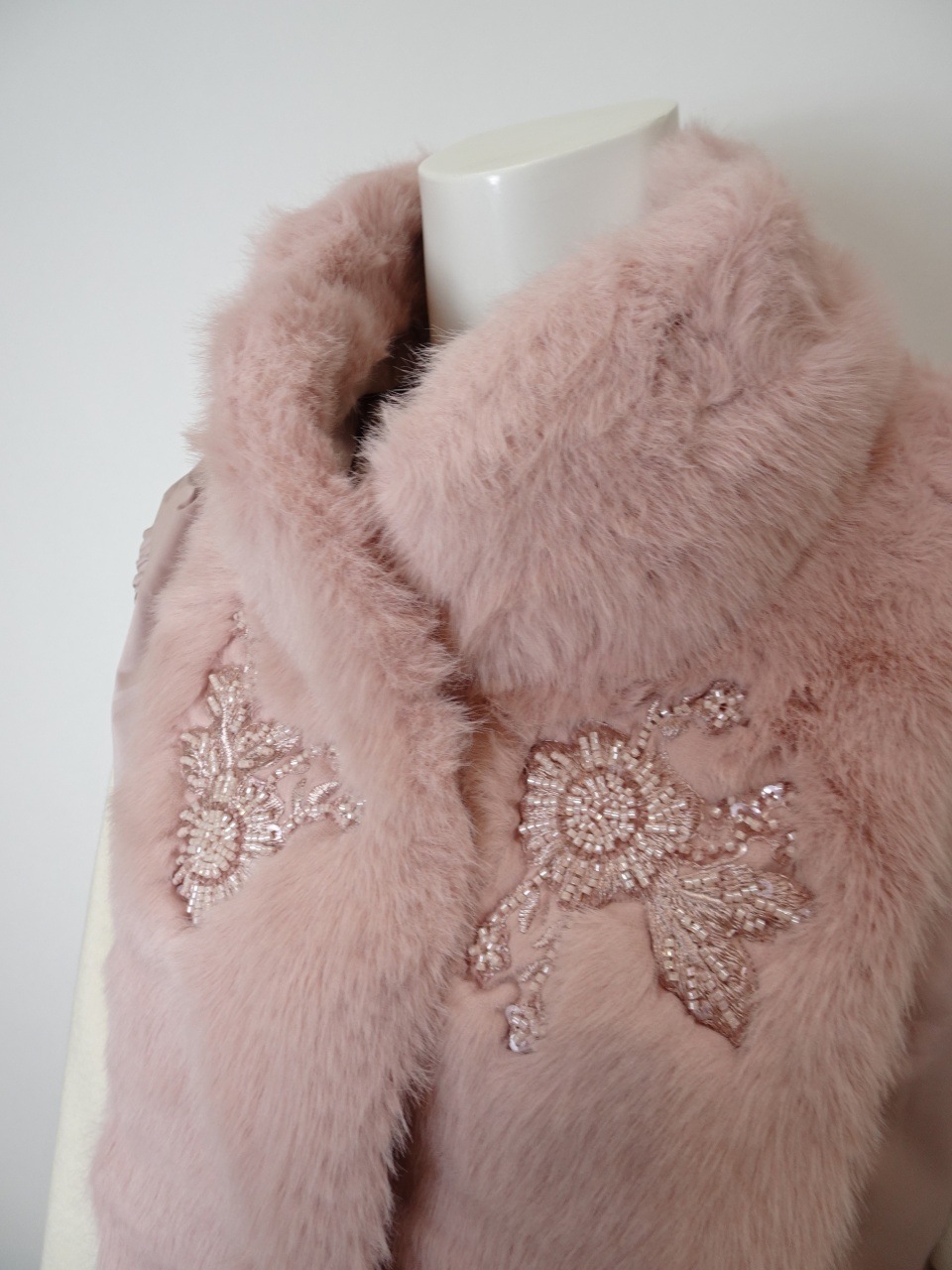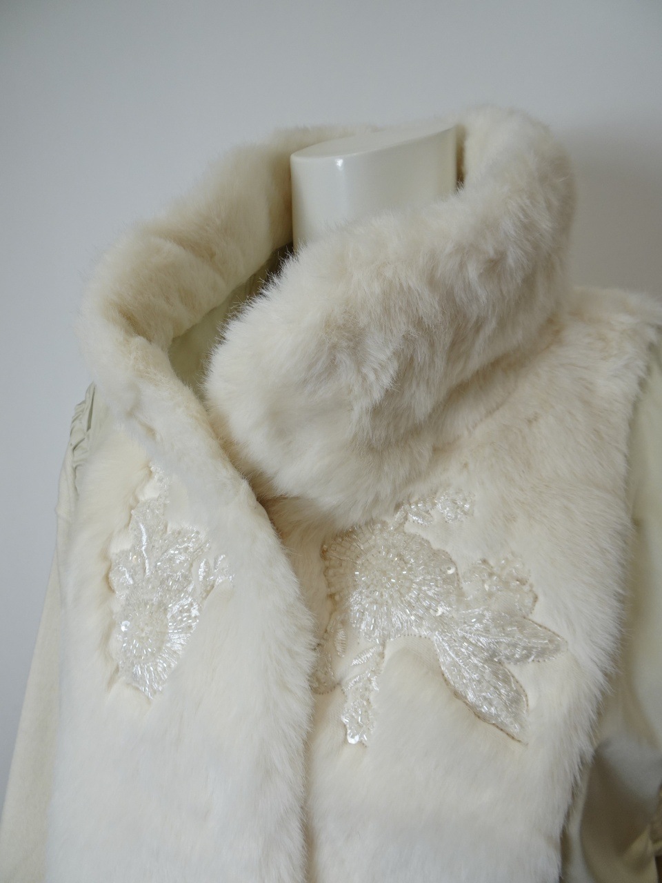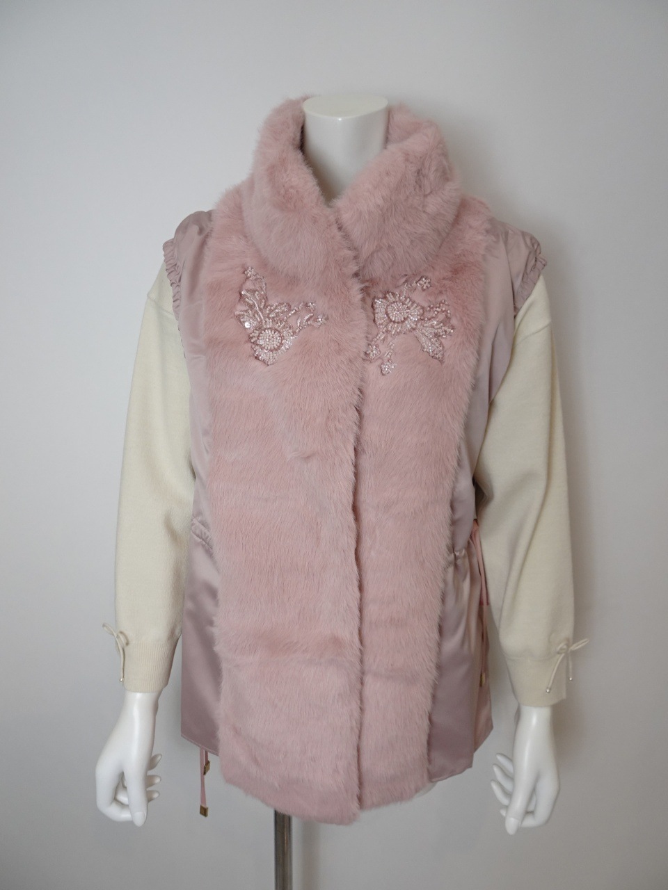 胸元のビーズが華やかさを演出し、立ち襟デザインとリボンで女性らしさを引き立てるベストです。エコファーを使用しているため、軽やかで温かさと柔らかさを備えており、扱いやすく、デイリーにも取り入れやすいのが魅力。重ねるアイテム次第で、ロングシーズン活躍します。羽織るだけで存在感を放ち、コーディネートの主役になること間違いなしです。