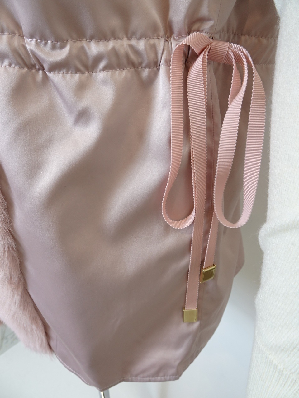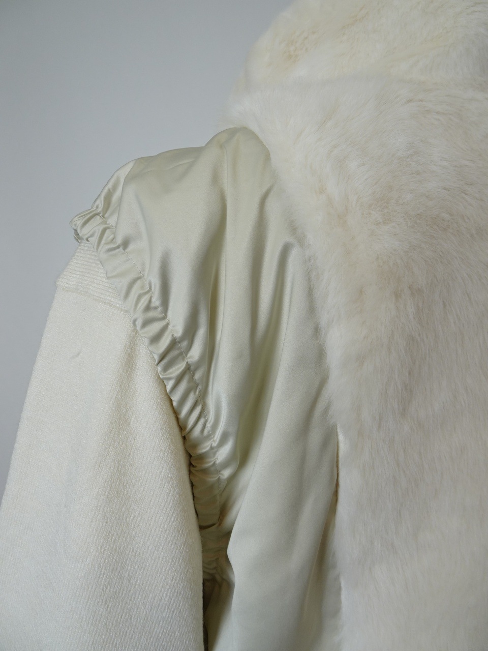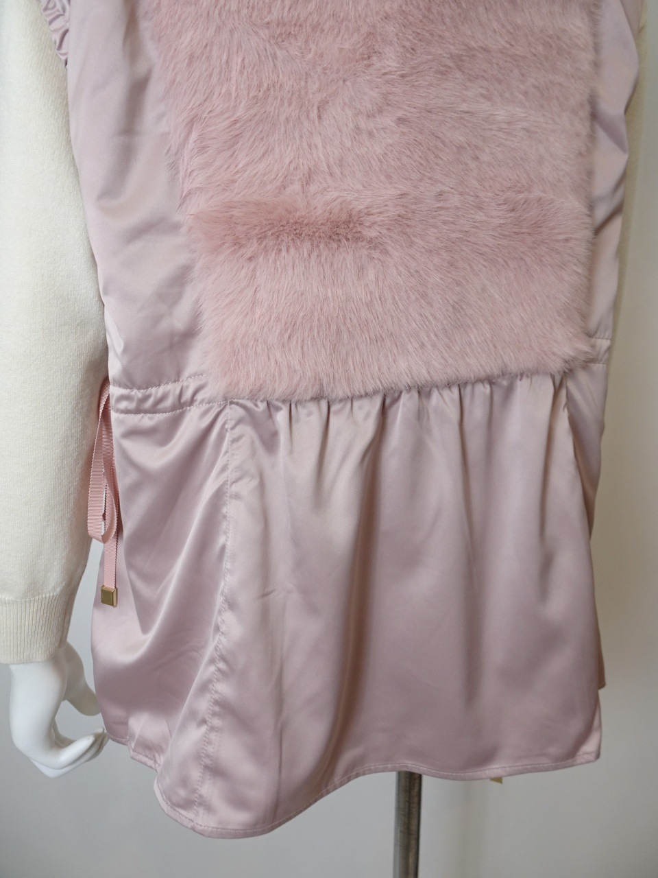 胸元のビーズが華やかさを演出し、立ち襟デザインとリボンで女性らしさを引き立てるベストです。エコファーを使用しているため、軽やかで温かさと柔らかさを備えており、扱いやすく、デイリーにも取り入れやすいのが魅力。重ねるアイテム次第で、ロングシーズン活躍します。羽織るだけで存在感を放ち、コーディネートの主役になること間違いなしです。