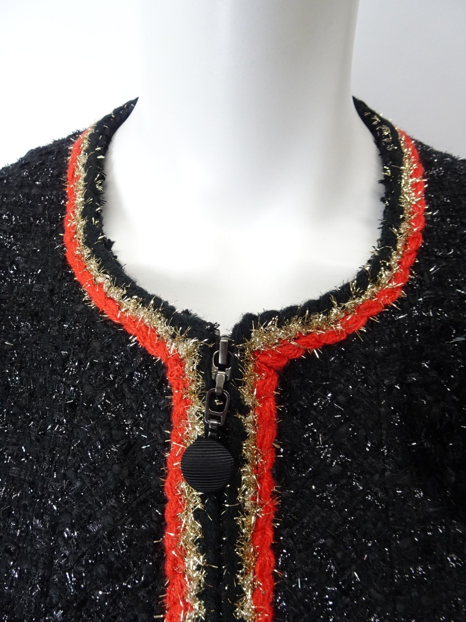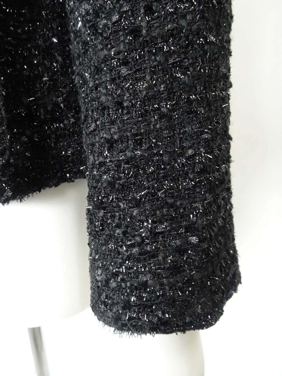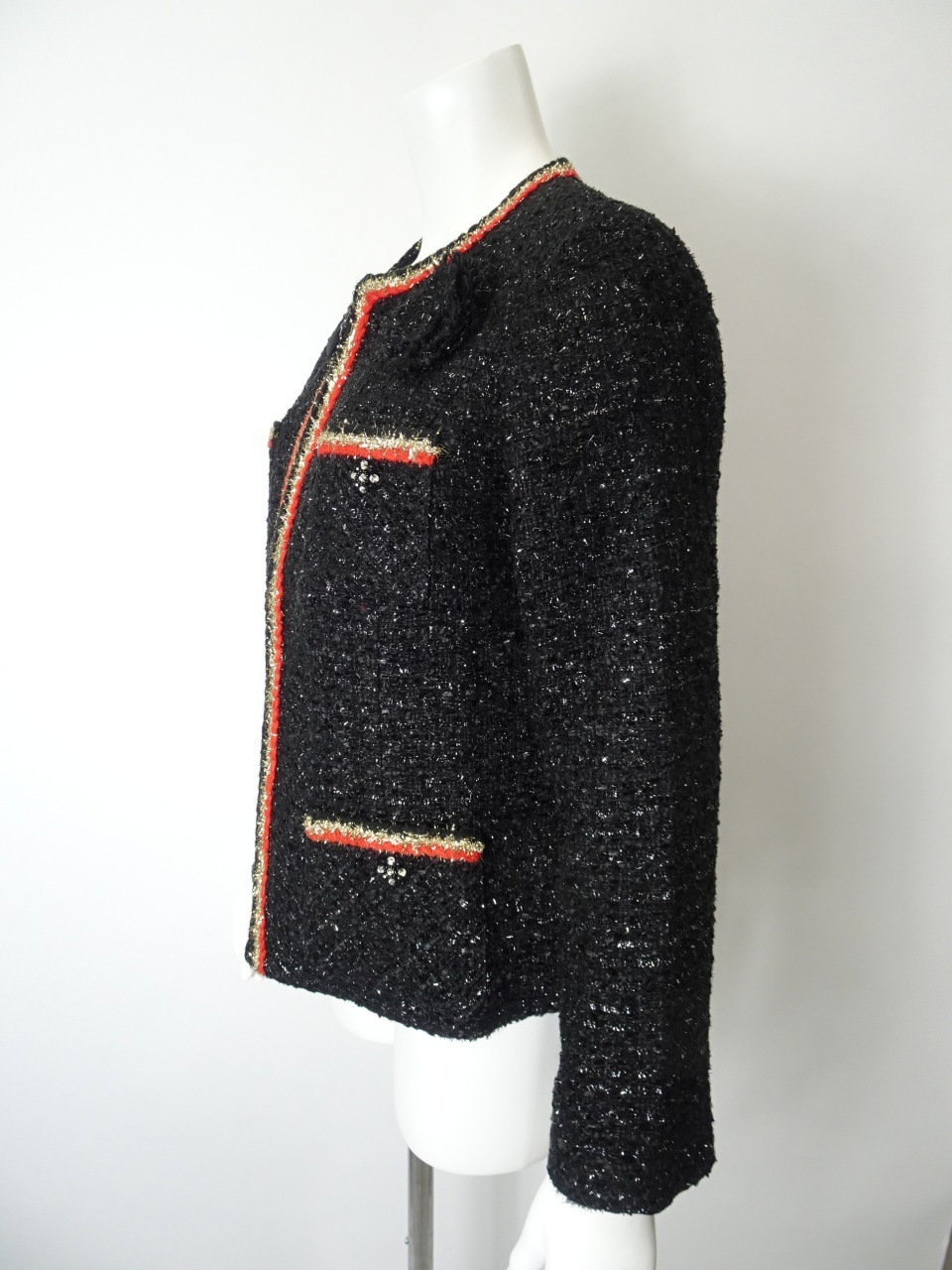 煌めきを感じるツイード生地を使用し、ラグジュアリーな印象を与えてくれます。シャネルタイプのデザインは、時代を超えたエレガンスを演出します。