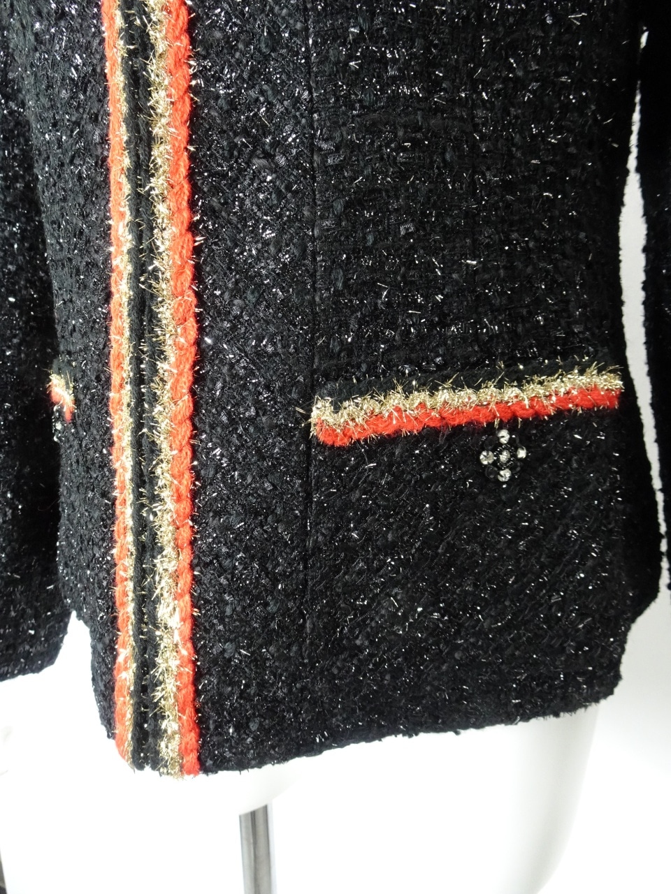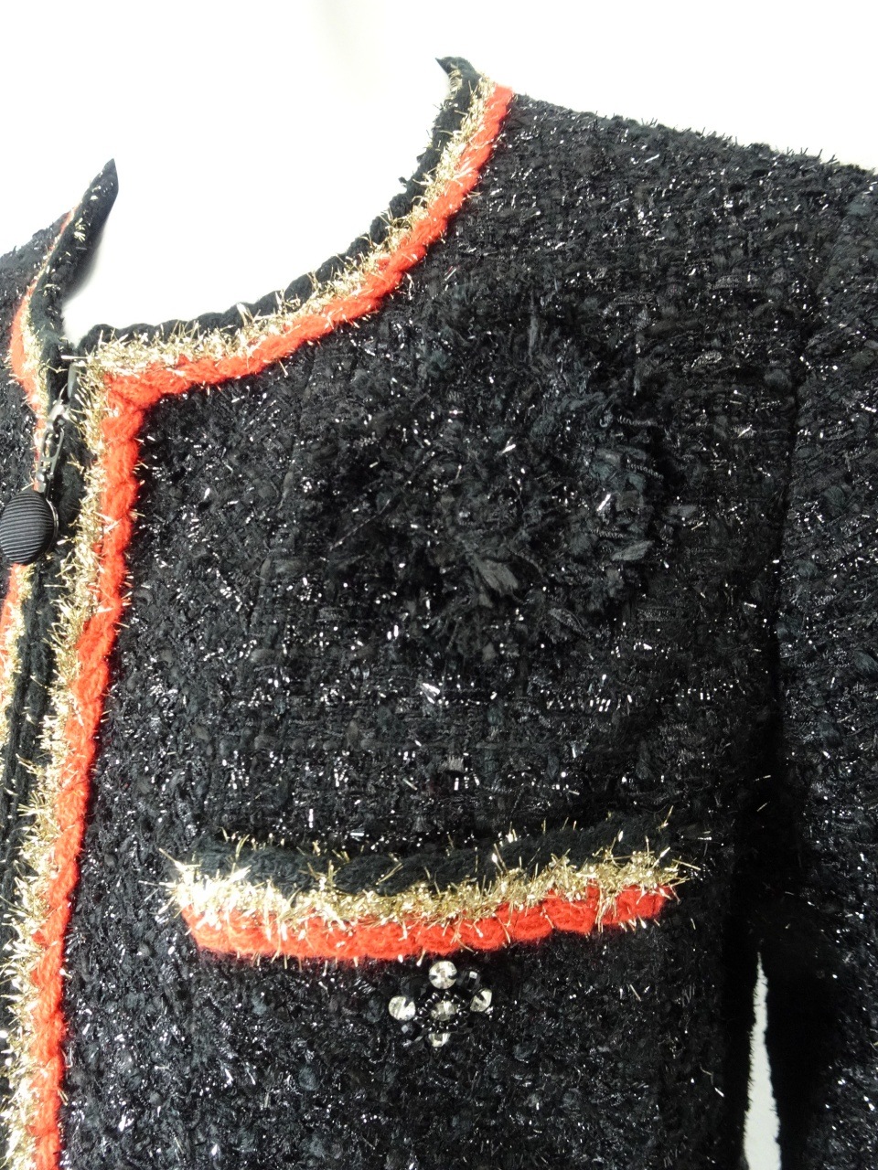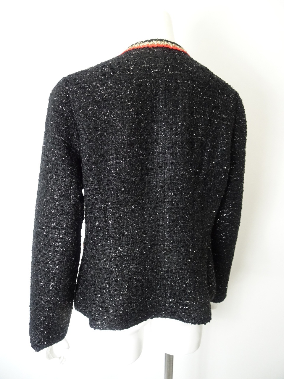 煌めきを感じるツイード生地を使用し、ラグジュアリーな印象を与えてくれます。シャネルタイプのデザインは、時代を超えたエレガンスを演出します。