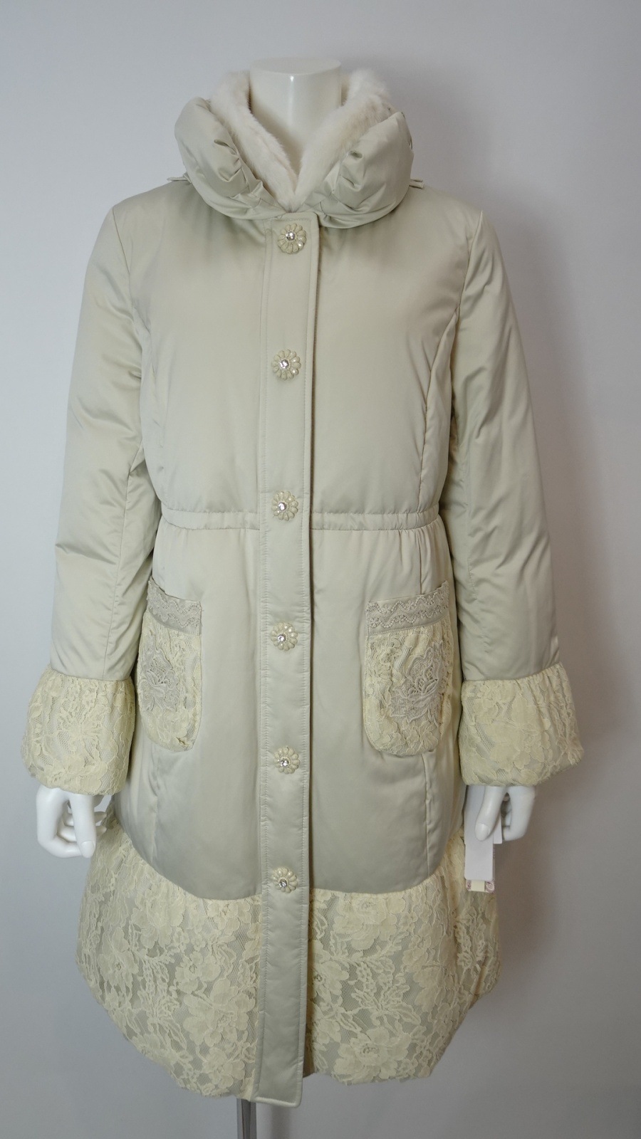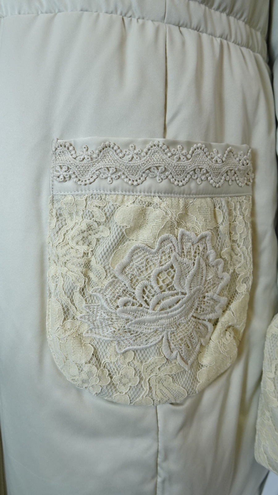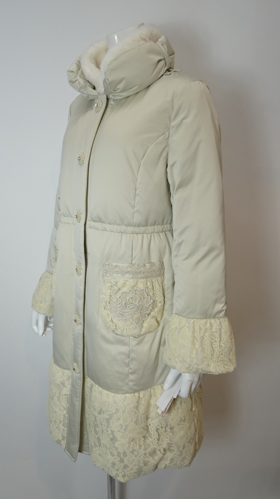 裾・袖・ポケットに繊細なレースをあしらい、軽やかな切替が冬の装いに華やぎを添えるエレガントなダウンコート。フロントには花のようなフォルムのボタンを並べ、さりげない可愛らしさをプラスしました。襟元にはふんわりとしたボアを重ね、暖かさと上品さを両立し、シーズンムードを演出。まさに大人の女性にふさわしい、洗練された一着です。ディテールまでこだわったデザインで、普段使いから特別なシーンまで幅広く着用いただけます。