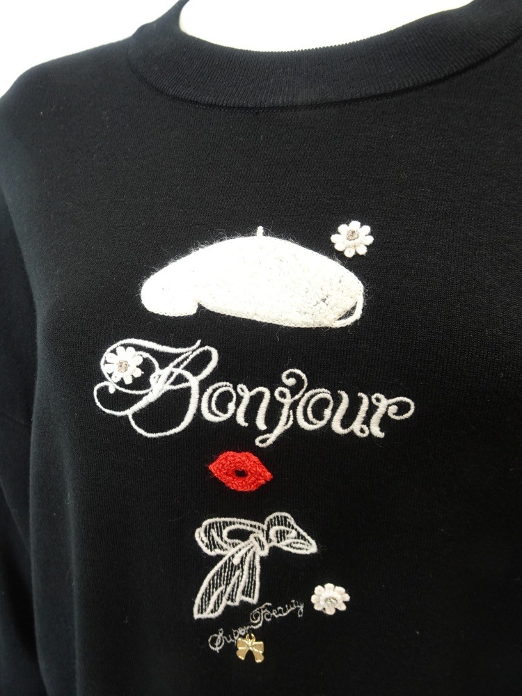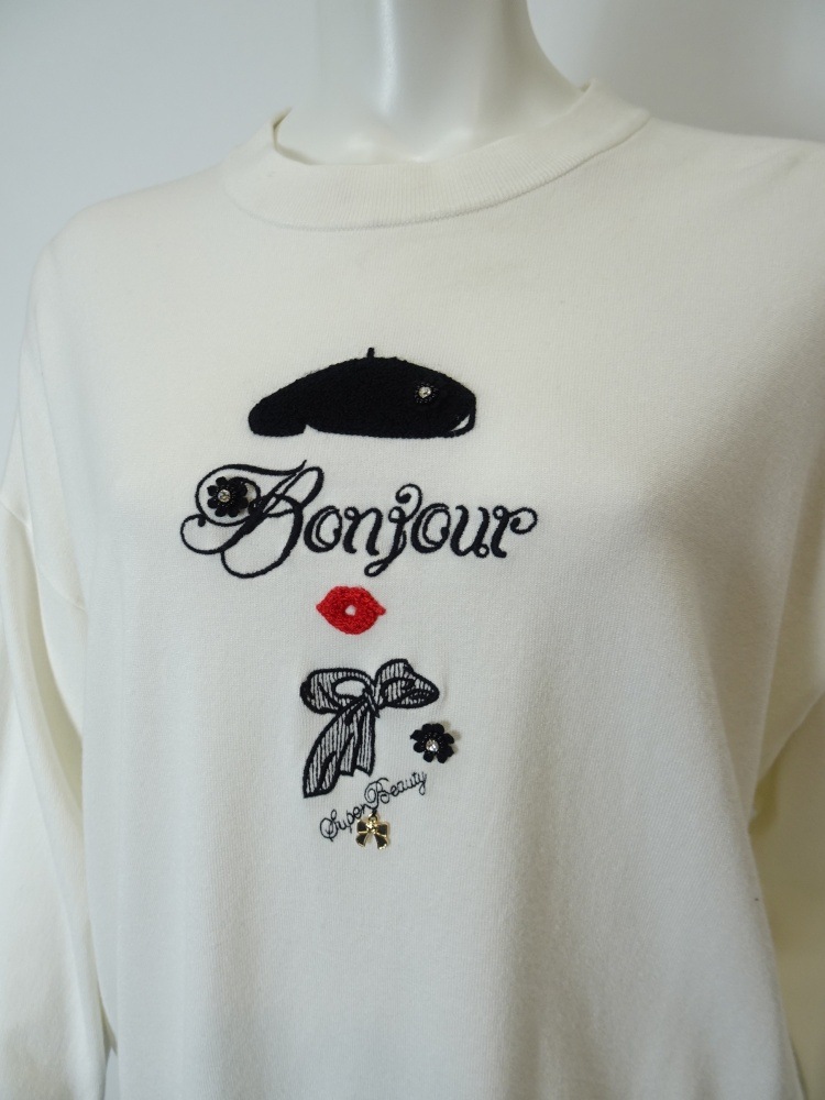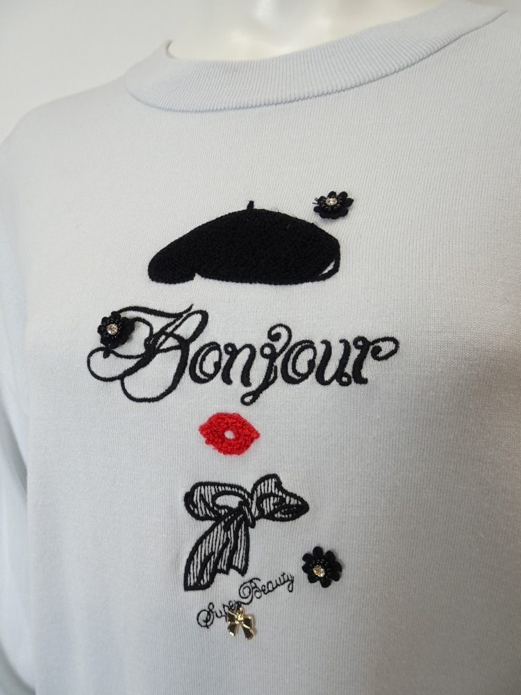 「Bonjour」やベレー帽、リップ、スカーフなど、フレンチムード漂うデザイン。