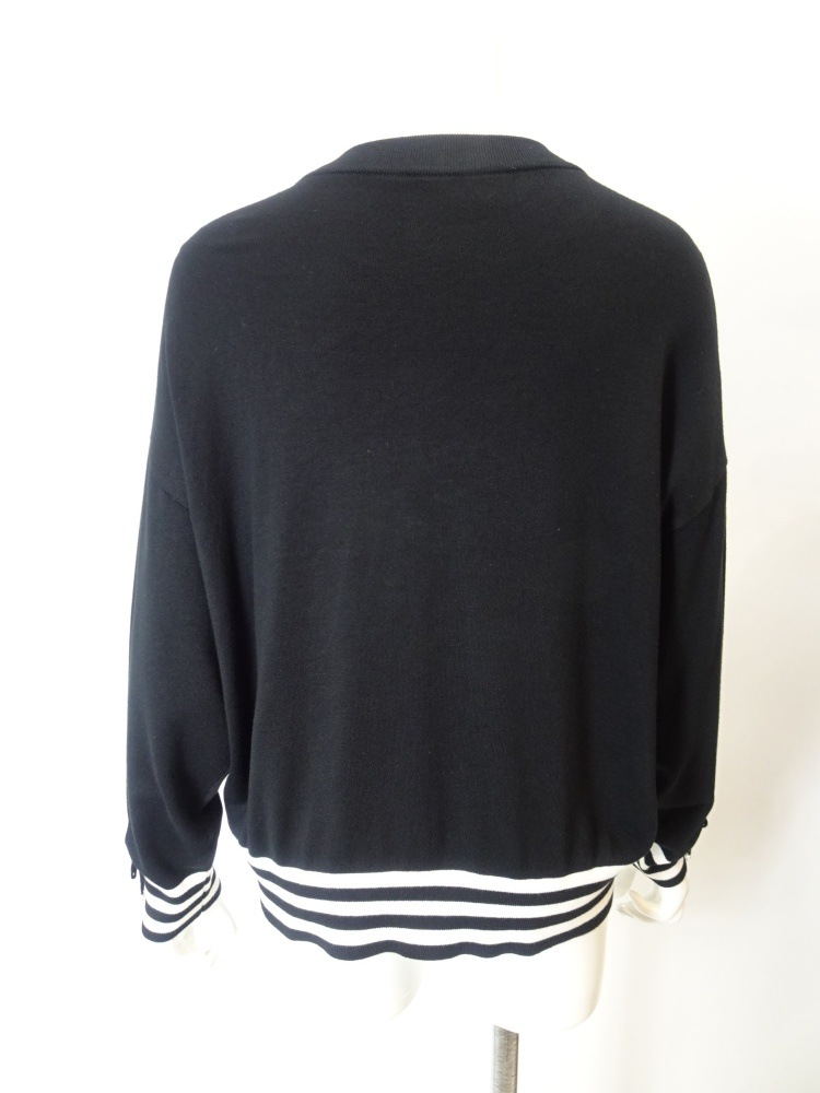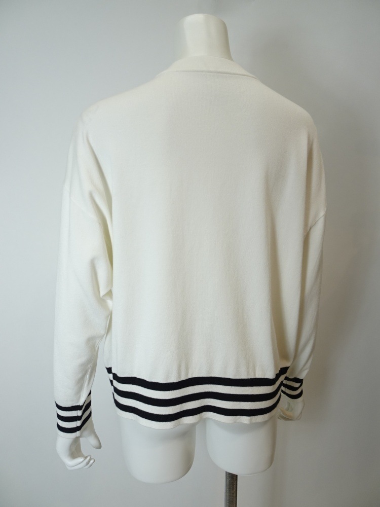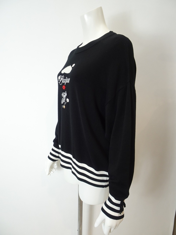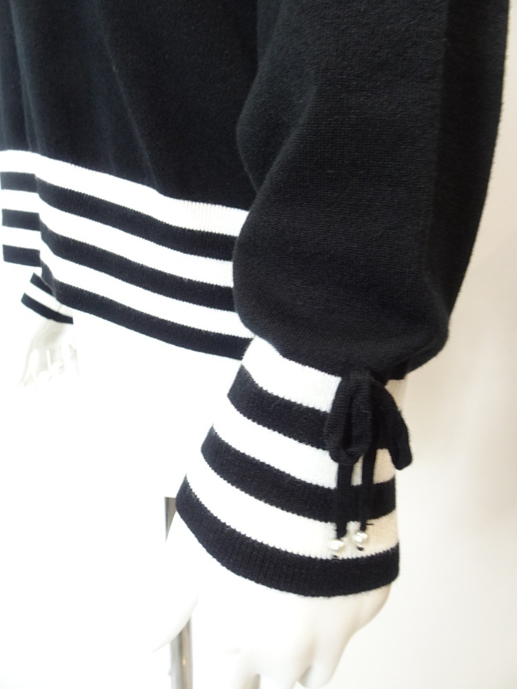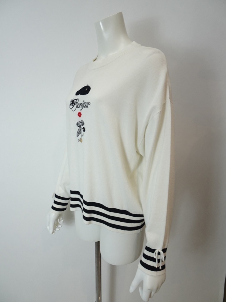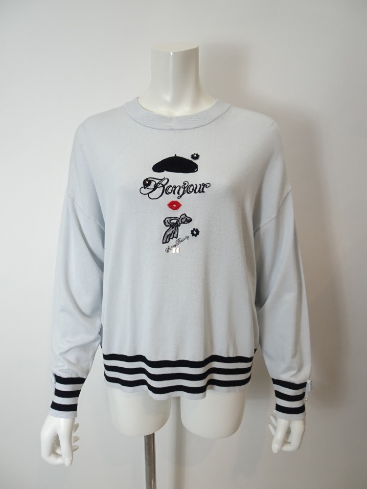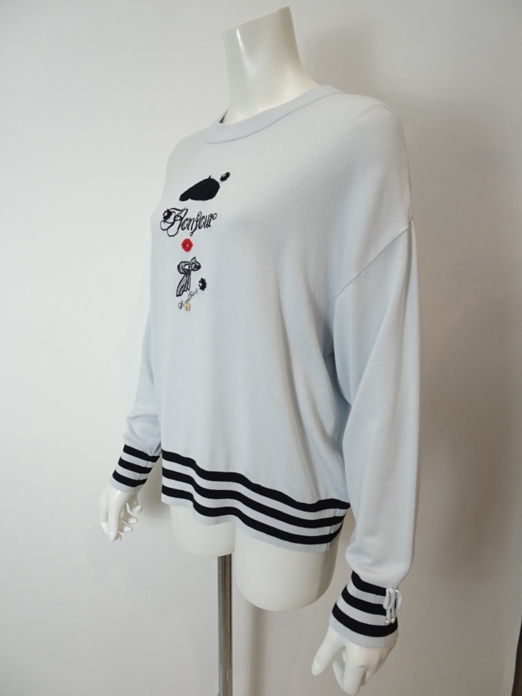袖口のリボン×ボーダー、そして裾にもあしらわれたボーダーが全体をすっきりと引き締め、フロントの刺繍モチーフがほんのりと可愛らしさを添えます。