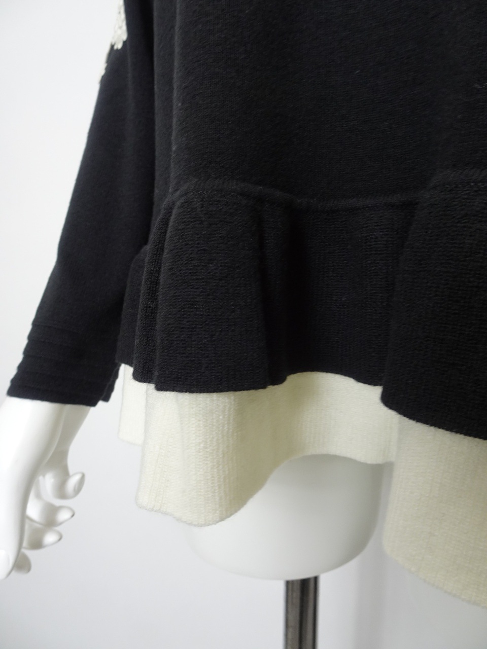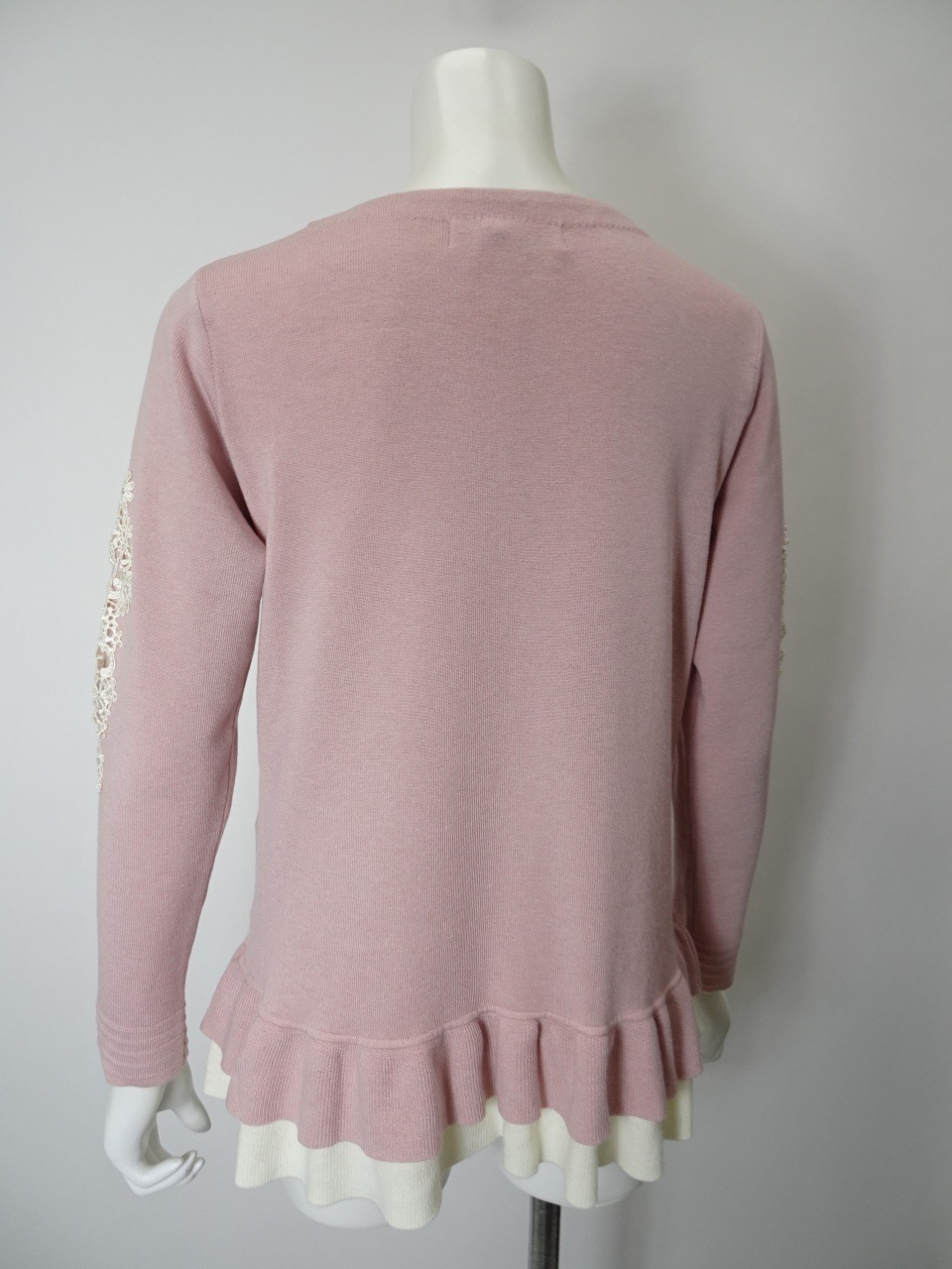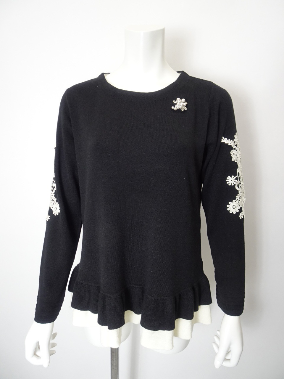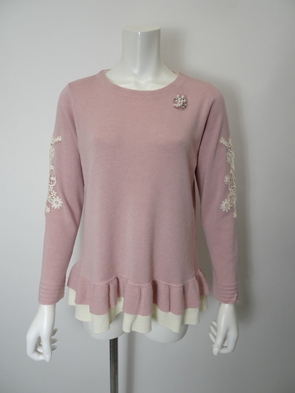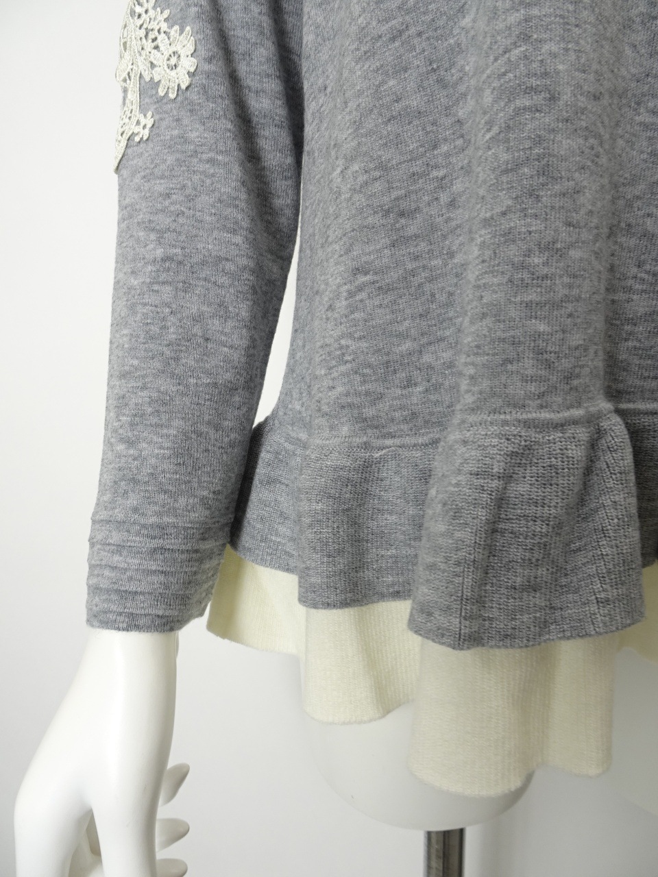 繊細なレースをあしらった袖が、手元に華やぎを添える一枚。裾には配色の2重フリルを施し、やさしく広がるシルエットが、柔らかな印象を与えてくれます。