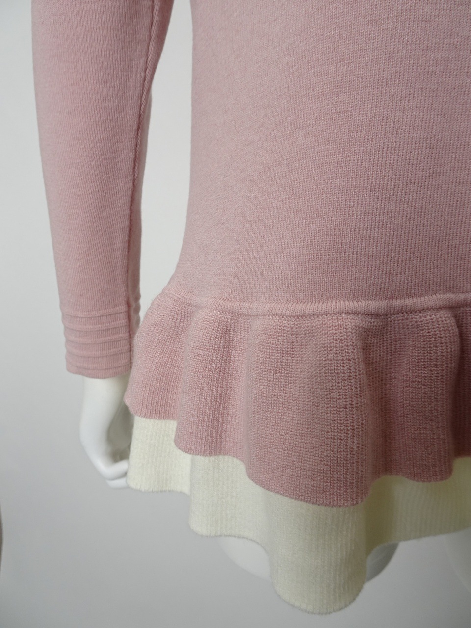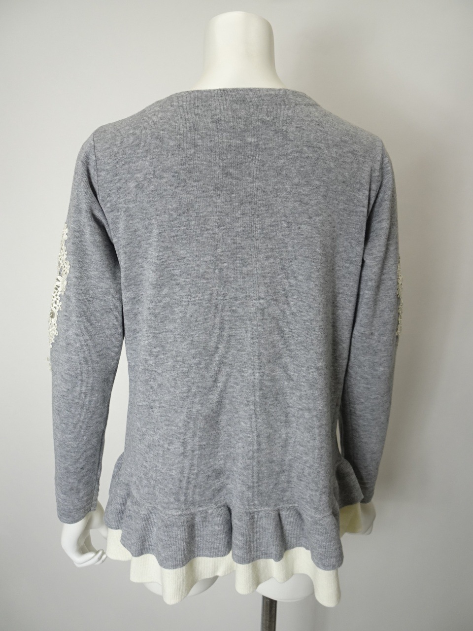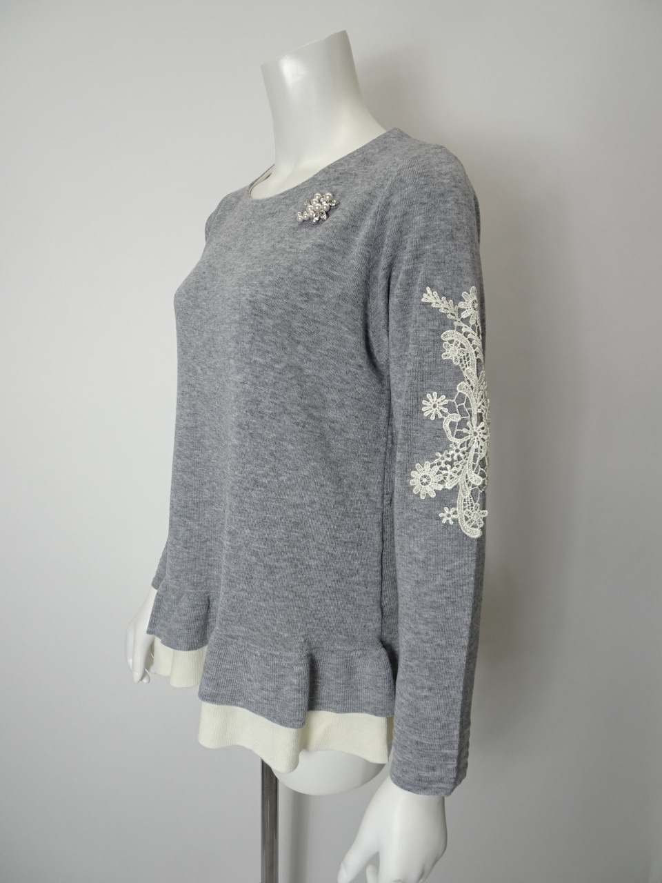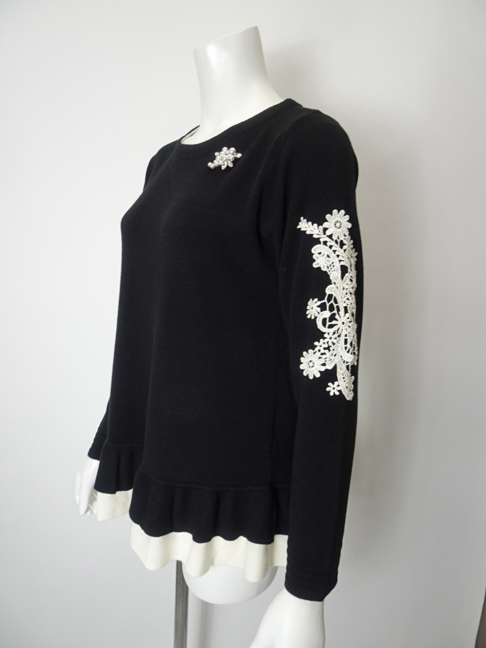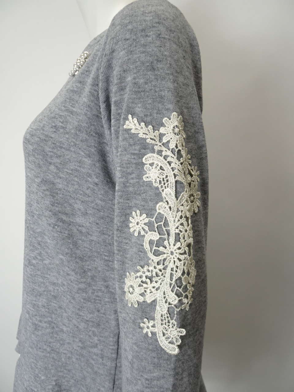 繊細なレースをあしらった袖が、手元に華やぎを添える一枚。裾には配色の2重フリルを施し、やさしく広がるシルエットが、柔らかな印象を与えてくれます。