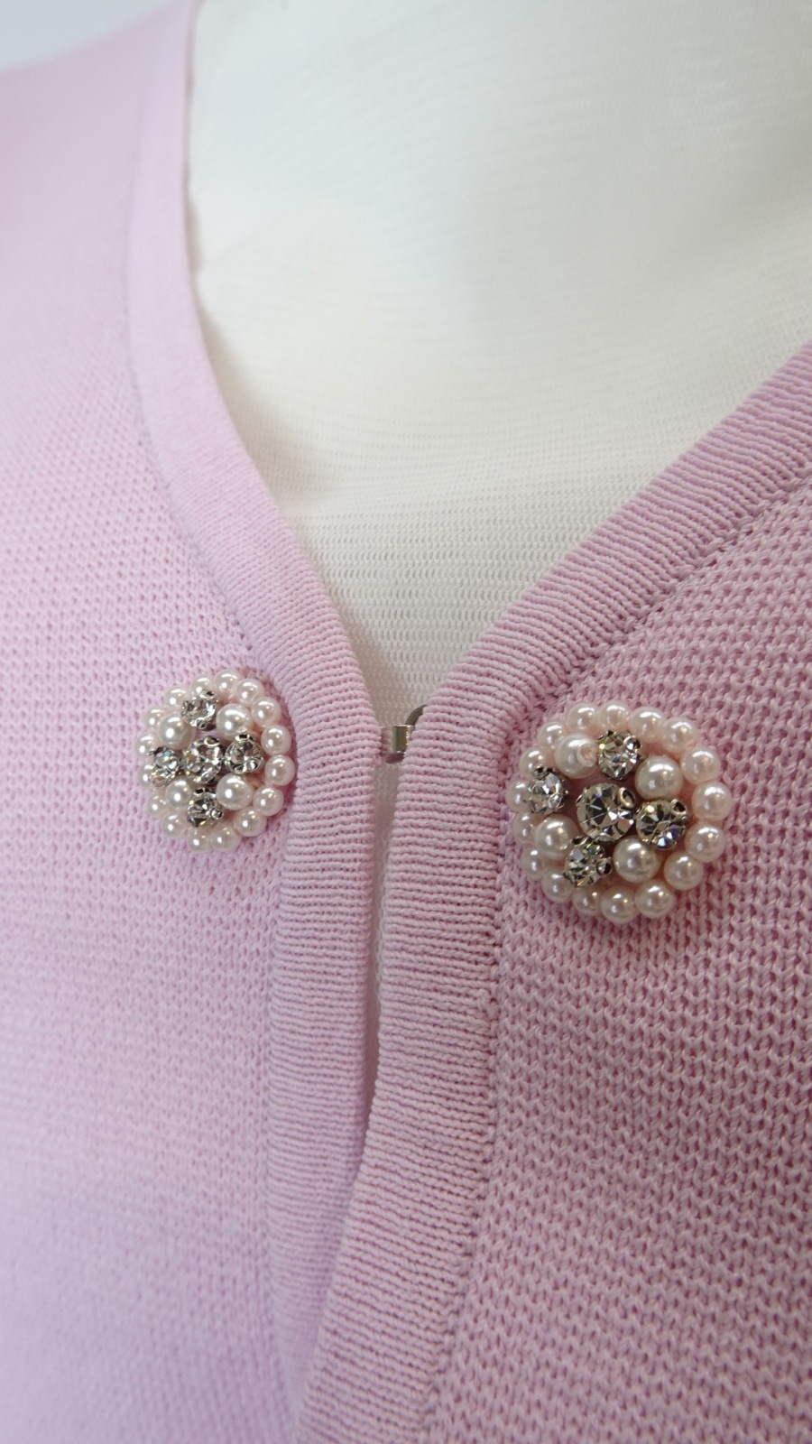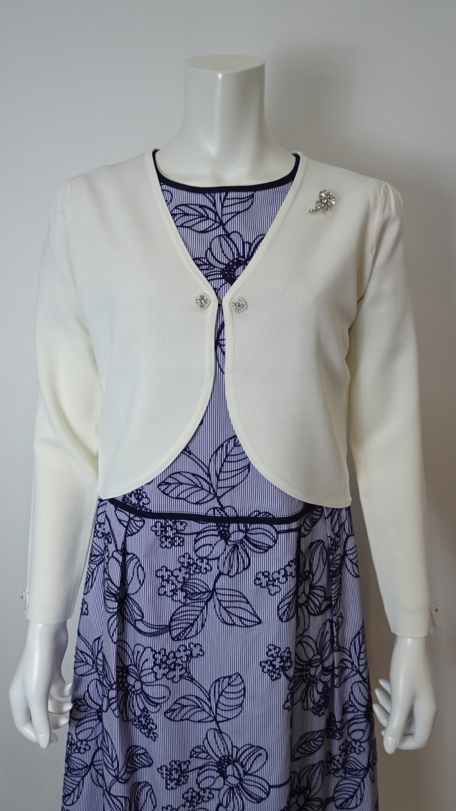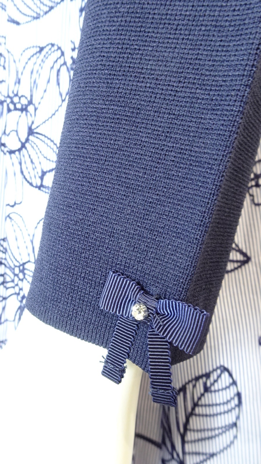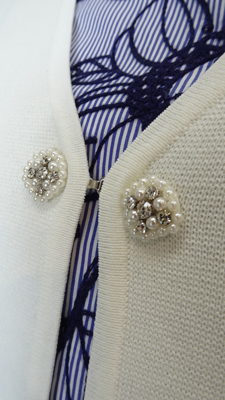 胸元にはお花のビジューモチーフが輝き、女性らしさをプラス。さらに、ジュエルボタンが印象的で豪華さを添え、全体を華やかに仕上げます。袖口には可愛らしいリボンをあしらい、細部まで