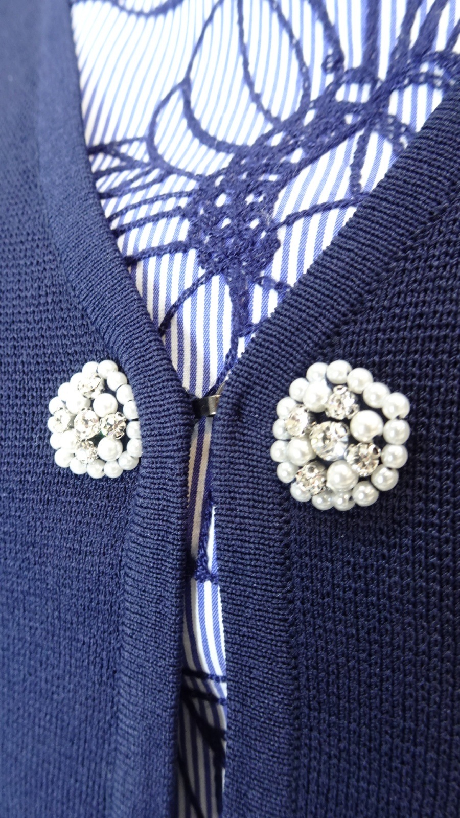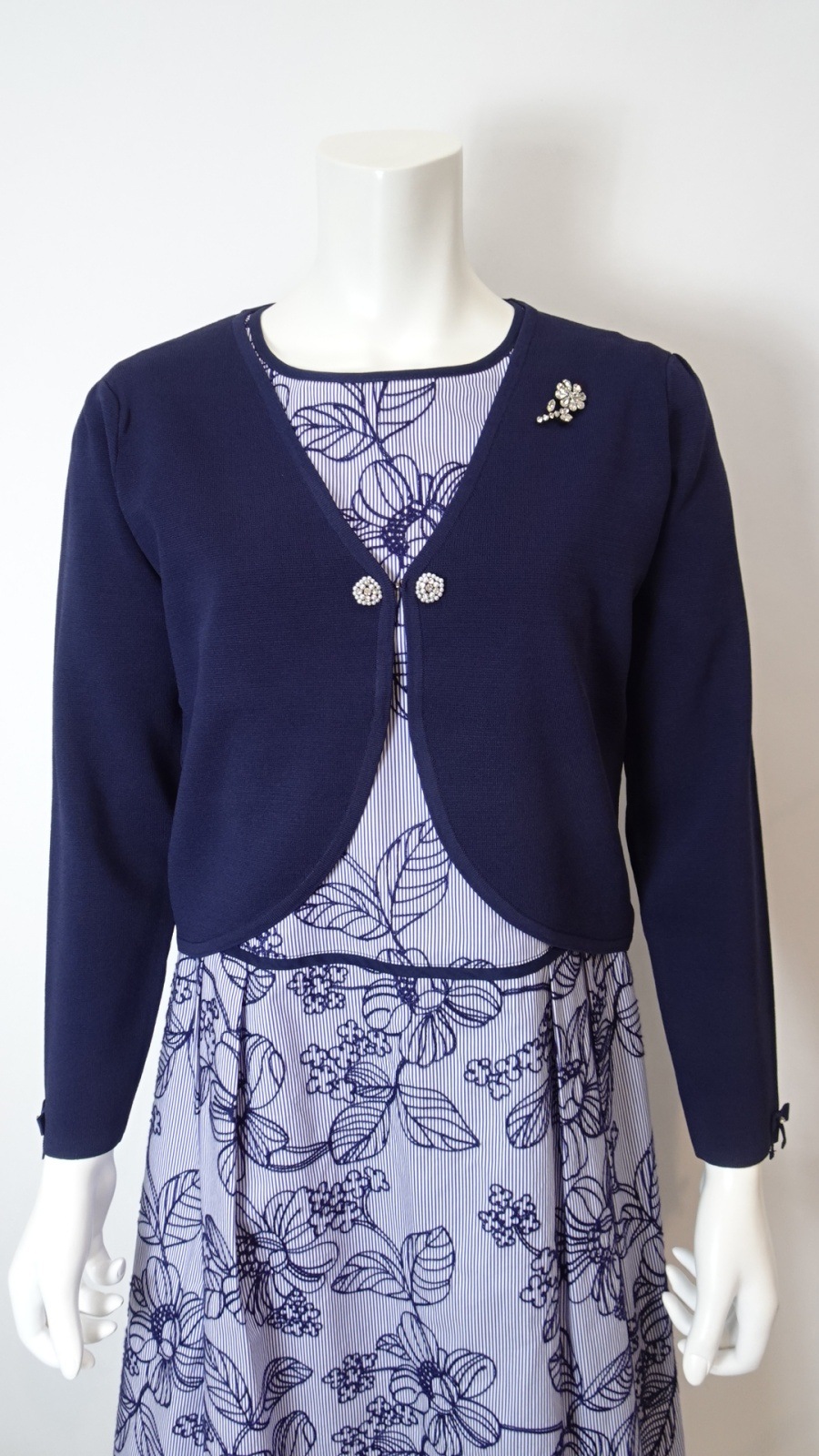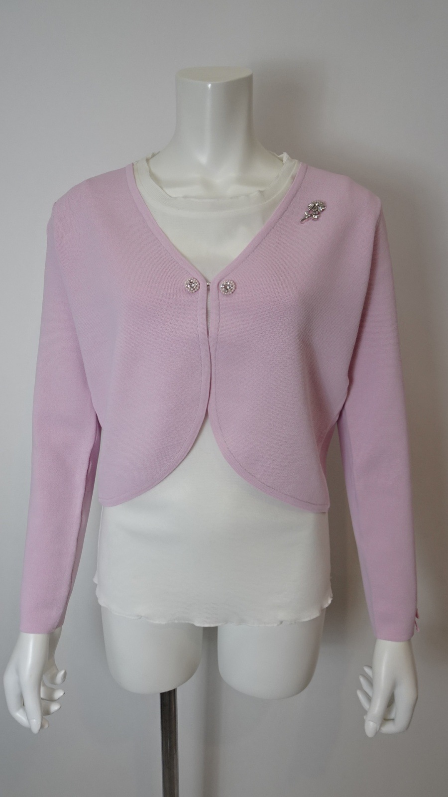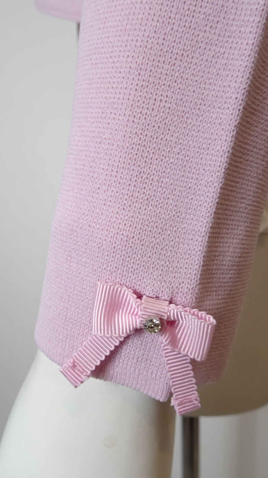 胸元にはお花のビジューモチーフが輝き、女性らしさをプラス。さらに、ジュエルボタンが印象的で豪華さを添え、全体を華やかに仕上げます。袖口には可愛らしいリボンをあしらい、細部まで