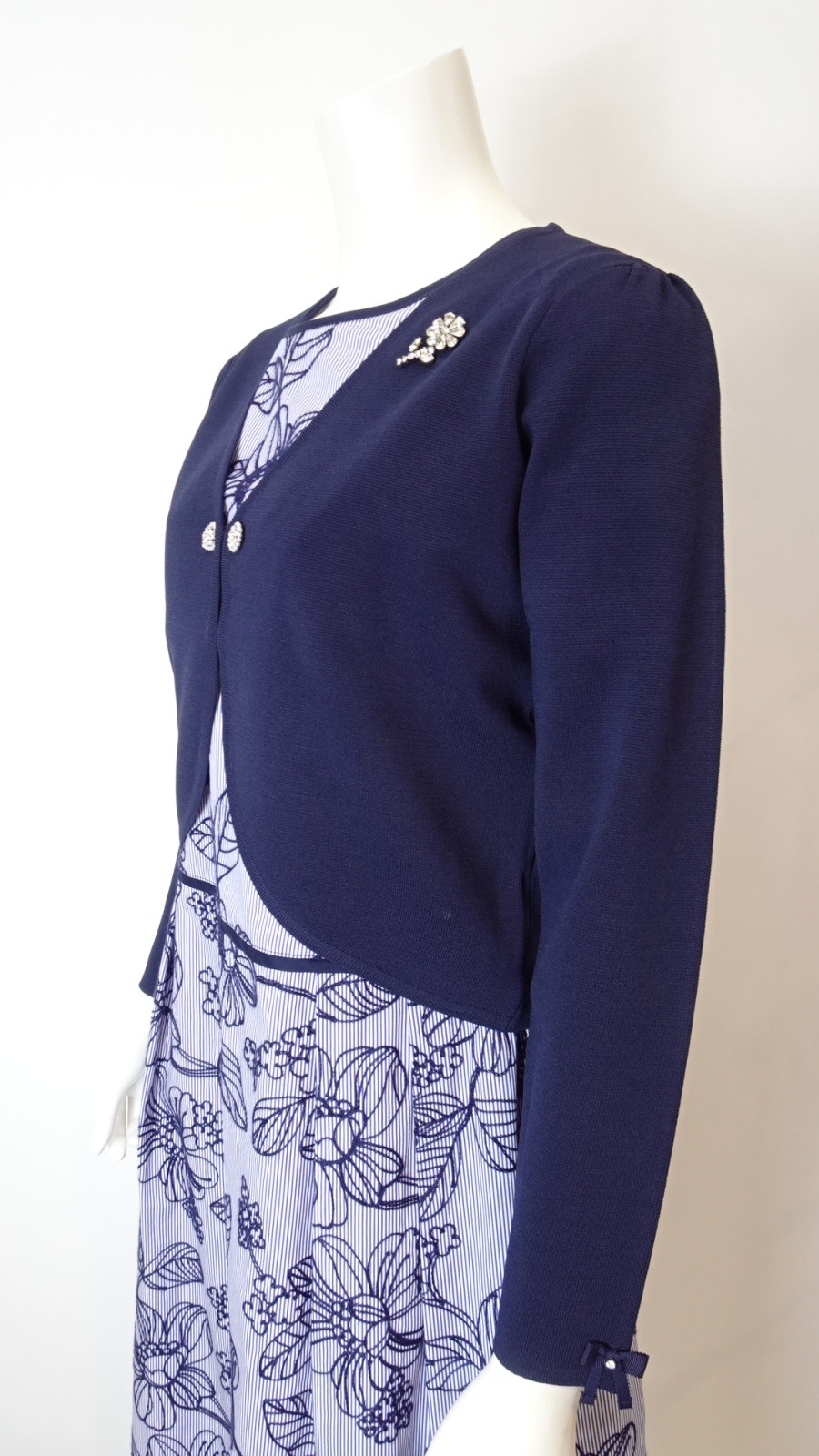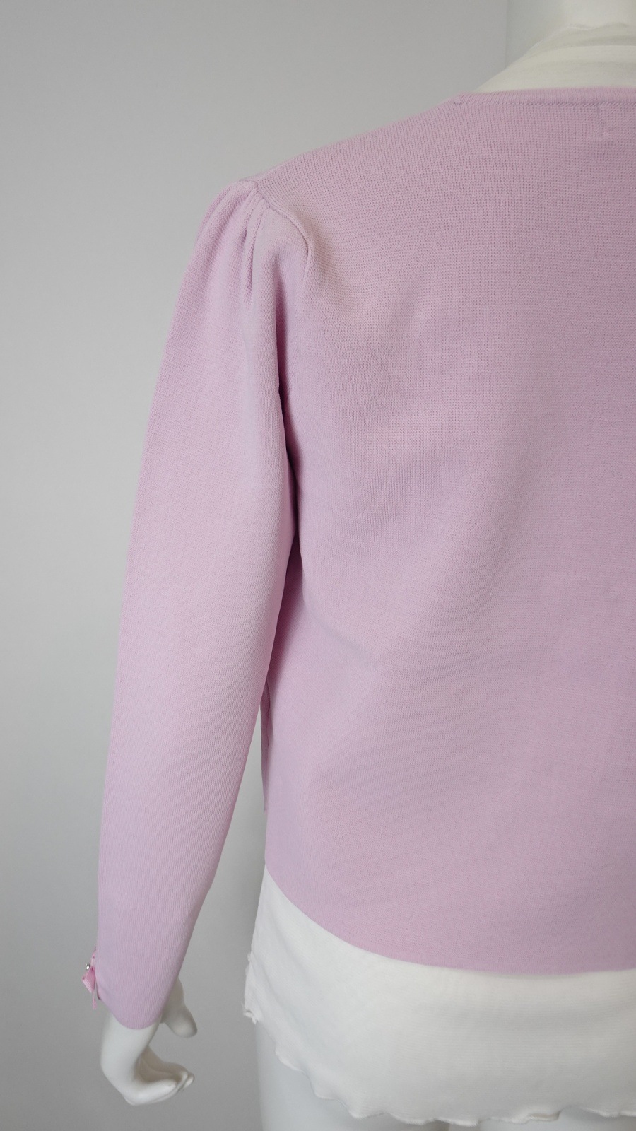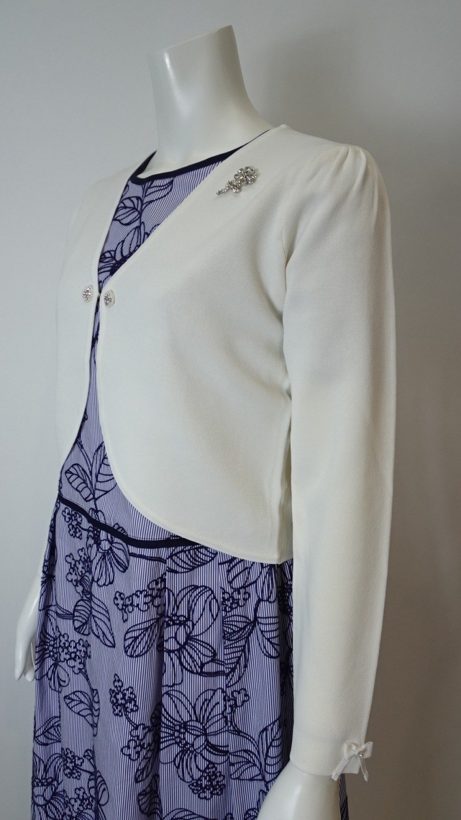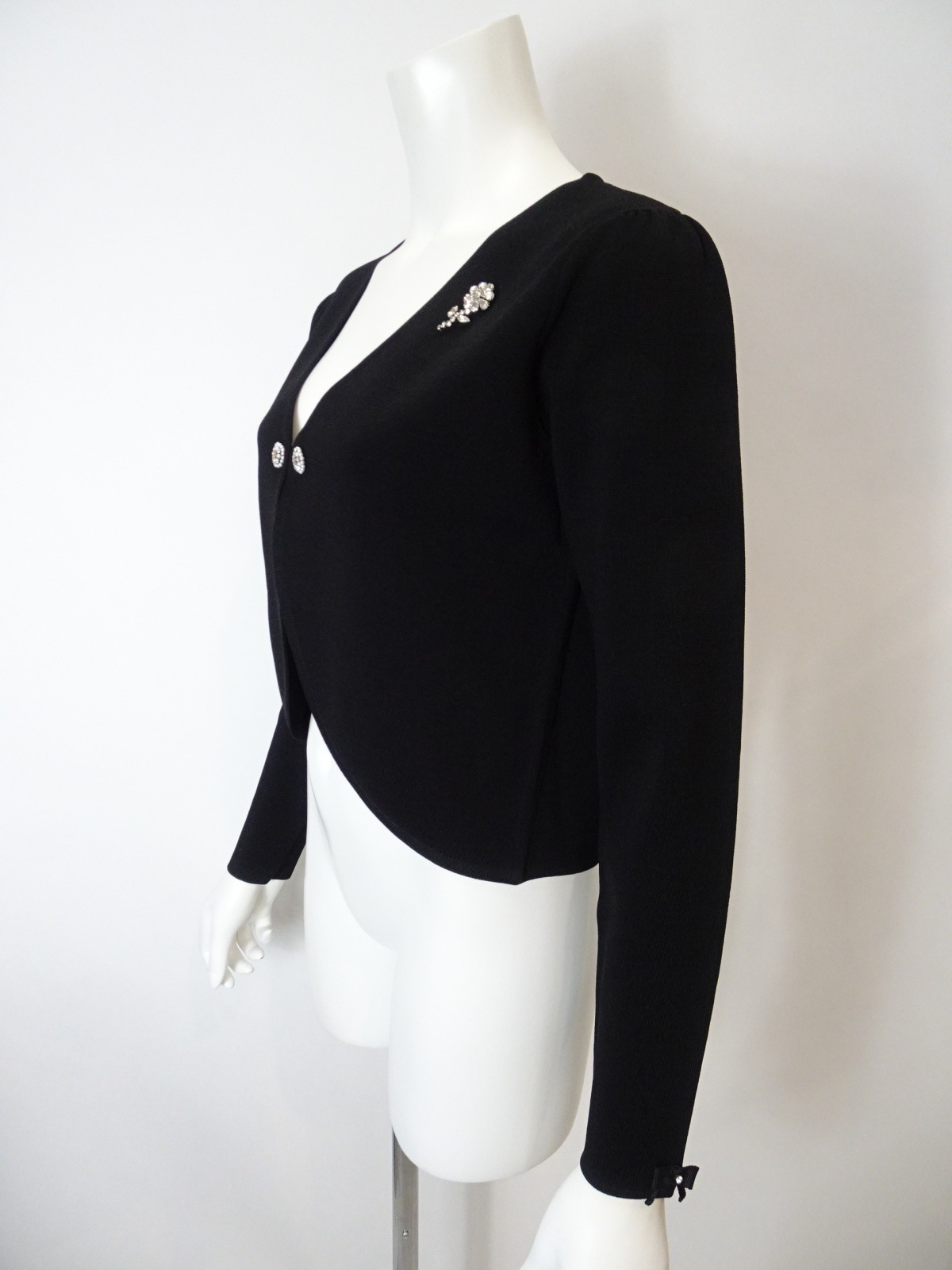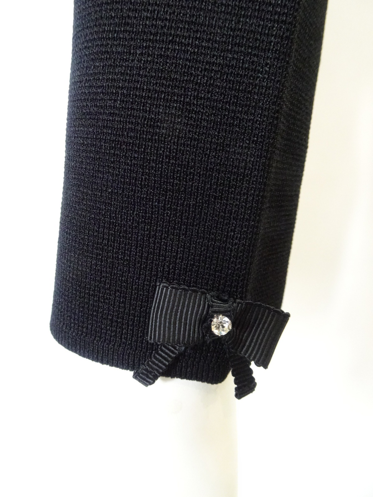 胸元にはお花のビジューモチーフが輝き、女性らしさをプラス。さらに、ジュエルボタンが印象的で豪華さを添え、全体を華やかに仕上げます。袖口には可愛らしいリボンをあしらい、細部まで