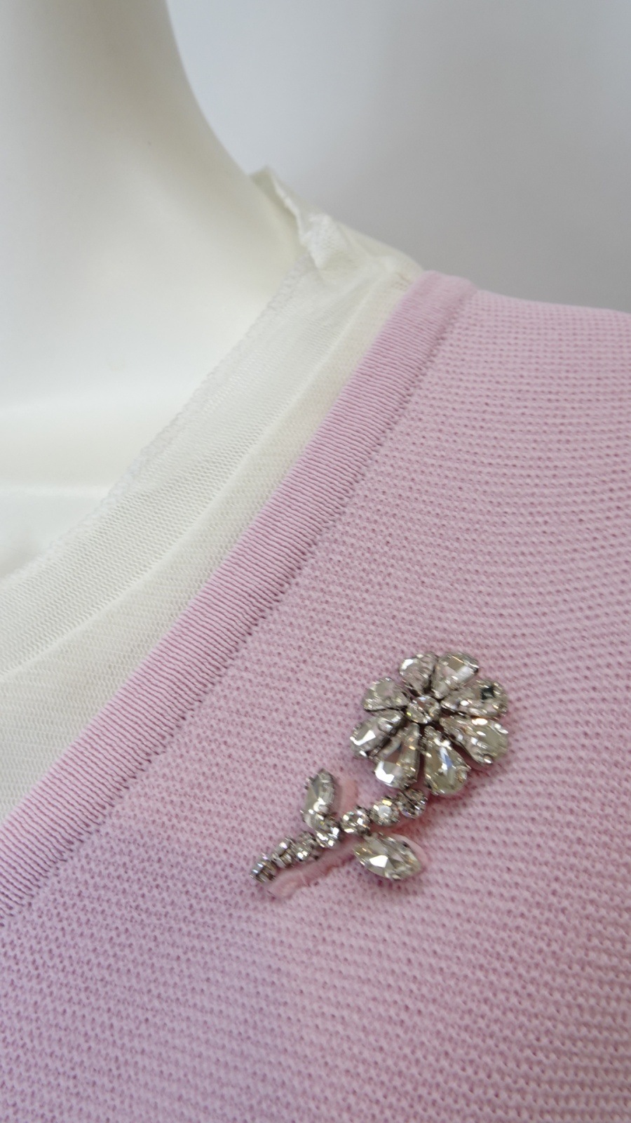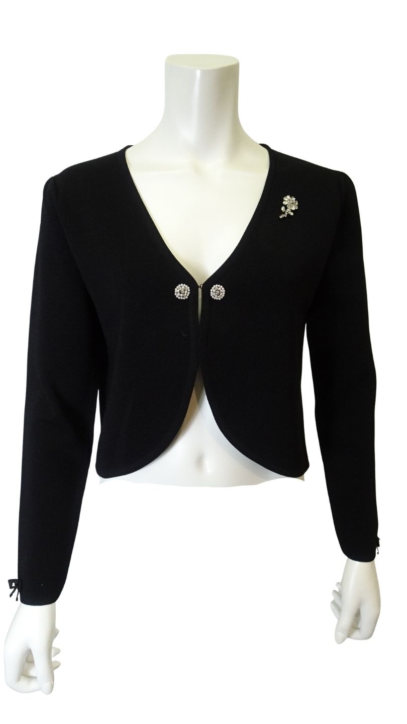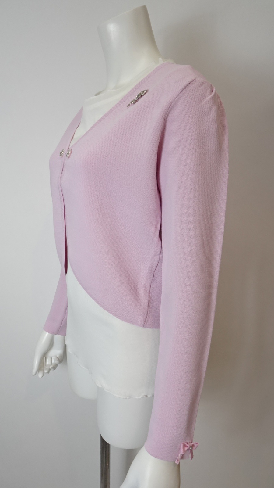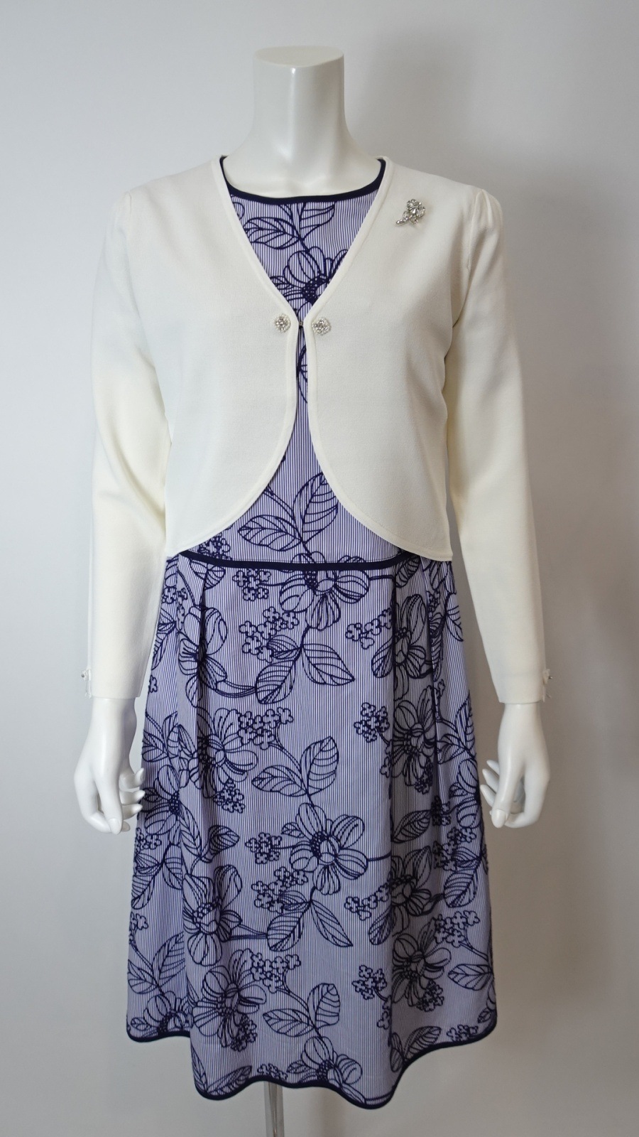 胸元にはお花のビジューモチーフが輝き、女性らしさをプラス。さらに、ジュエルボタンが印象的で豪華さを添え、全体を華やかに仕上げます。袖口には可愛らしいリボンをあしらい、細部まで