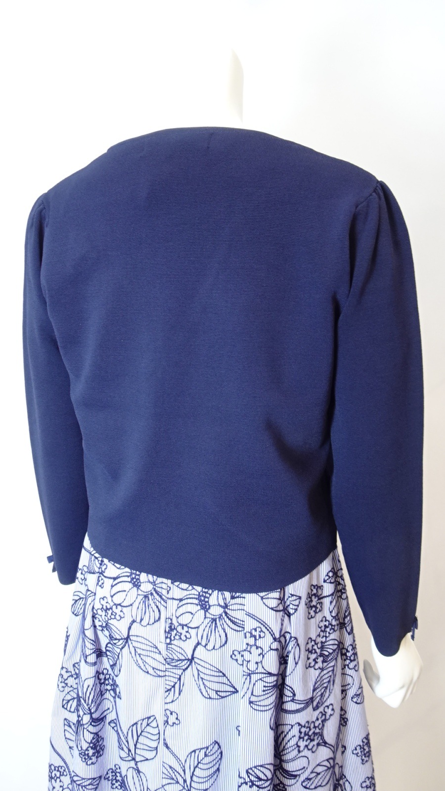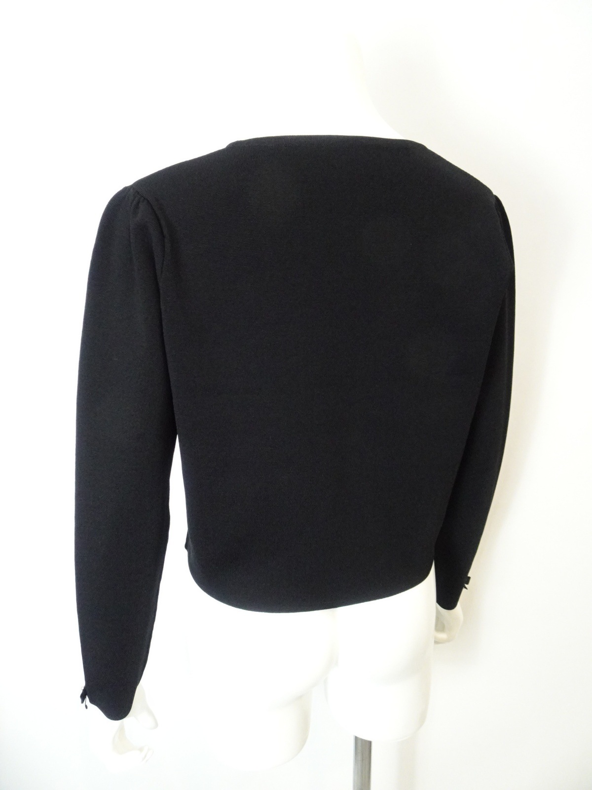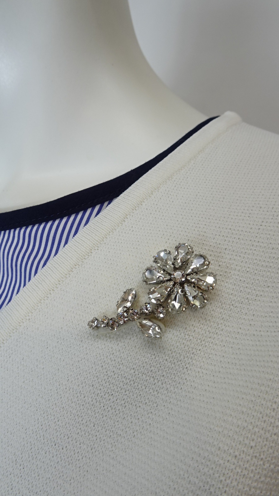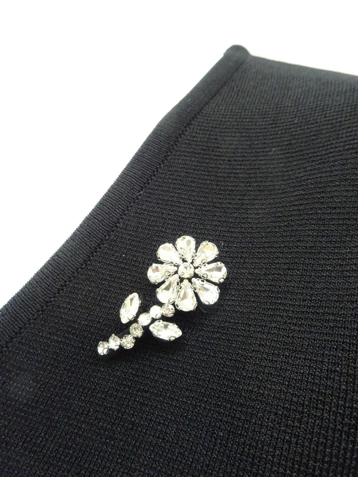 胸元にはお花のビジューモチーフが輝き、女性らしさをプラス。さらに、ジュエルボタンが印象的で豪華さを添え、全体を華やかに仕上げます。袖口には可愛らしいリボンをあしらい、細部まで