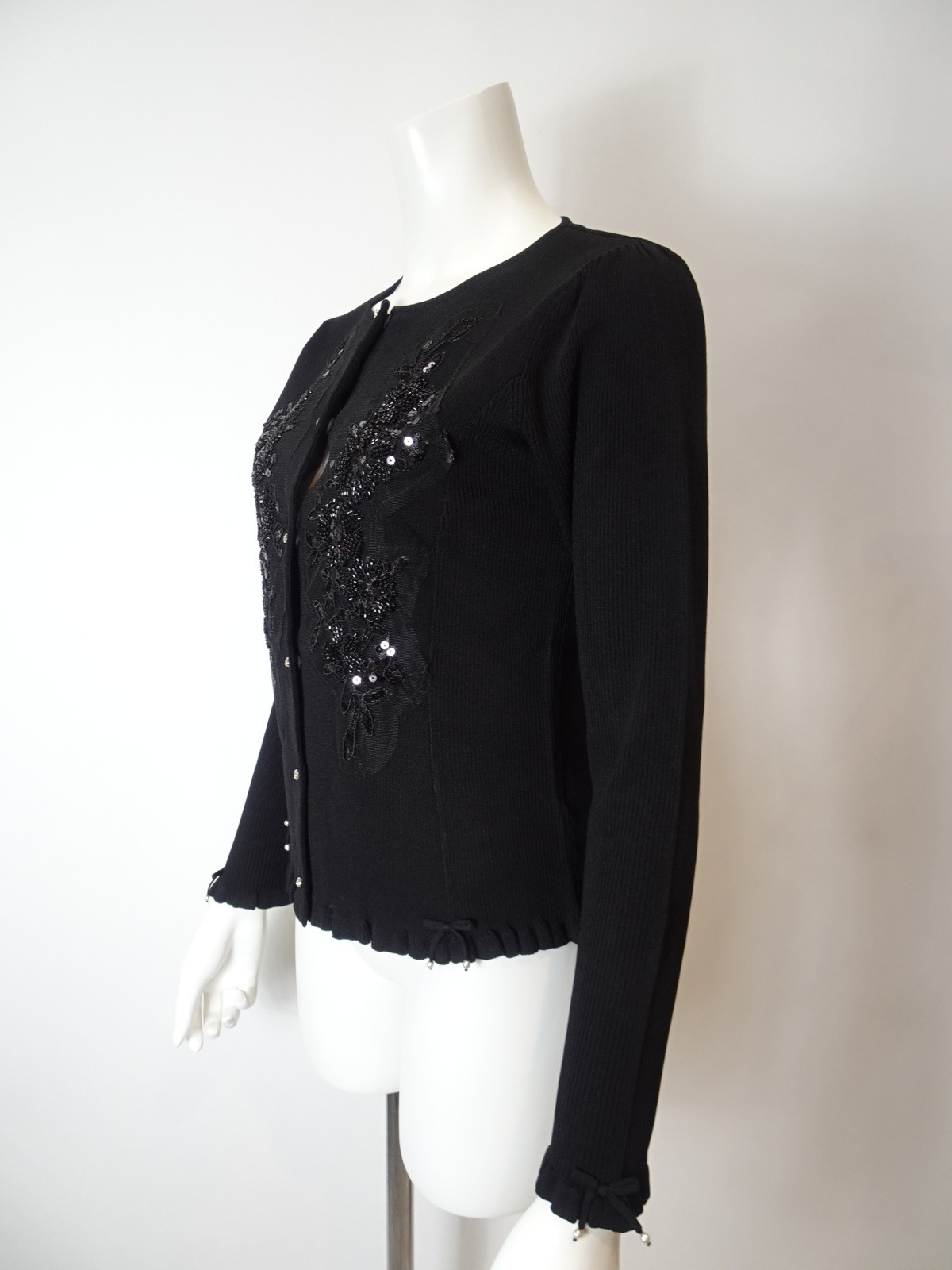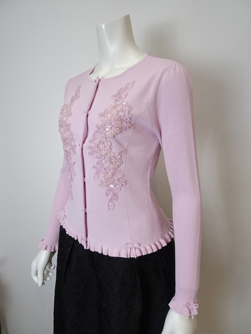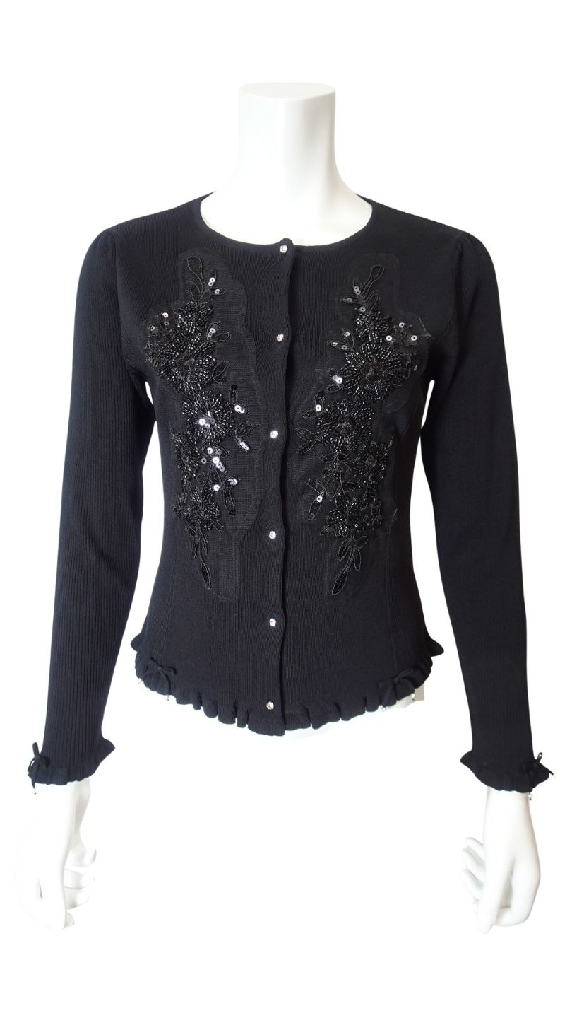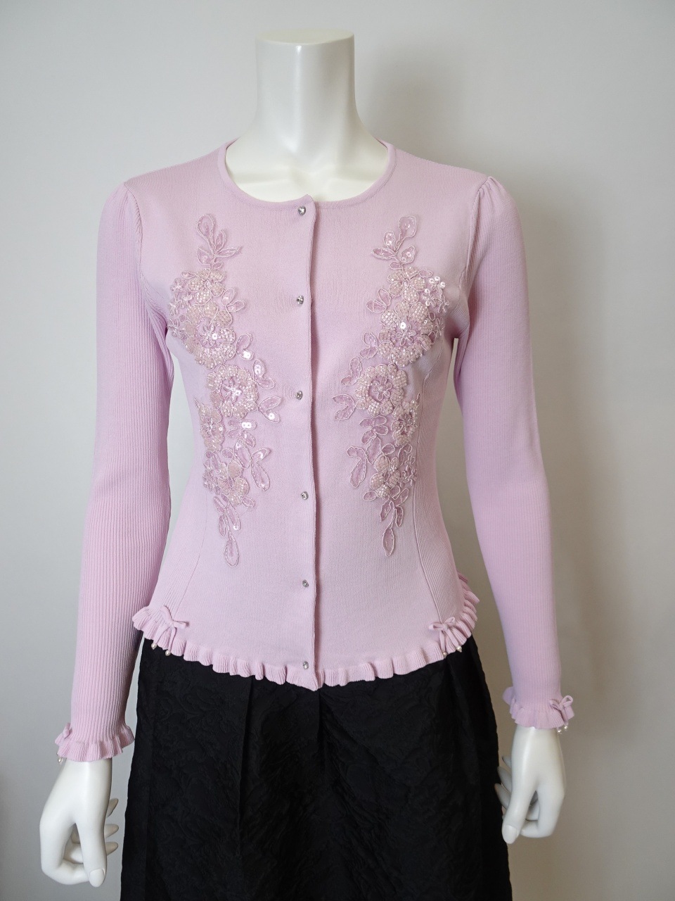 このカーディガンは、美しいスパンコール刺繍がきらめき、羽織るだけで華やかさと上品さを添えてくれる特別な一枚です。