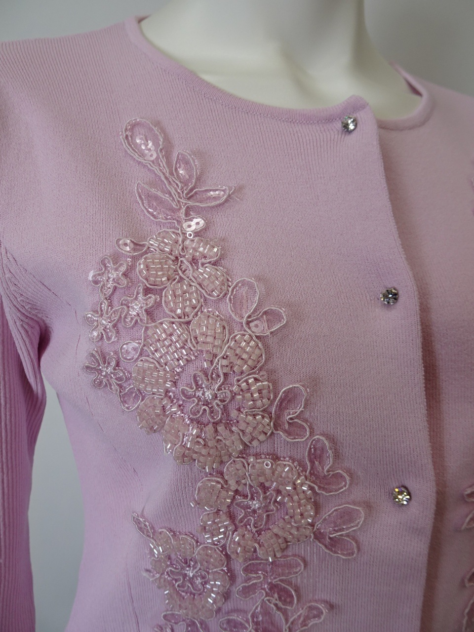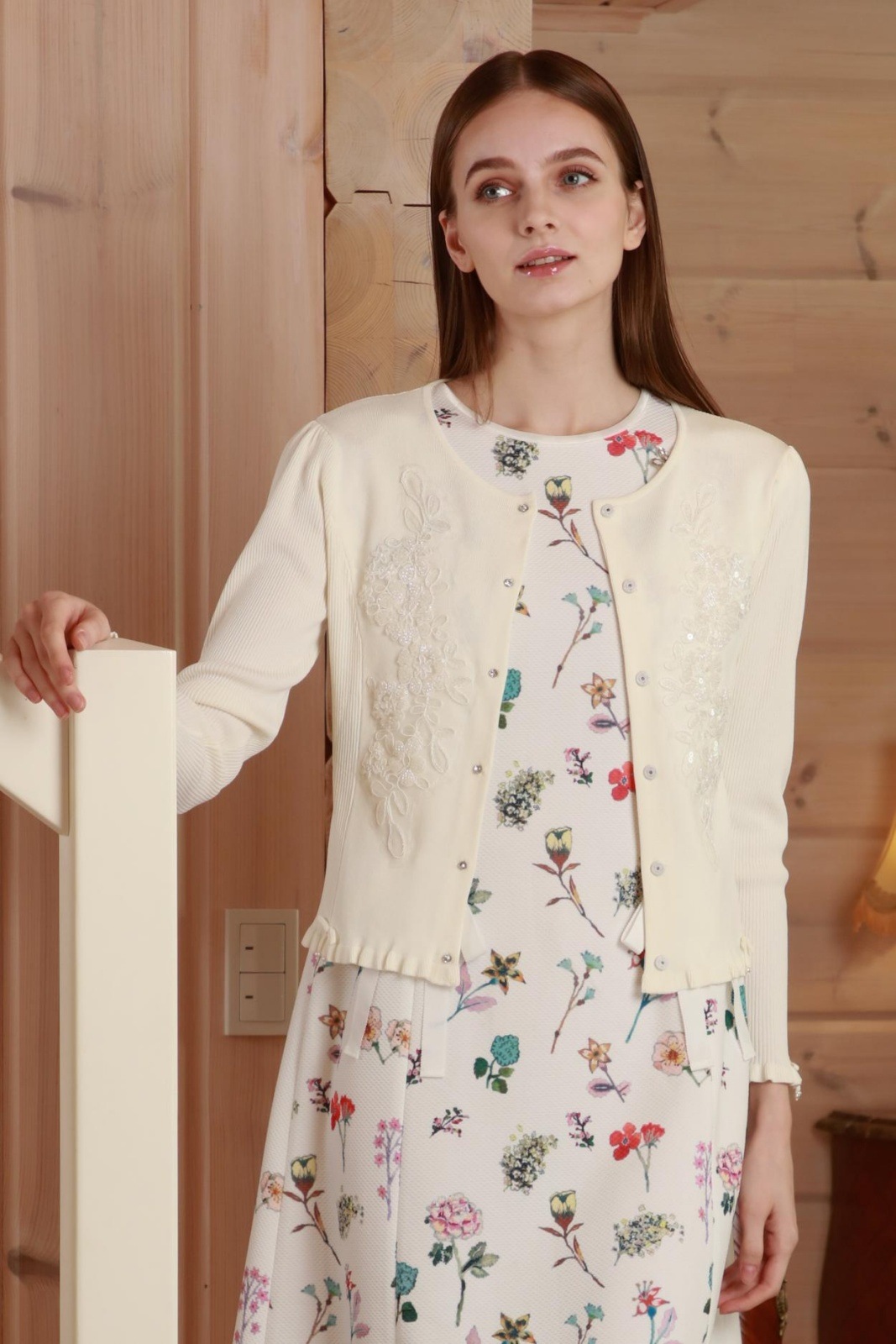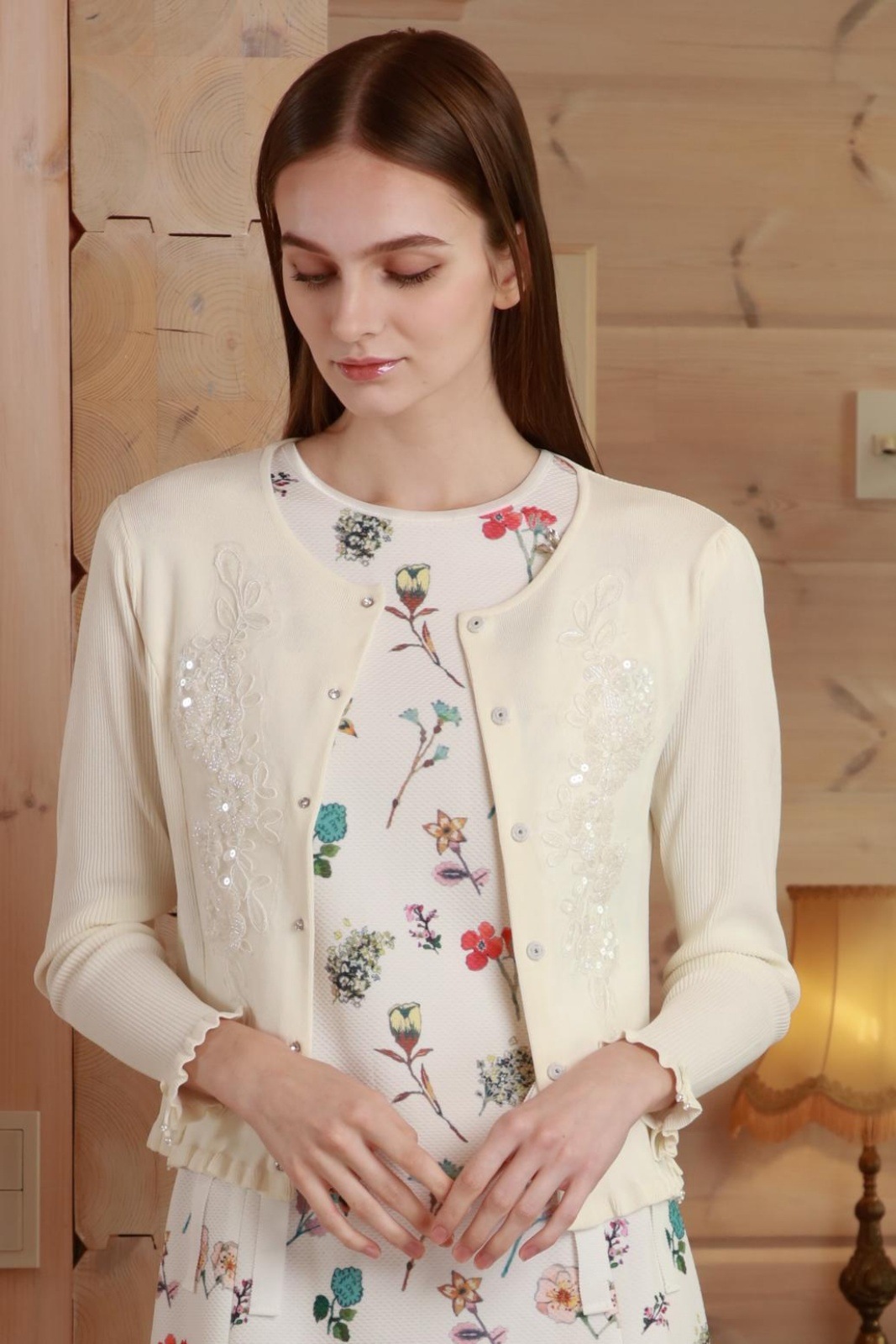 このカーディガンは、美しいスパンコール刺繍がきらめき、羽織るだけで華やかさと上品さを添えてくれる特別な一枚です。