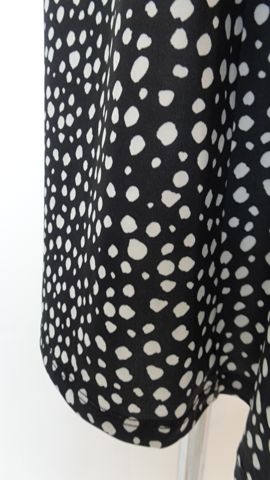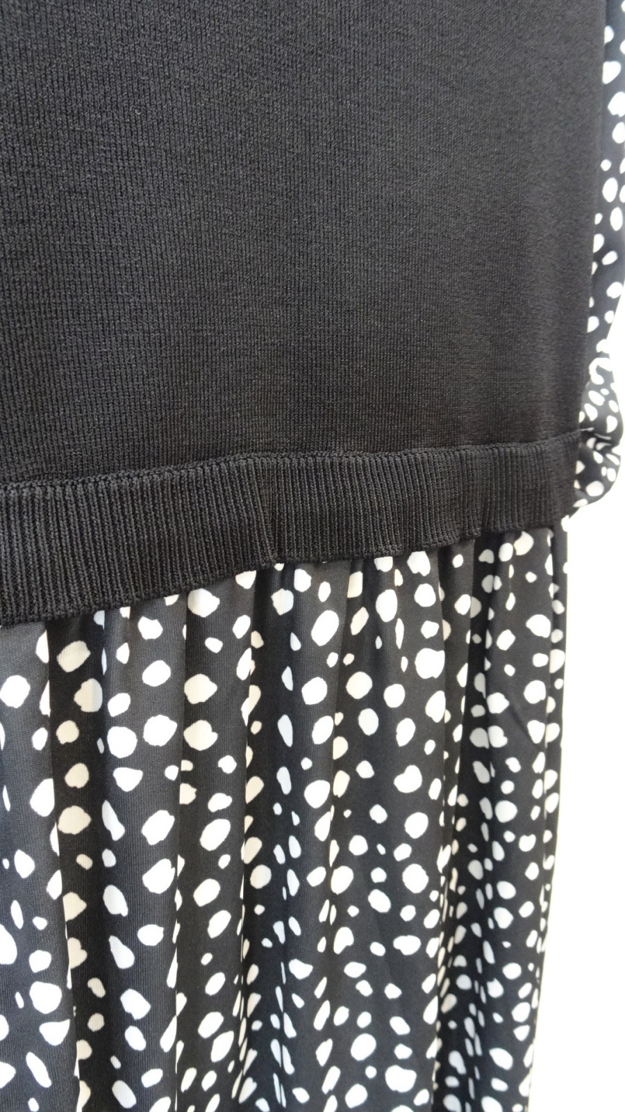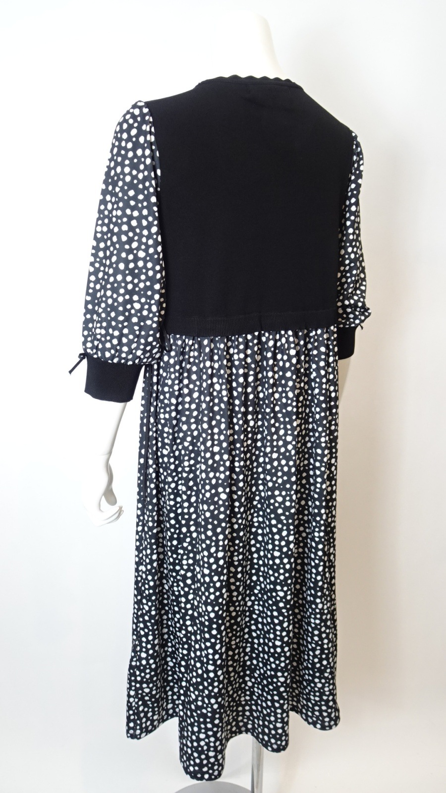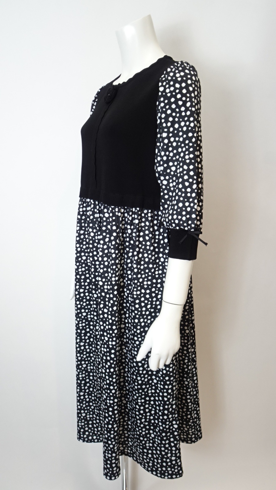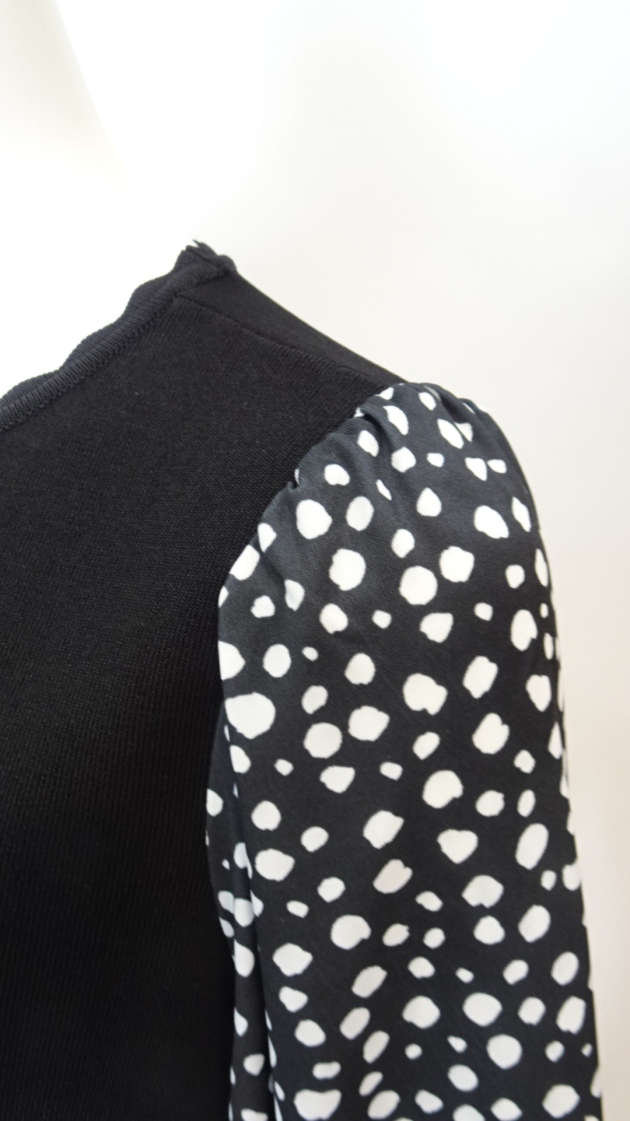 身頃はすっきりとしたブラックでまとめ、袖とスカート部分には細かなドット柄を配して軽やかな印象に。