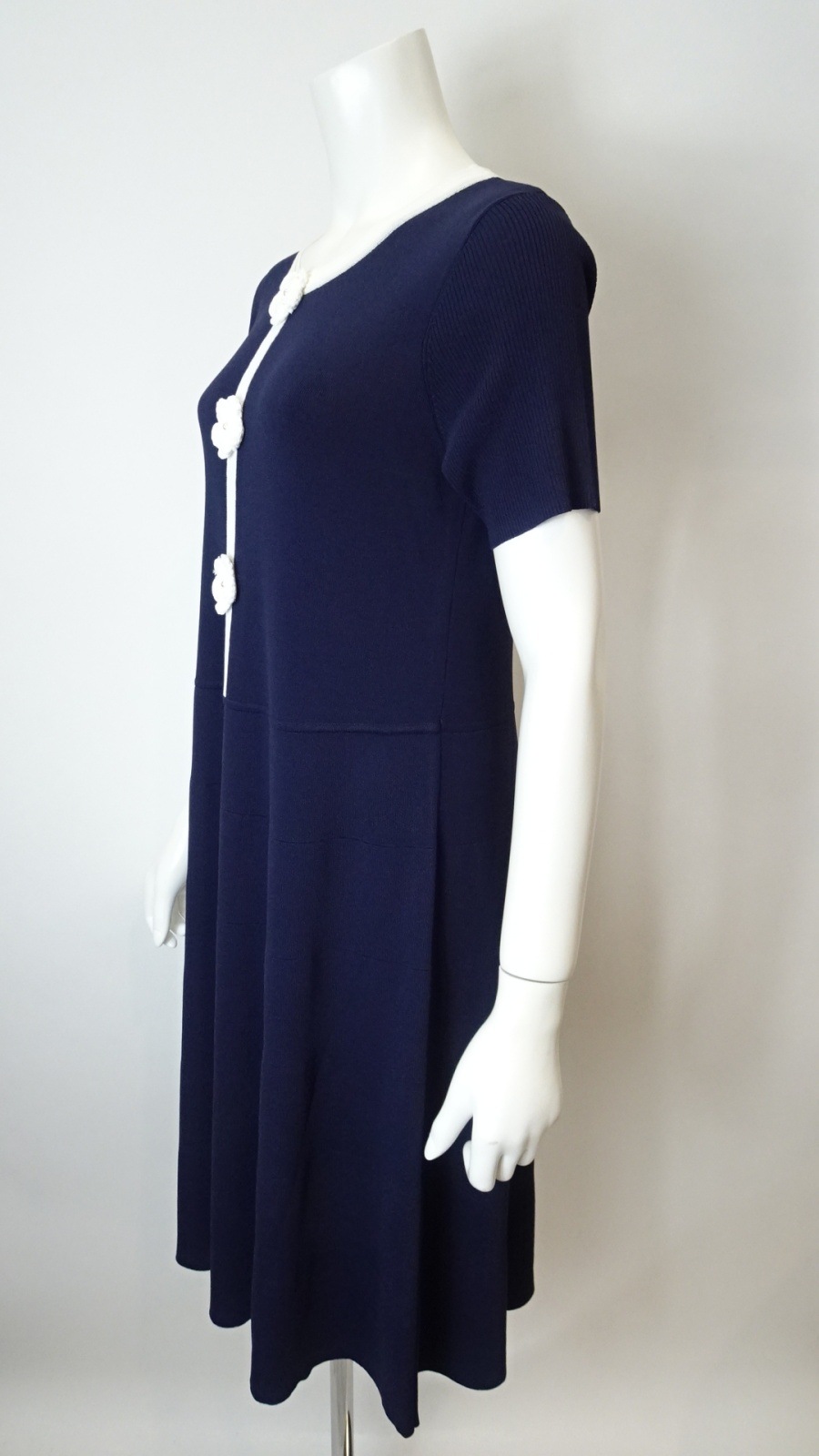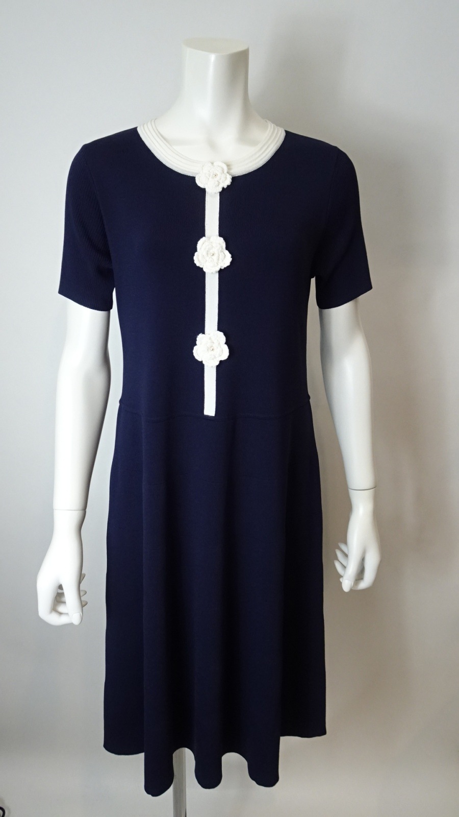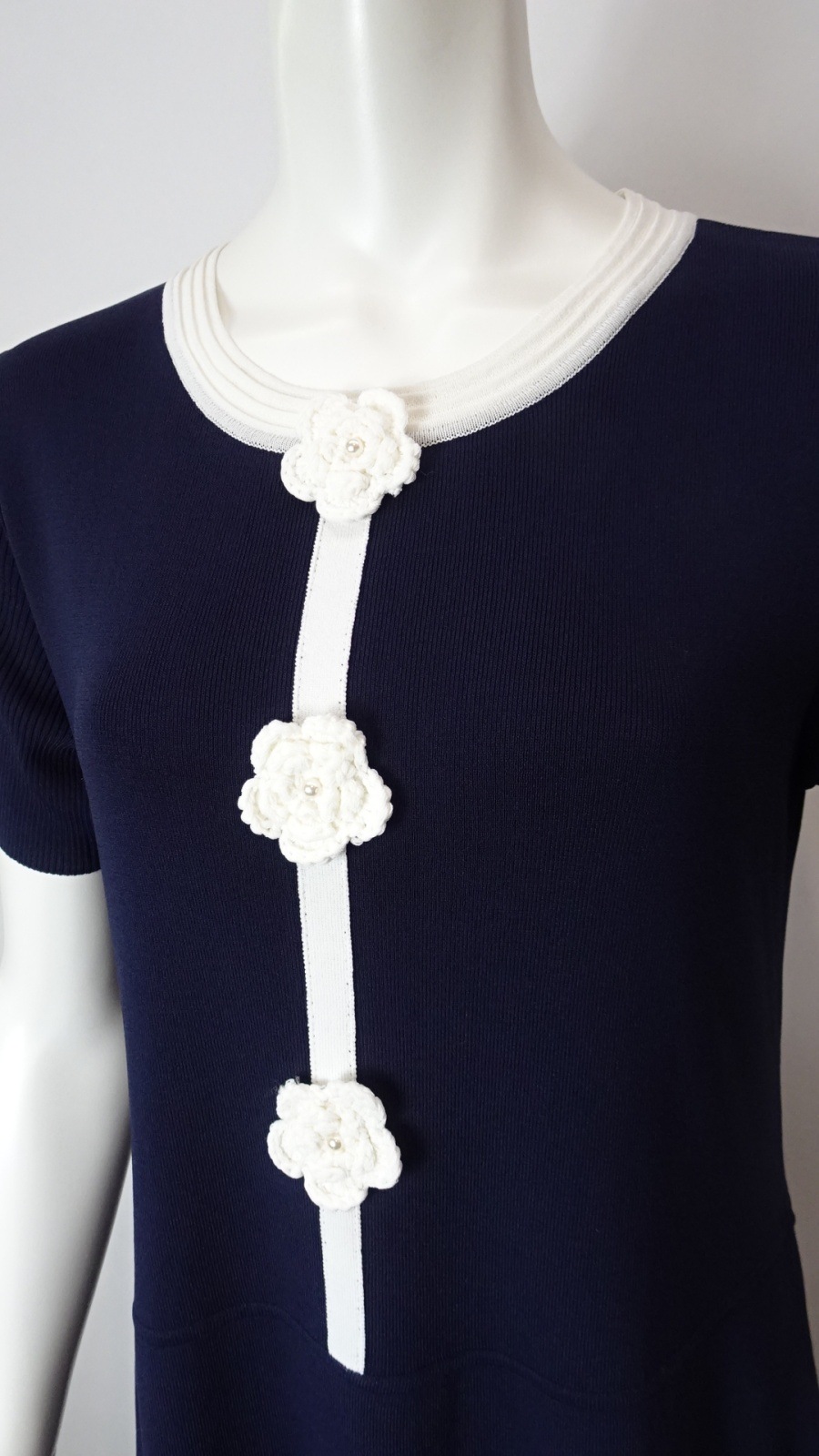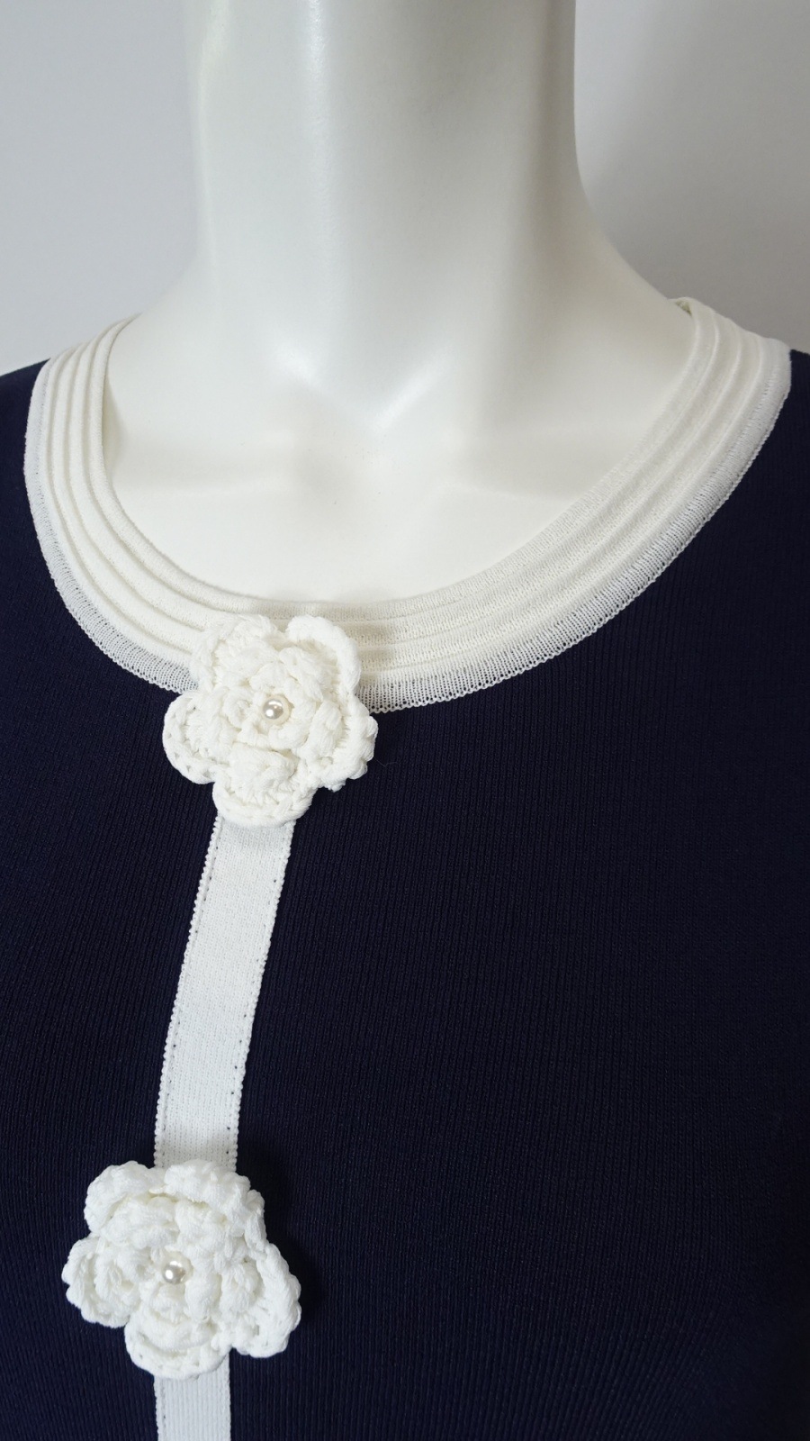胸元に施した かぎ針花モチーフ が、柔らかな存在感を放つ配色ニットワンピース。