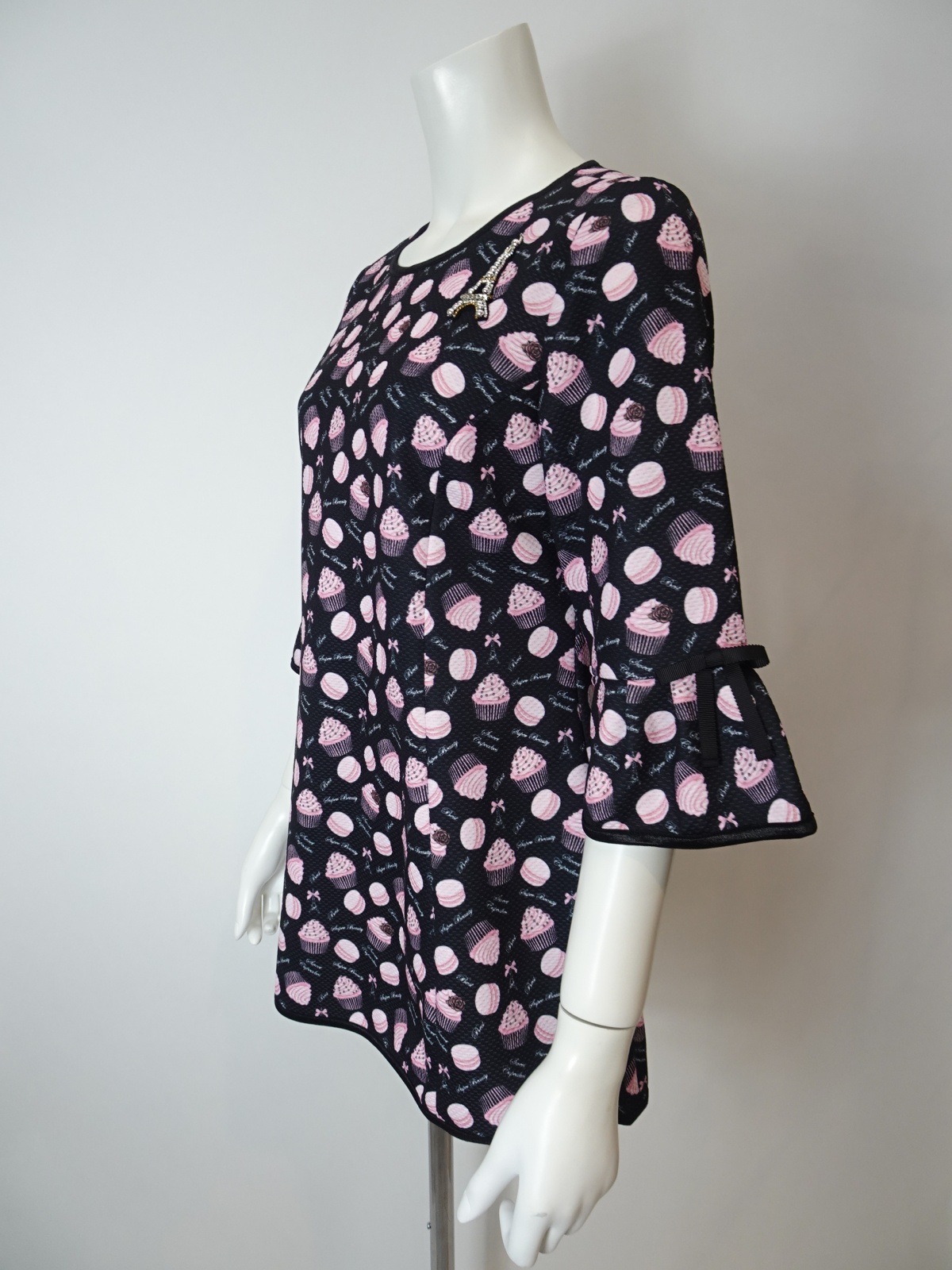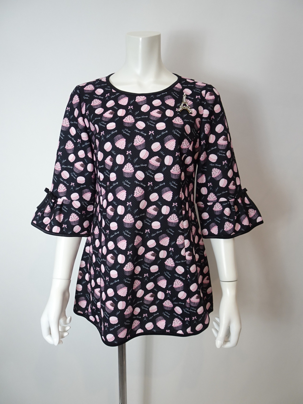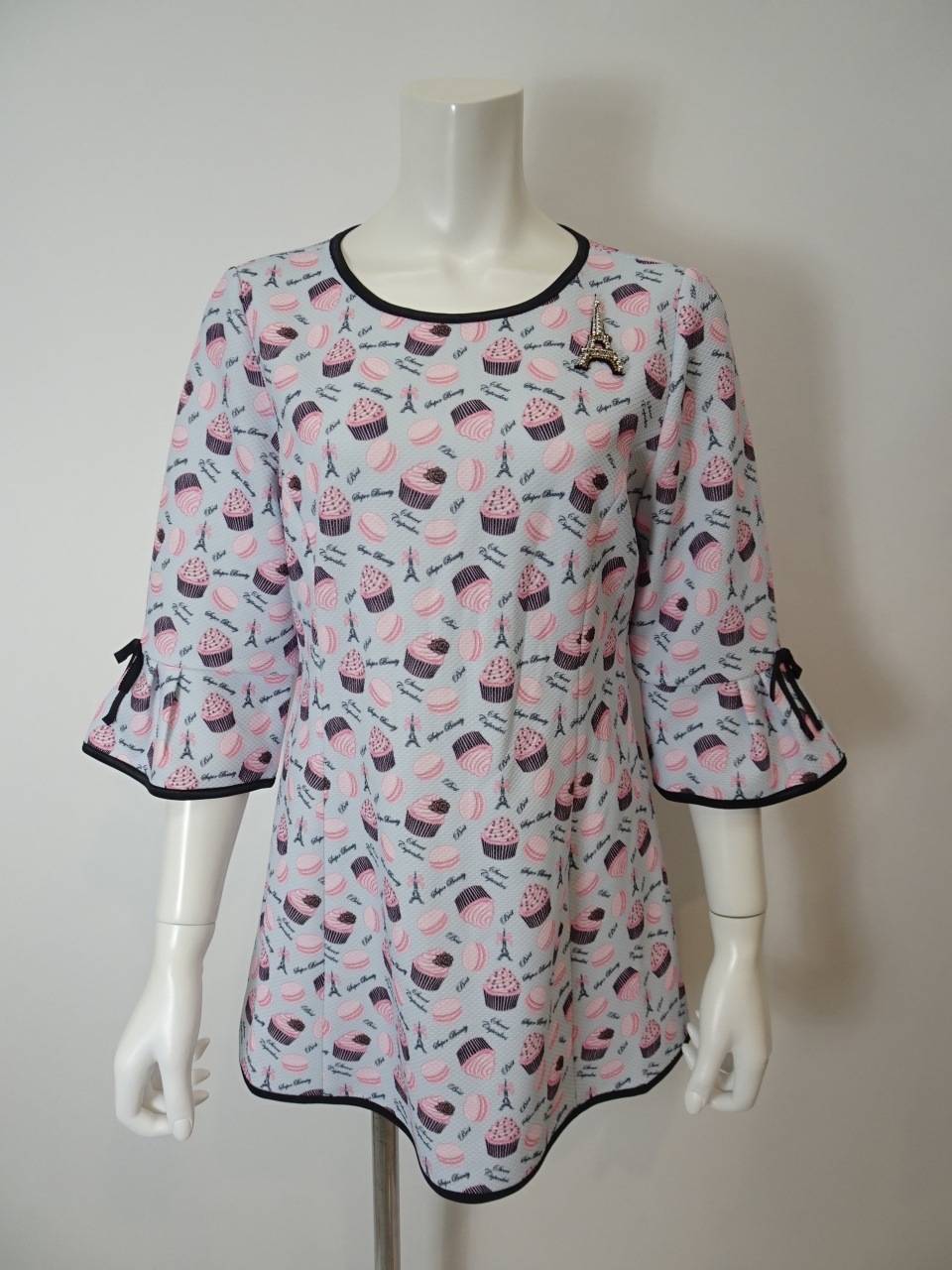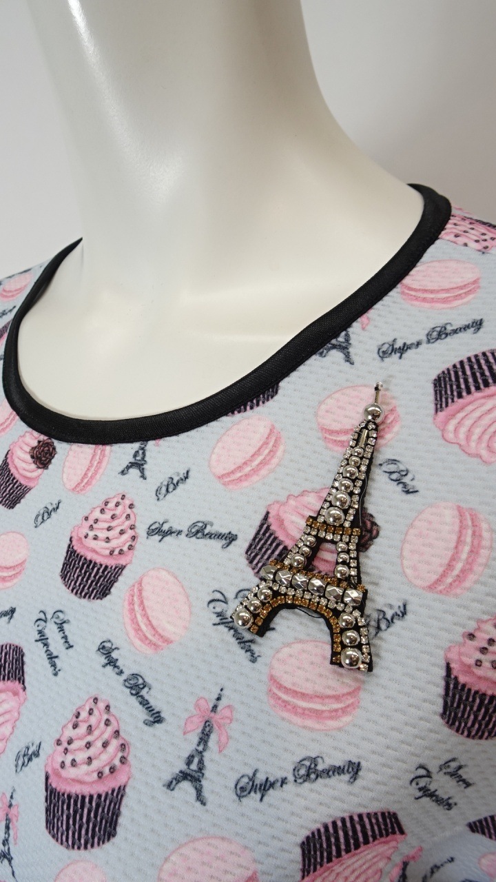 2026年直営店別注のスイーツ柄チュニックカットソー。この特別なアイテムは、可愛らしいスイーツ&エッフェル塔プリントが施されており、春夏のおしゃれを一段と引き立てます。エッフェル塔モチーフがさりげなくデザインされており、パリのエレガンスを感じさせてくれます。