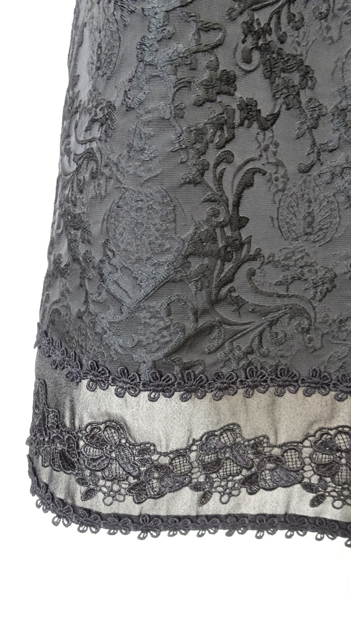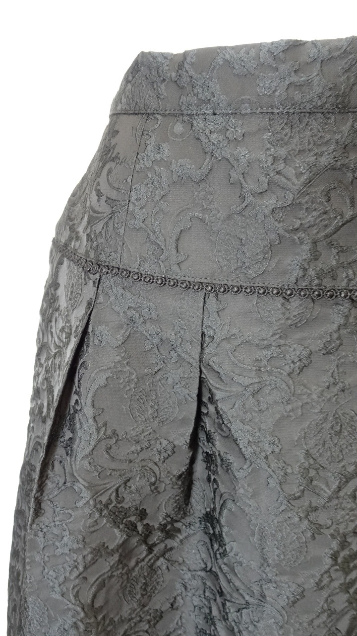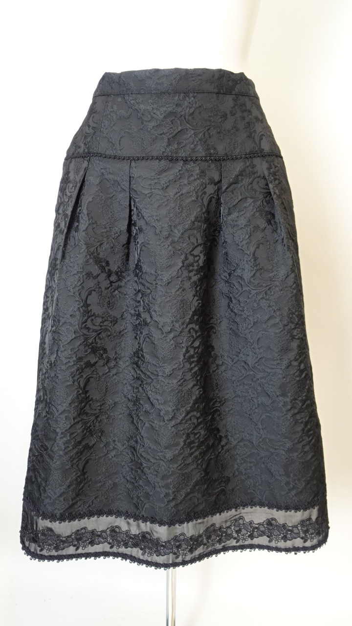 繊細なジャガード織が際立つ、気品あふれるブラックスカート。 裾の切り替えデザインがさりげない立体感を生み出し、落ち着いた中にも女性らしさを感じさせる一着です。