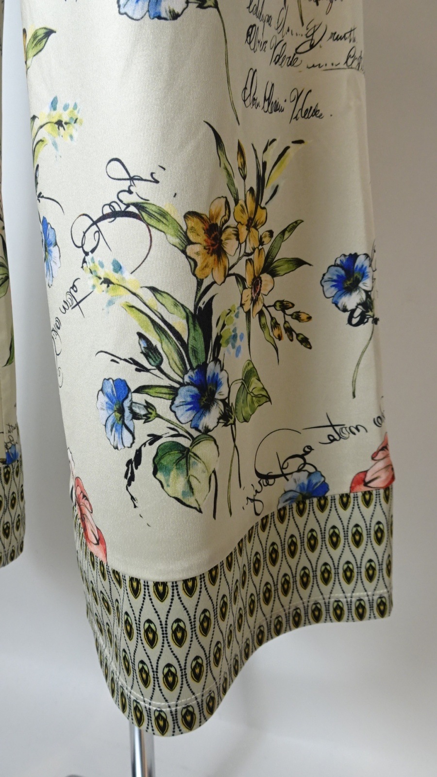 アンティーク調の花柄に繊細な幾何柄を重ねたプリントが、装いに奥行きと洗練を