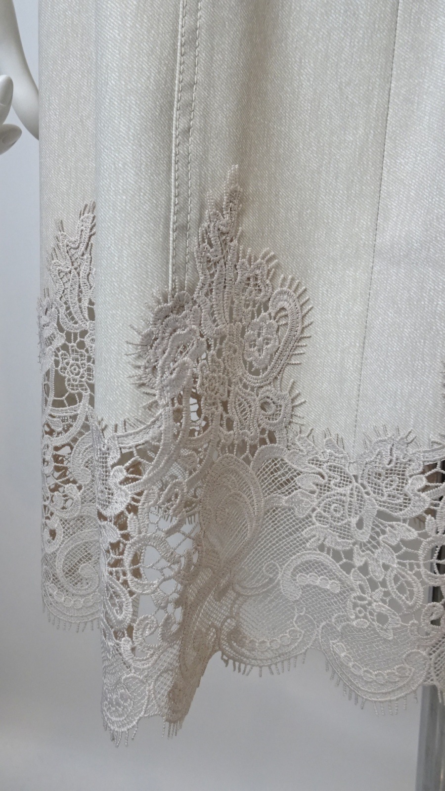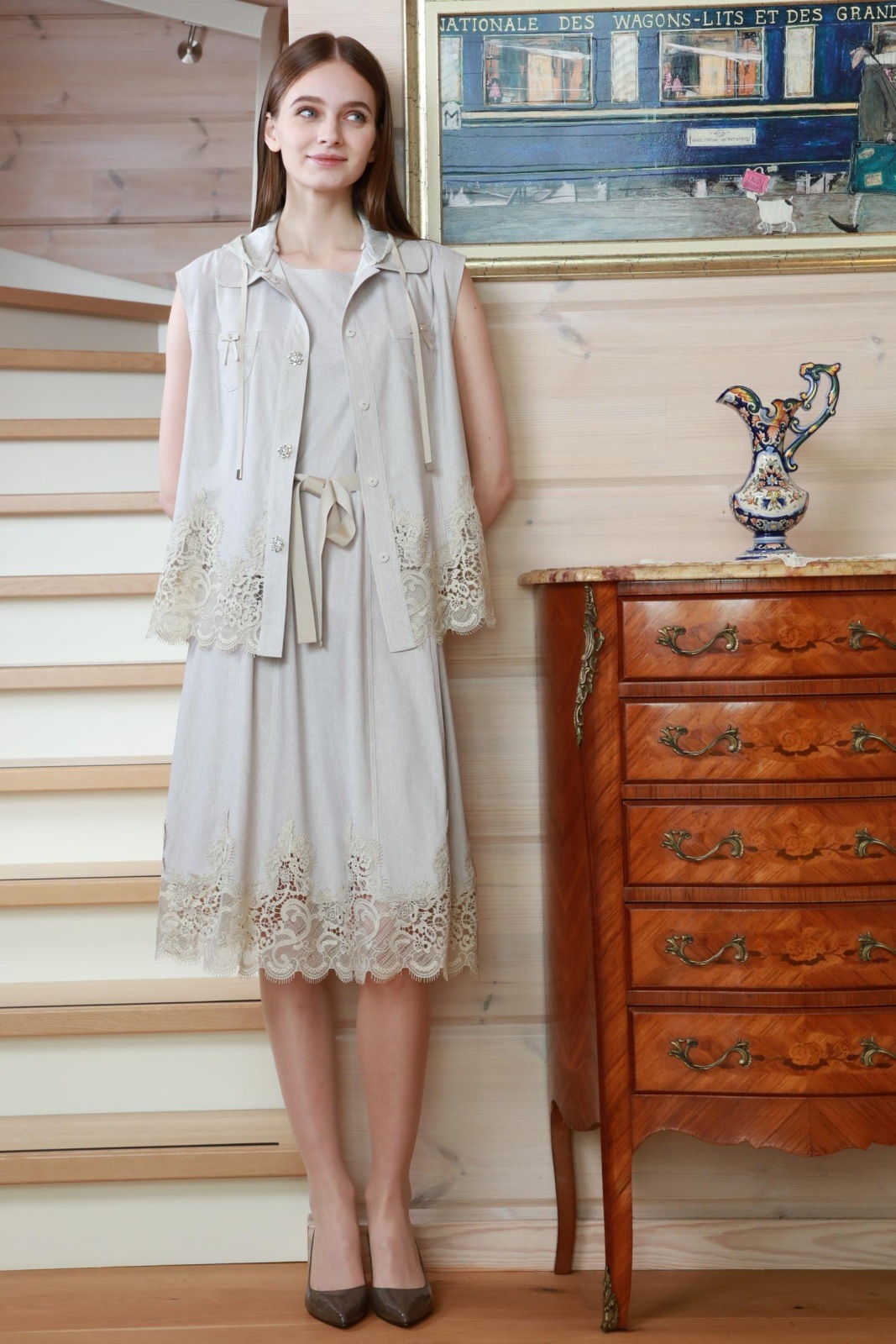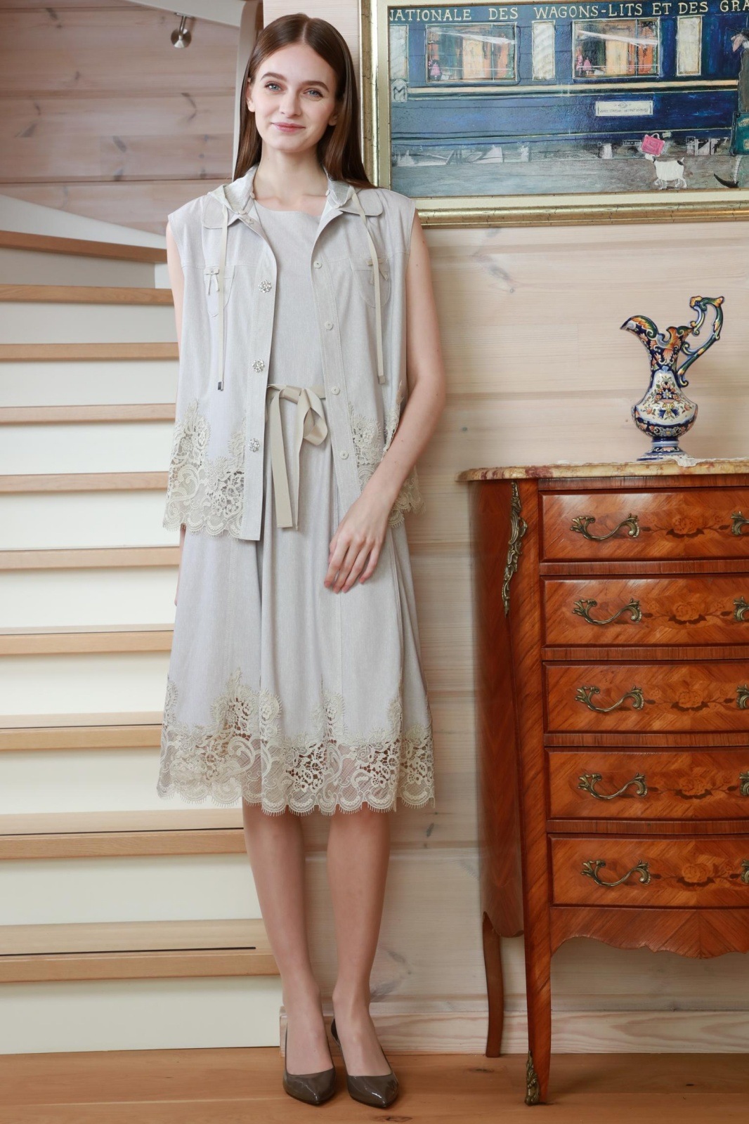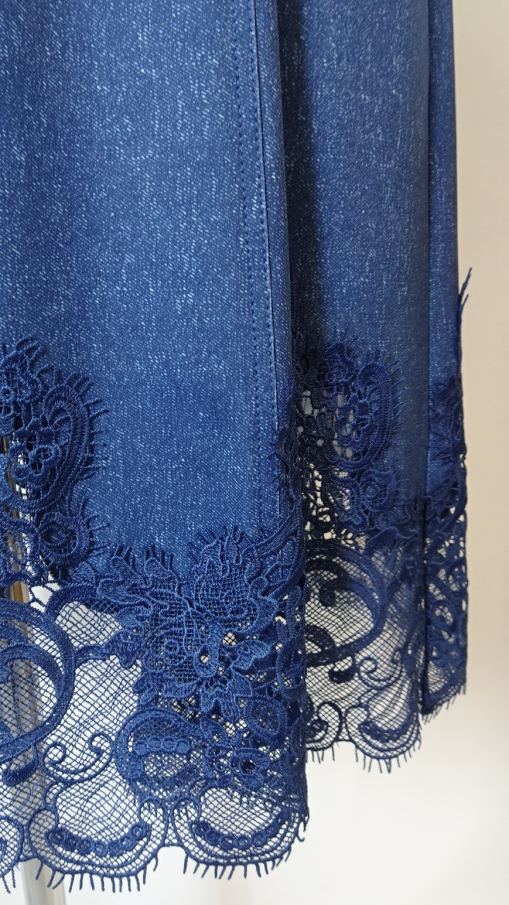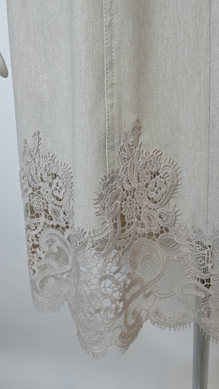 裾に施された贅沢で、繊細なレースが程よい甘さを添え、転写プリントとのコントラストが