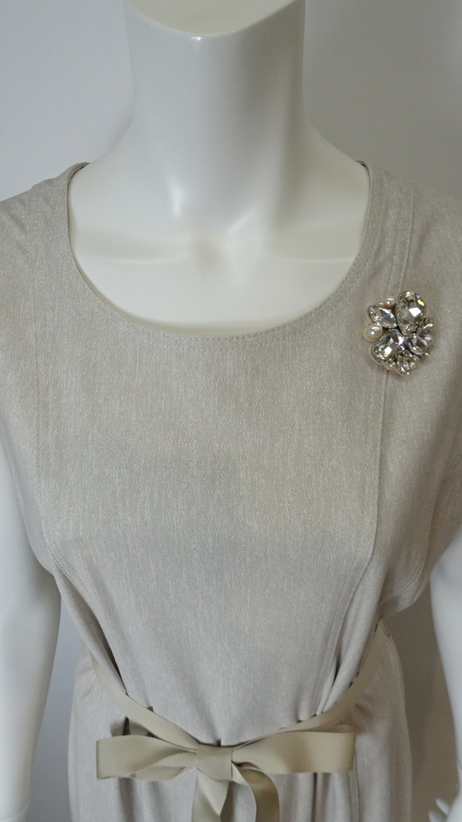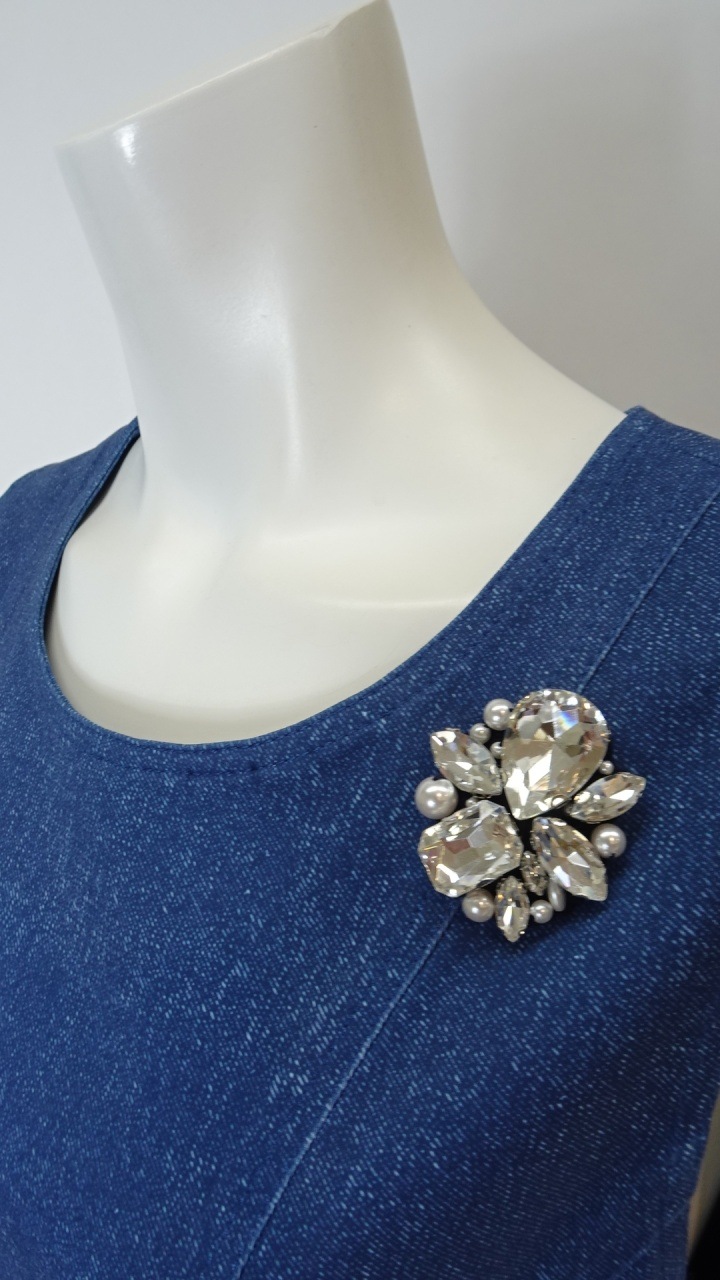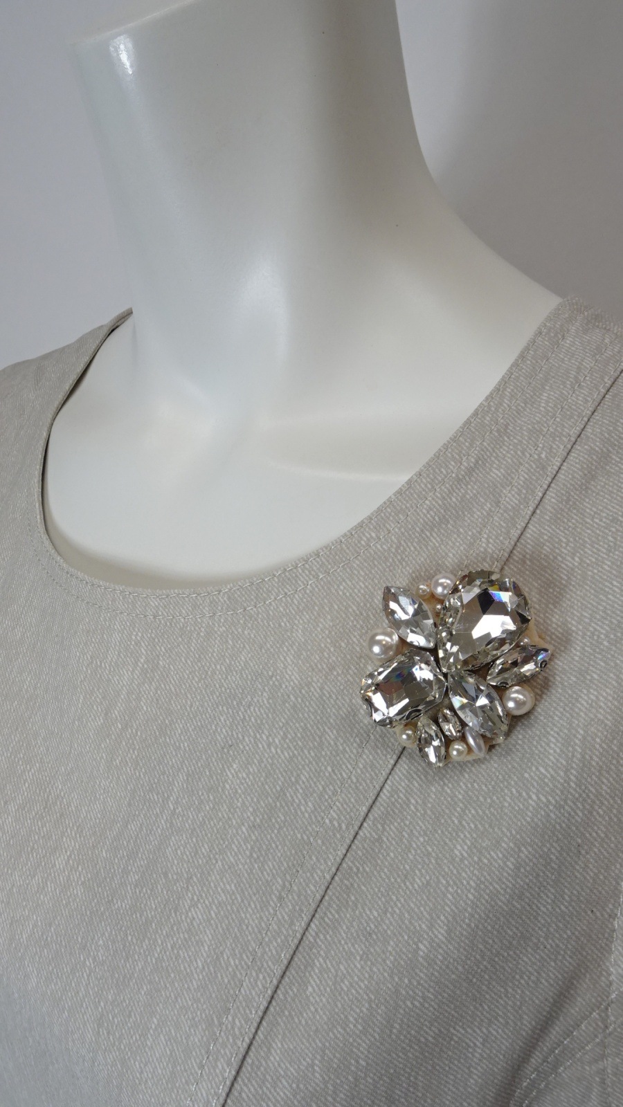 演出します。 胸元のビジューがさりげなく輝き、女性らしい上品なアクセントに。