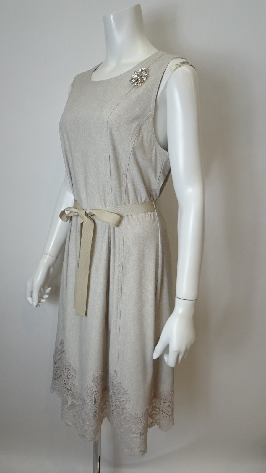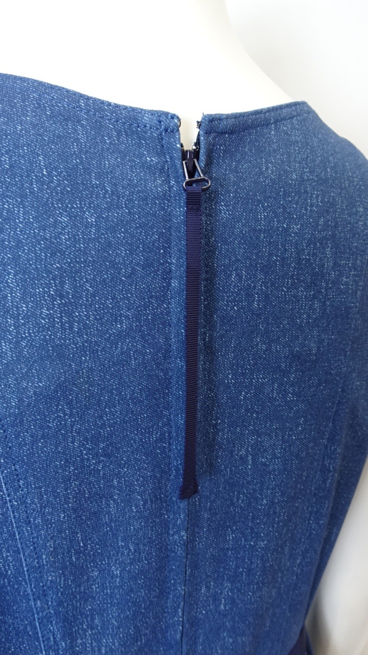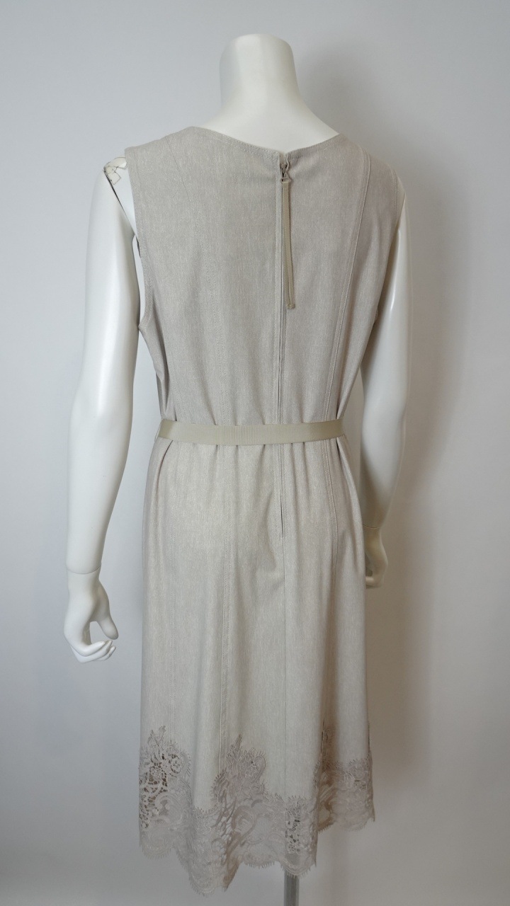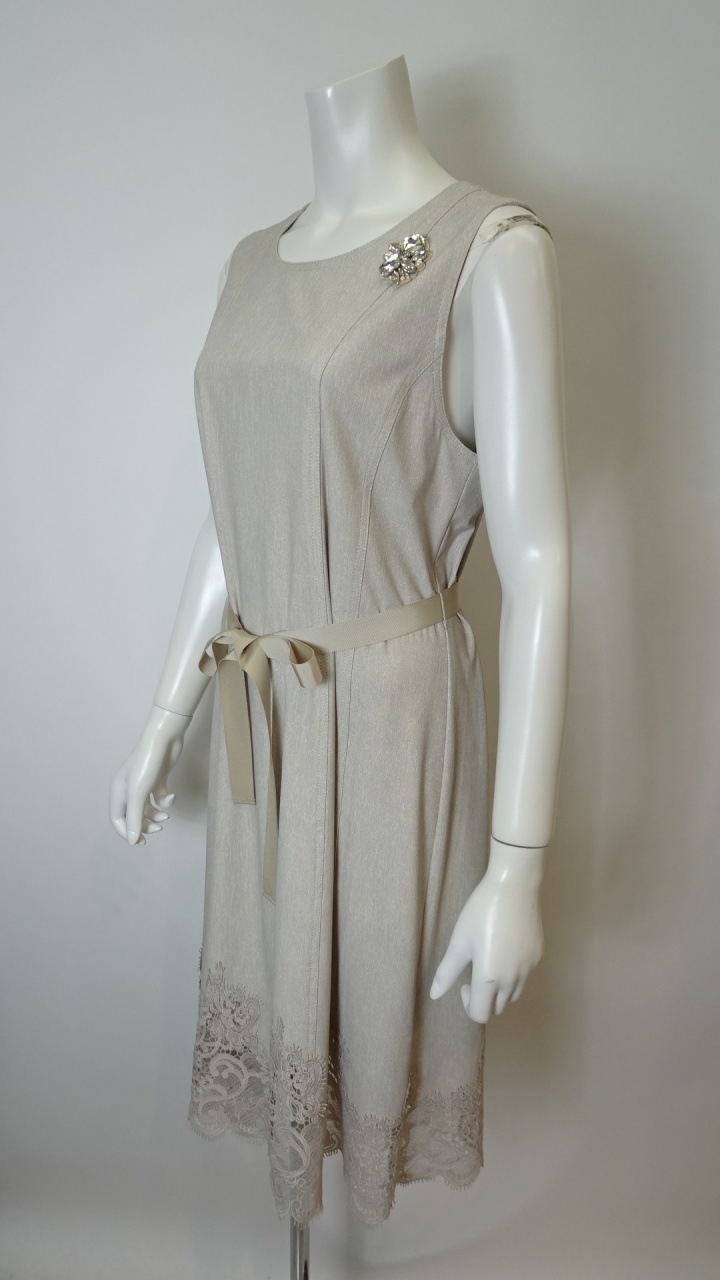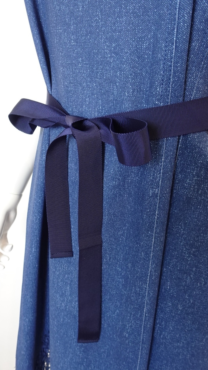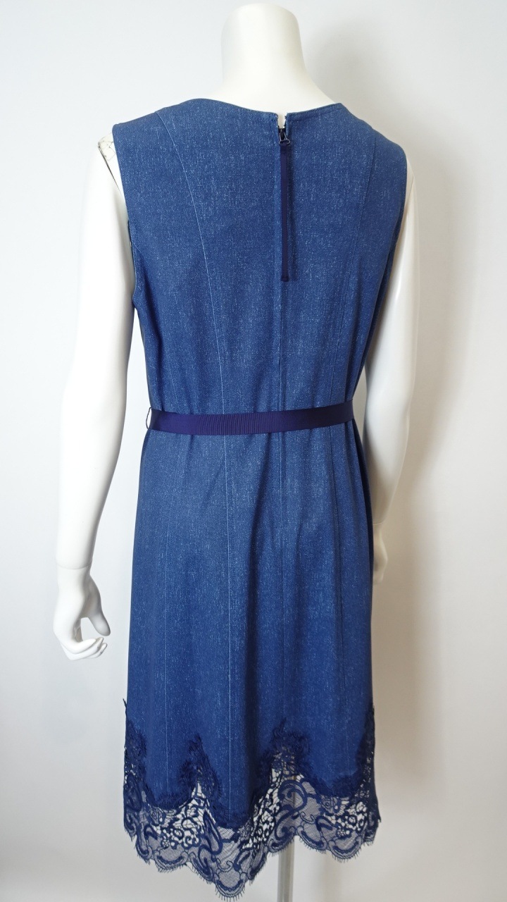 デニム風の転写プリント素材を使用した、裾レース使いのノースリーブワンピース。