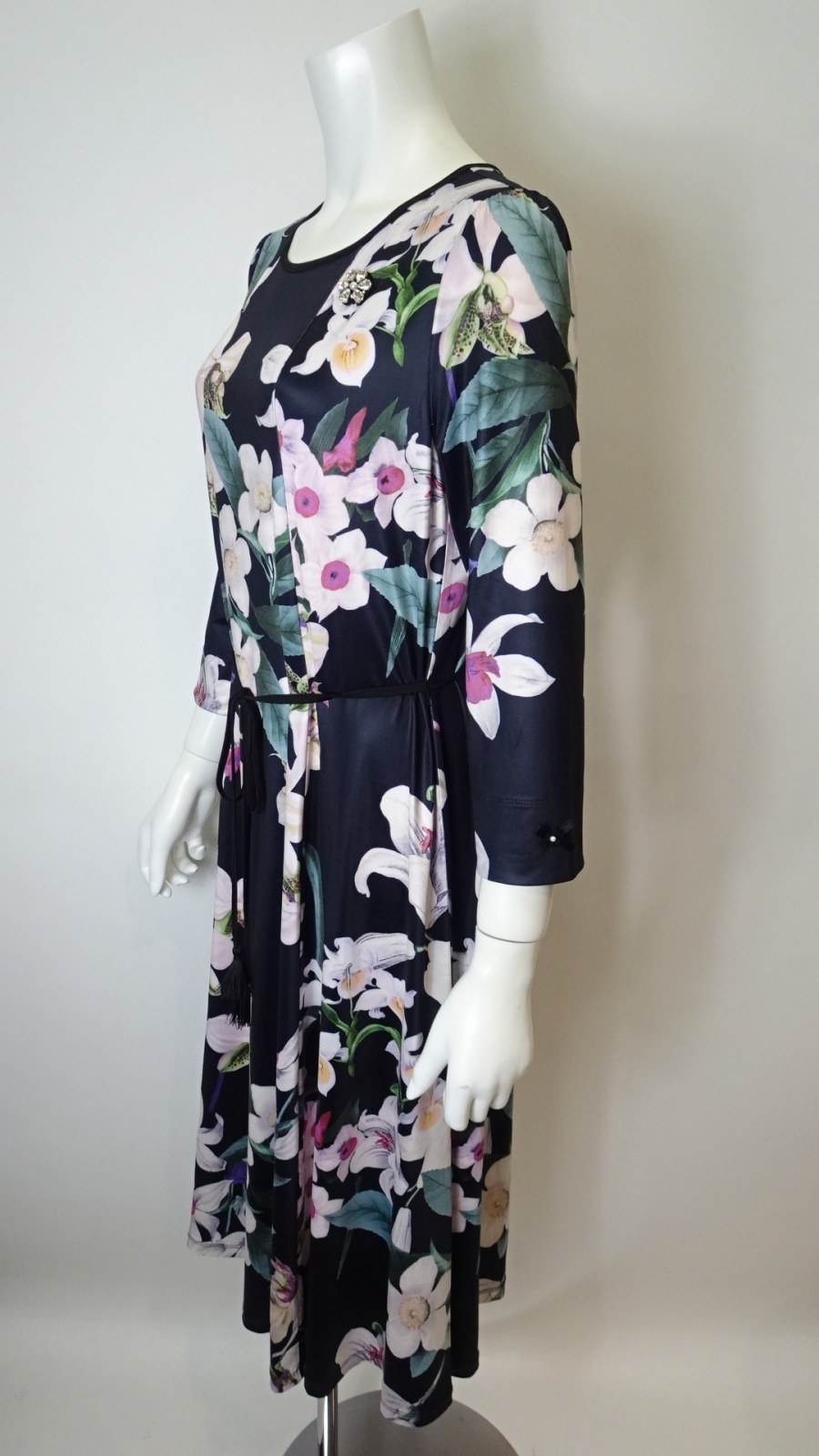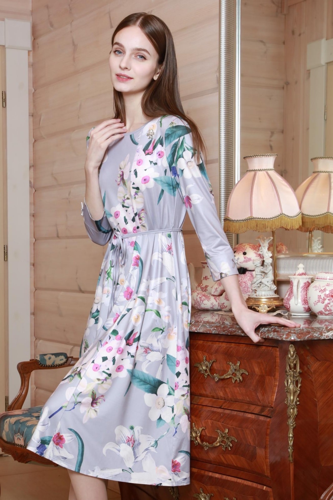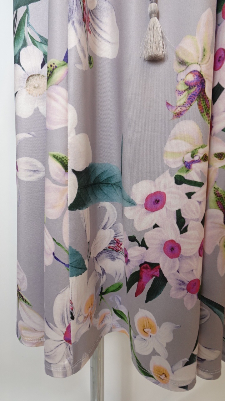 ヨーロッパテイストの大胆なフラワープリントが全体を彩り、身にまとうだけで特別な気分にしてくれる一着です。