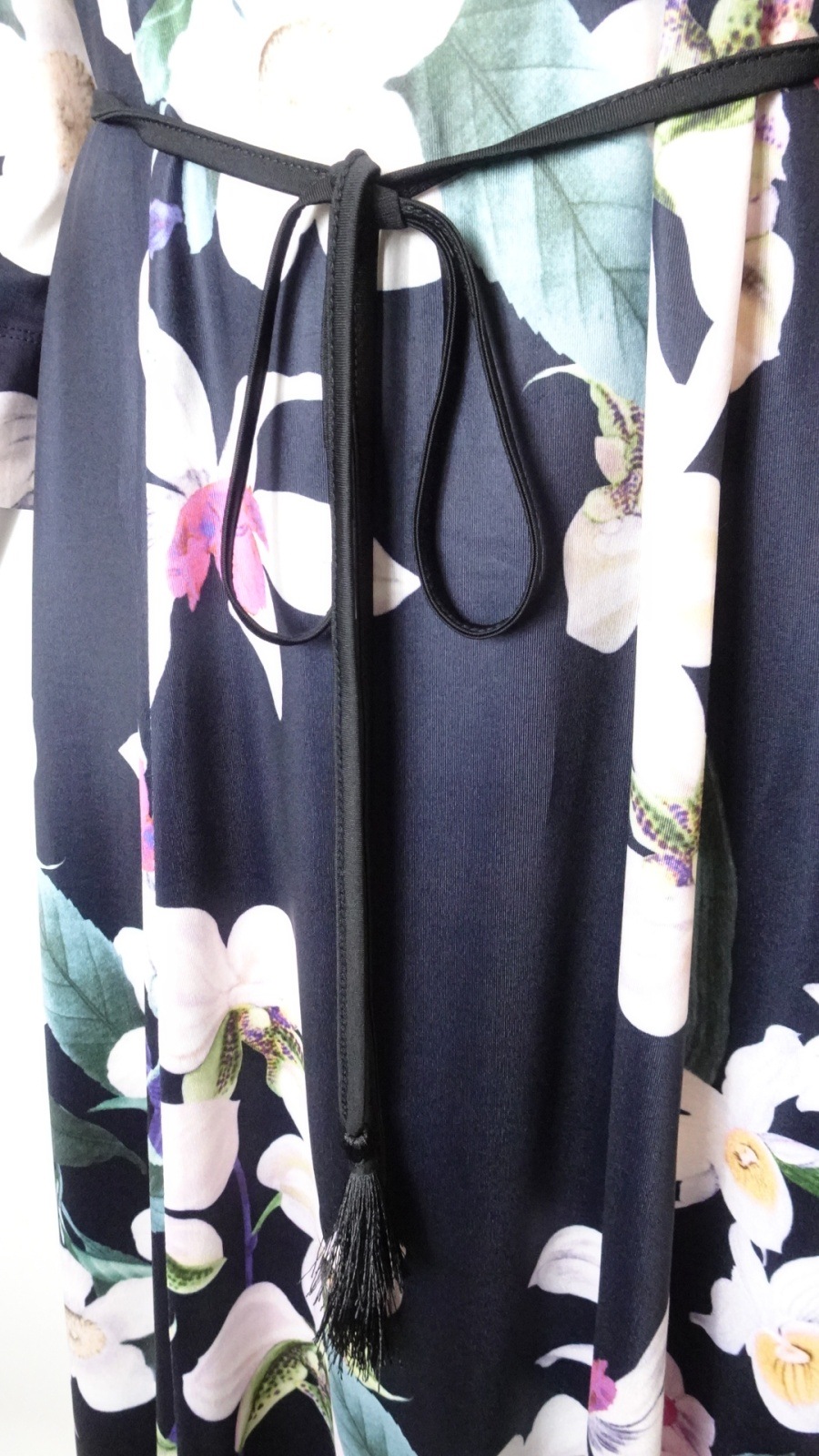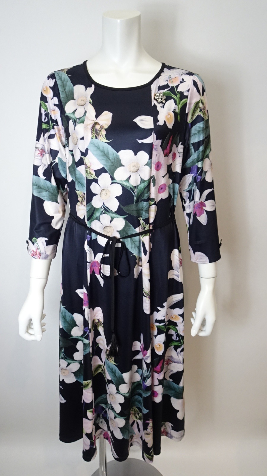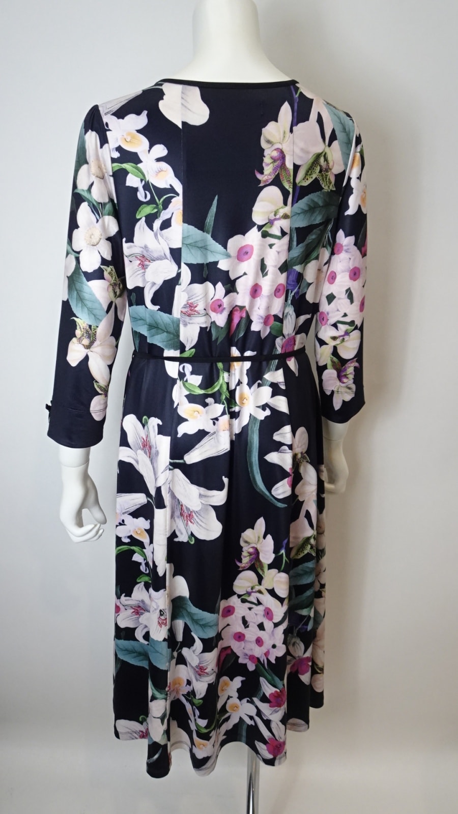 ヨーロッパテイストの大胆なフラワープリントが全体を彩り、身にまとうだけで特別な気分にしてくれる一着です。