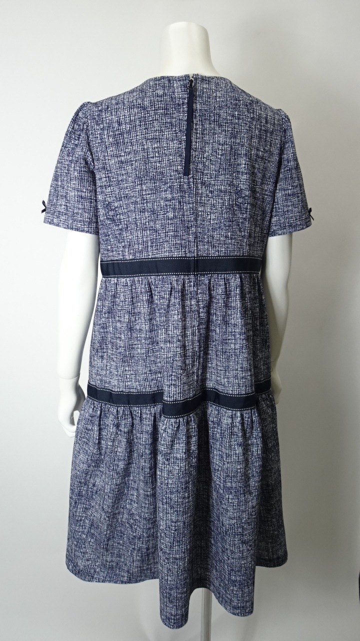 大人のフェミニンスタイルを追求したこのワンピースは、エレガントなデザインと着心地の良さを兼ね備えています。ティアード切替部分に施されたグログランテープが、さりげないアクセントを加え、目を引く仕上がりです。