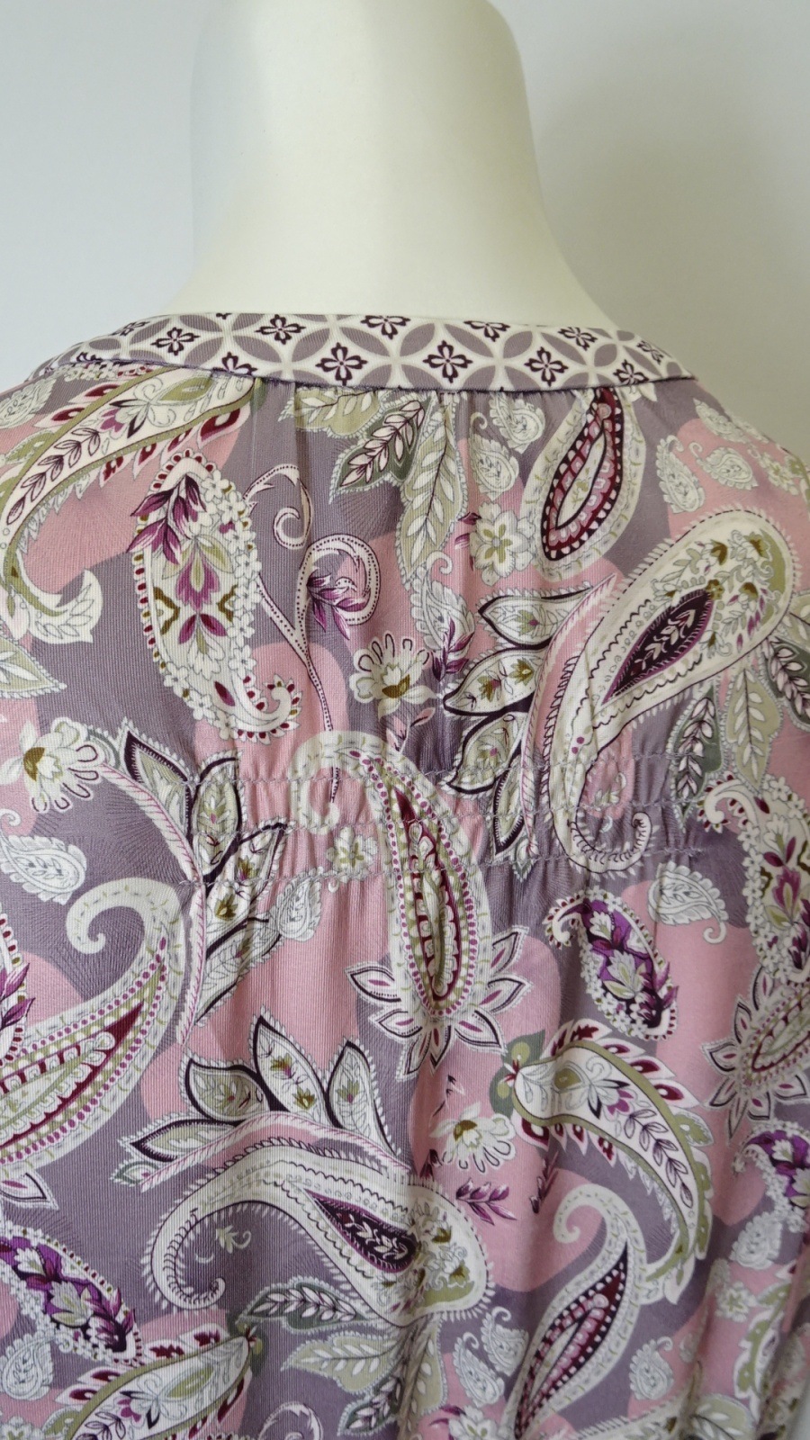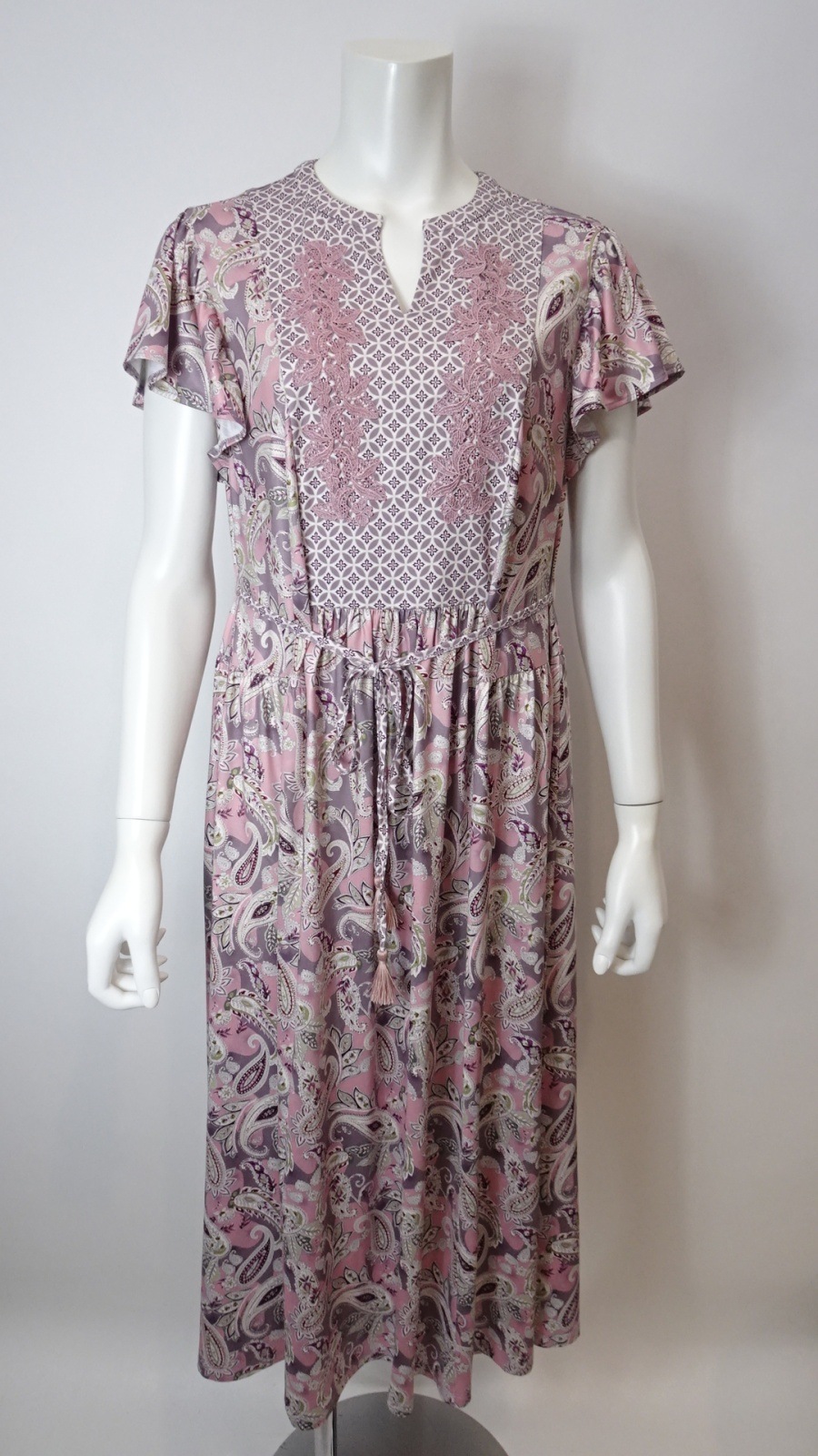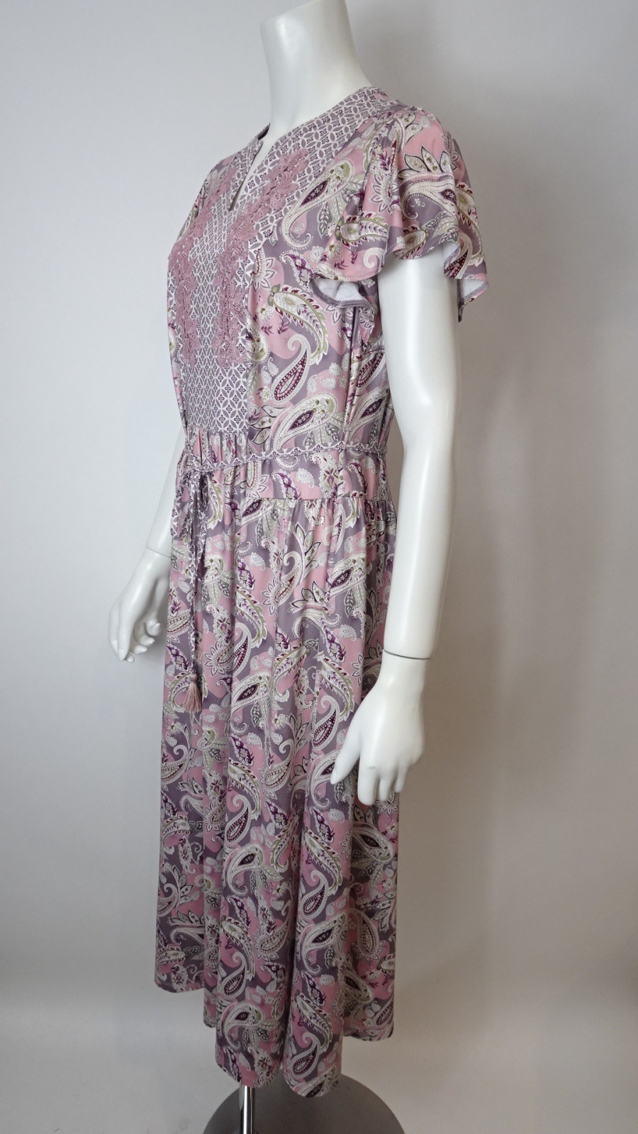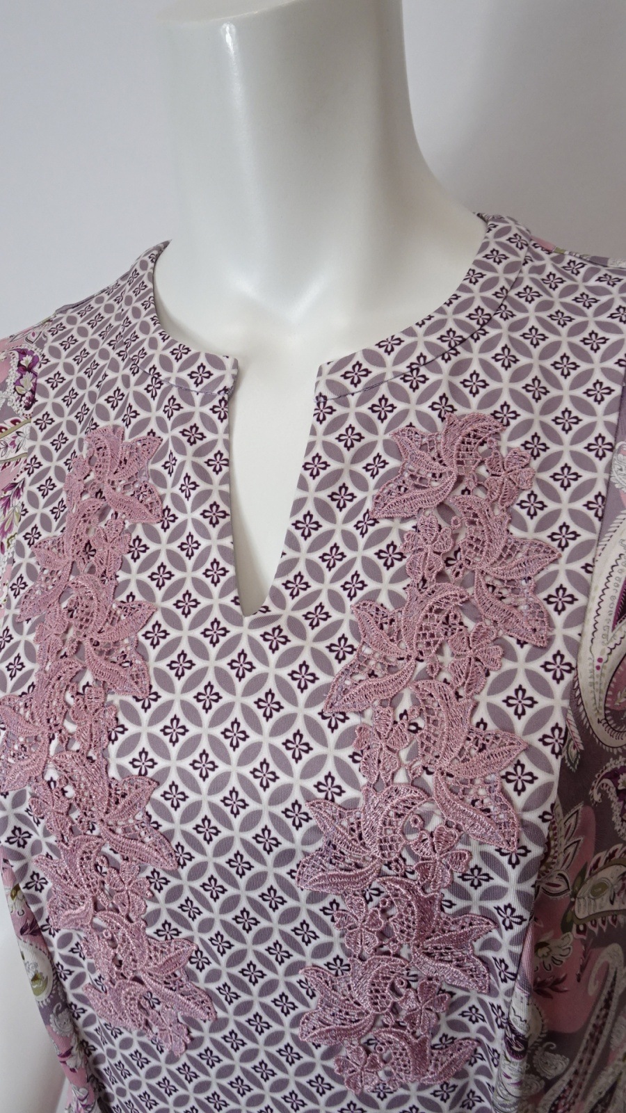 印象的なオリエンタル調のペイズリープリントに、胸元の繊細なレースとキーネックデザイン